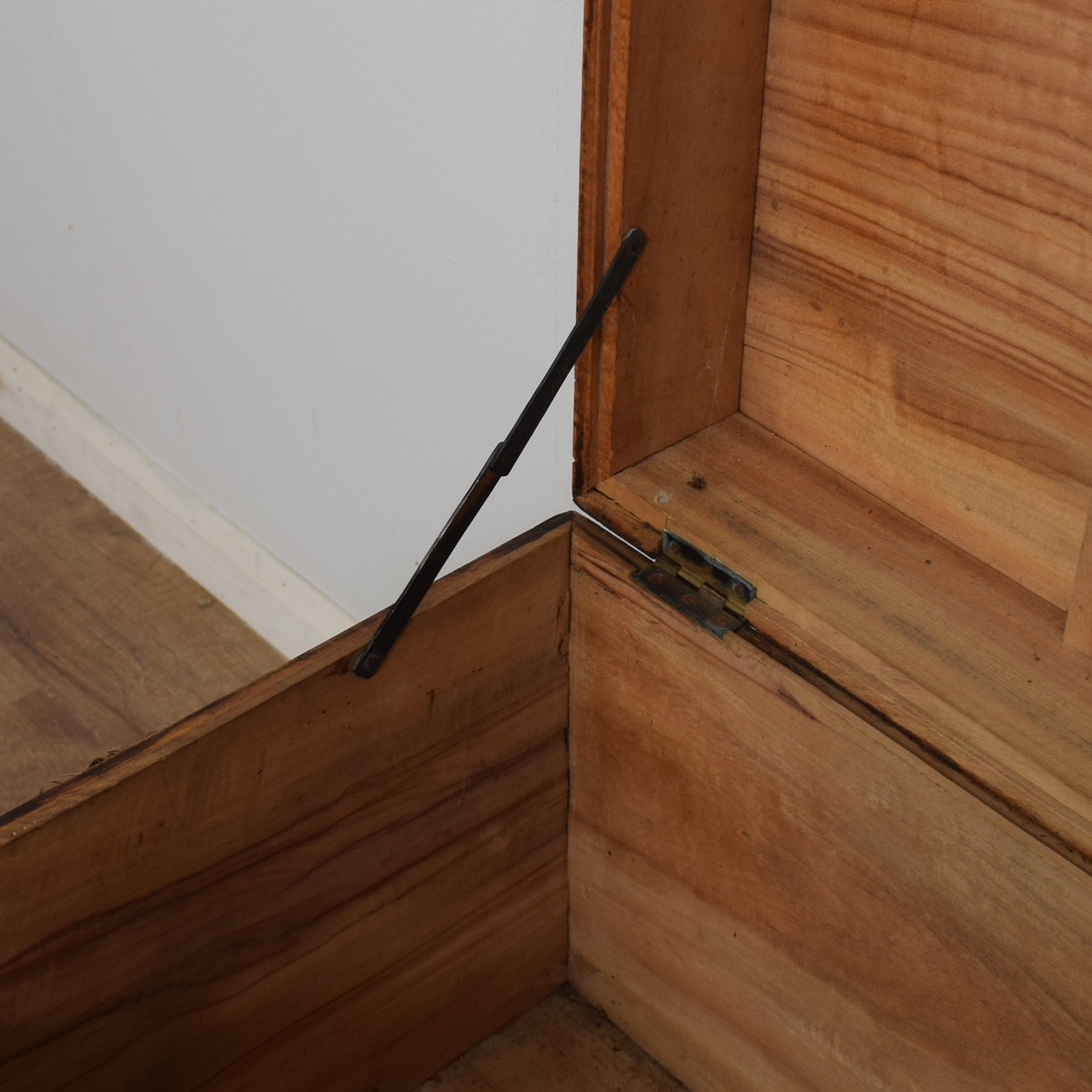 The chest’s generous interior provides ample storage space, making it perfect for storing linens, keepsakes, or other treasured items. Inside, there is a candle box fitted at the top, which provides useful storage for smaller items. There is no working lock with this chest, and the metal catch on the front is merely a decorative piece.