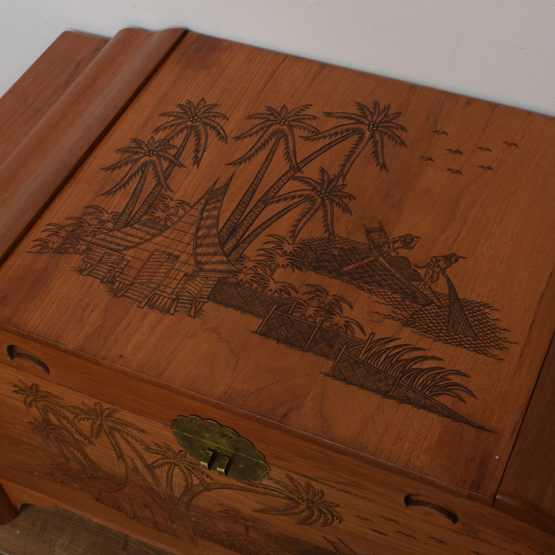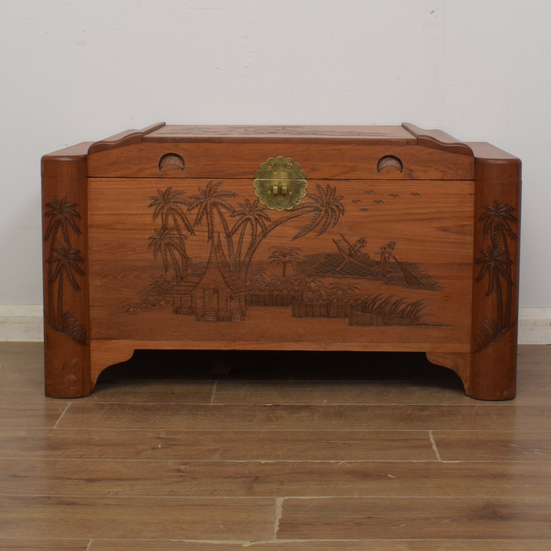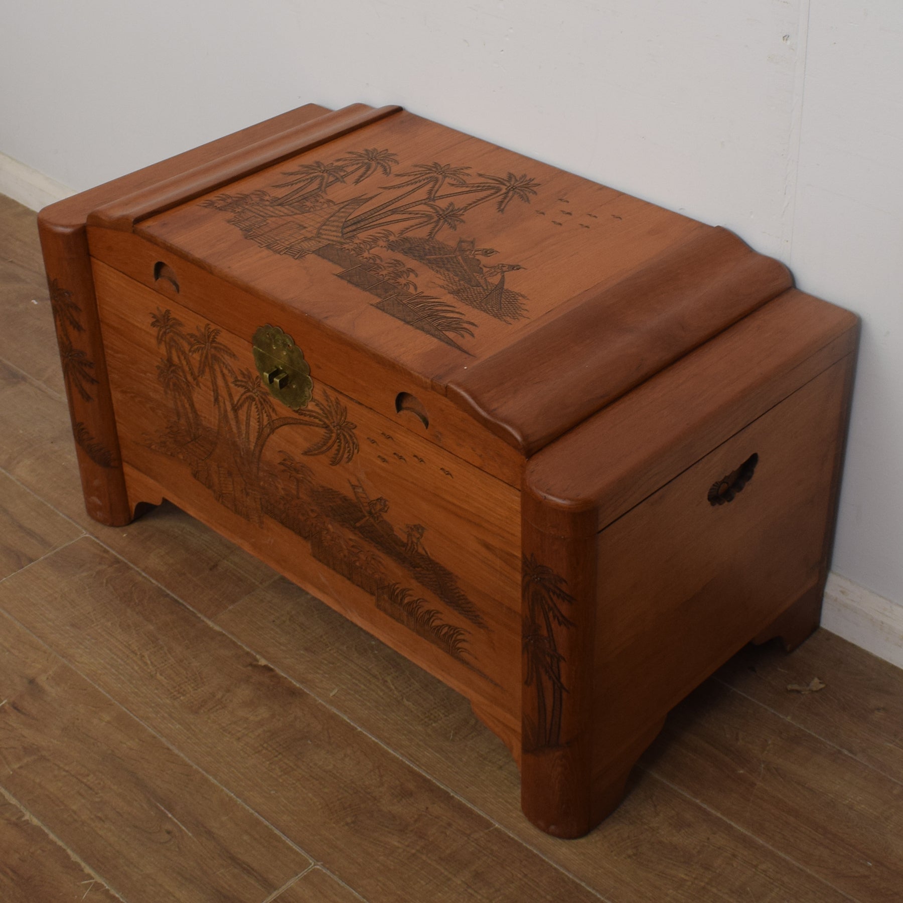 This large and sturdy camphor chest has elaborate and detailed oriental style carvings on the front and top. The lid opens to reveal the original sliding tray, for keys and smaller items, and a deep storage area, perfect for storing away blankets or towels in the bedroom or even board games in a living room or conservatory. The brass plate on the front is merely decorative, as no lock is provided.