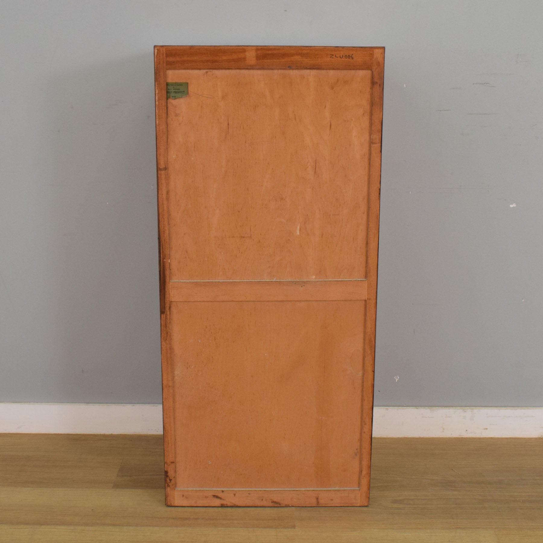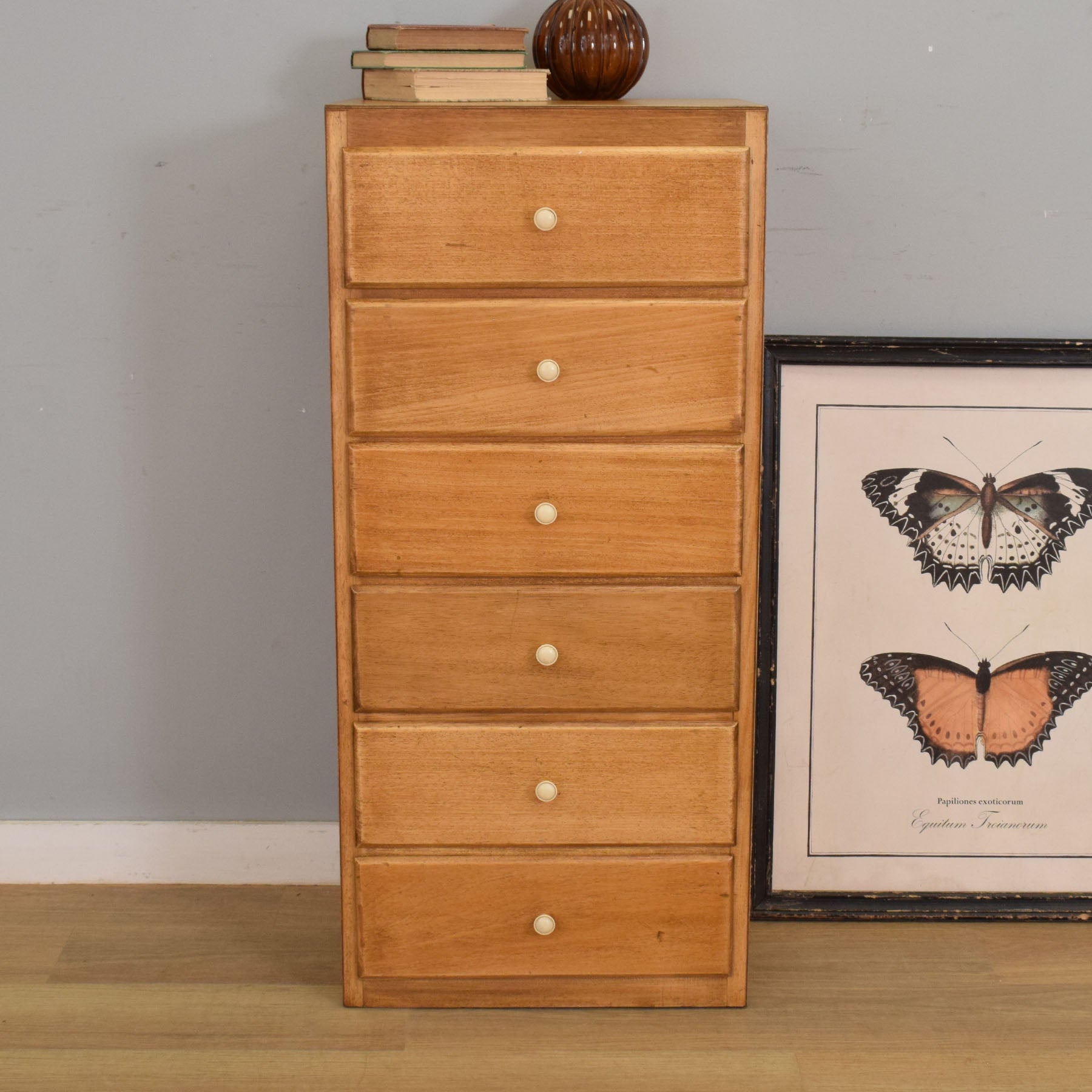 This restored tall chest features a clean, functional design with gently rounded drawer edges and classic cream knobs. The six drawers are evenly spaced and glide smoothly, ideal for storing smaller clothing items, accessories, or household essentials. Its understated, mid-century style allows it to blend easily into a range of interior settings, from minimalist to vintage-inspired.