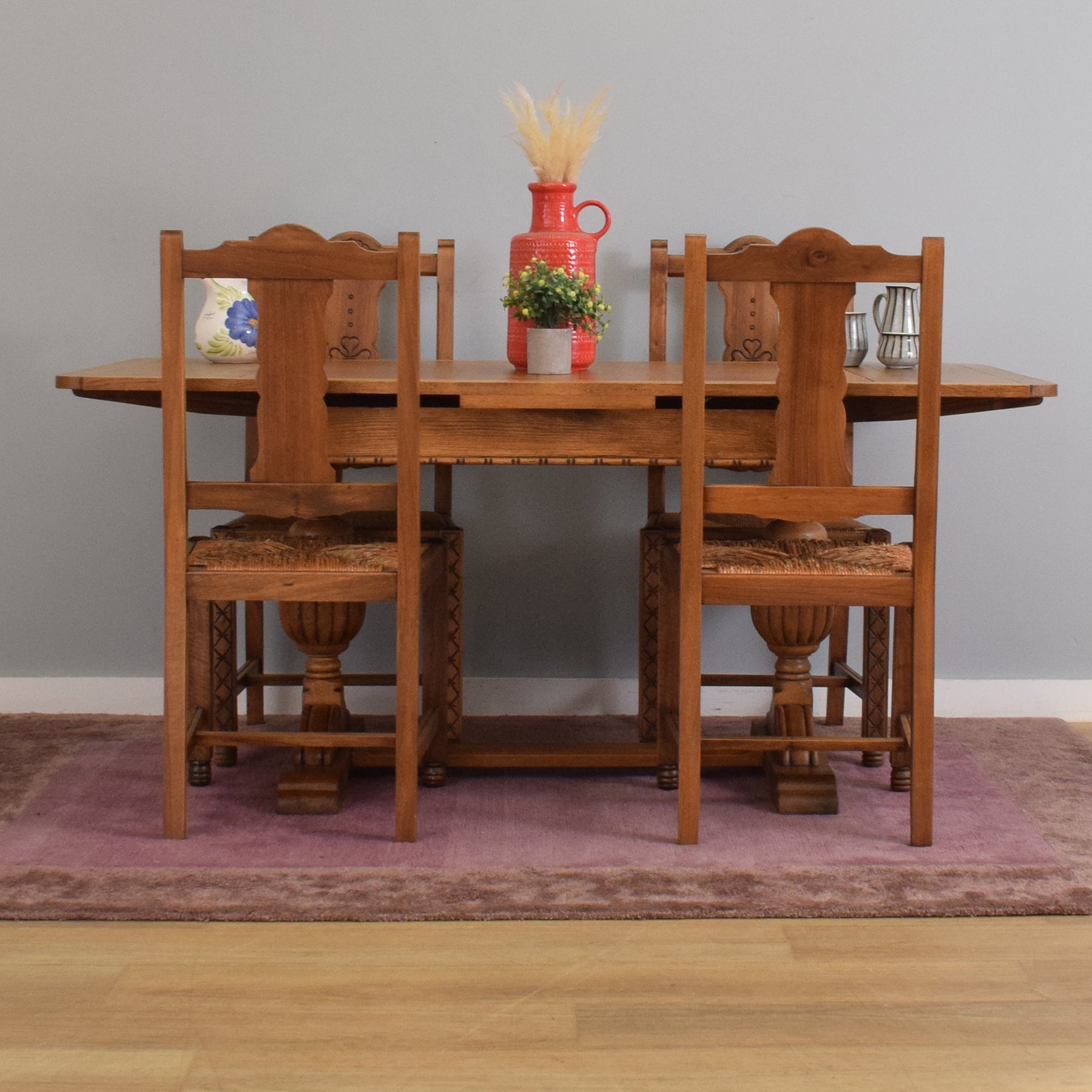 This beautifully restored dining set includes a draw-leaf table and four high-backed chairs. The table features a carved edge detail and striking bulb-turned legs connected by a stretcher base, giving it a solid and balanced presence. The top extends easily by pulling out the discreet leaf sections from either end, providing extra space when needed. The four chairs are made from solid mahogany and feature hand-carved details on the backrest and front legs, with woven rush seats adding a natural warmth to the design.