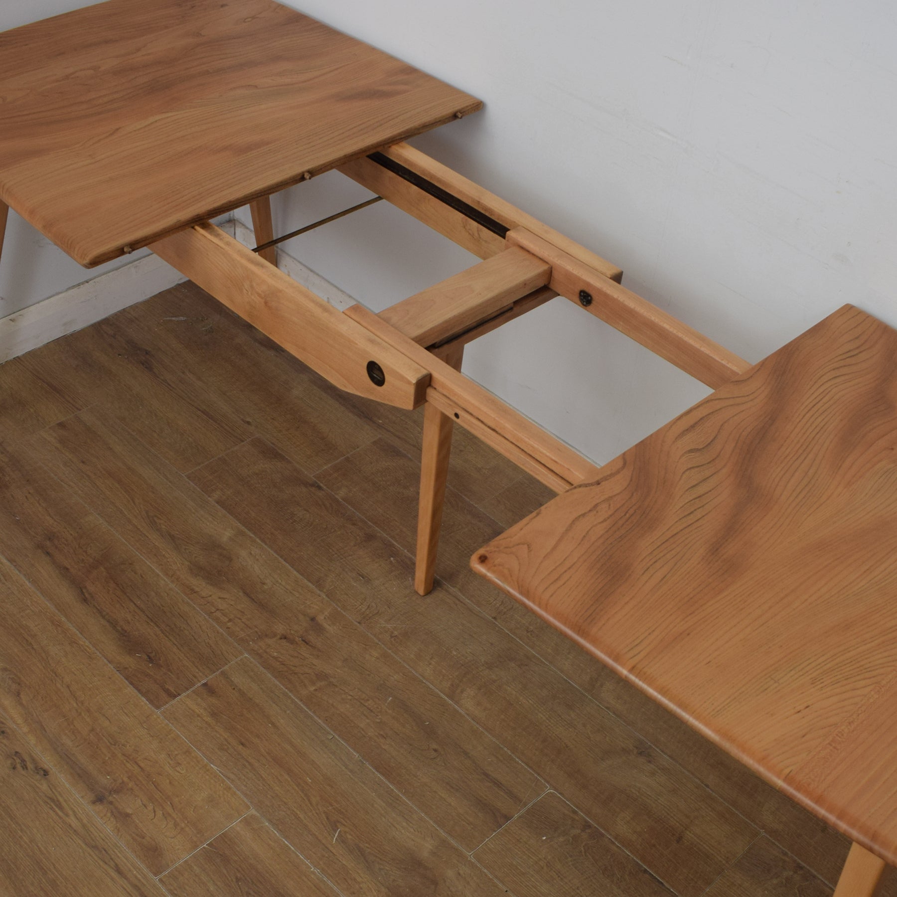 The main photograph for this set shows the table with the extension leaf in place and all eight chairs. We have included photographs to show how the table looks without the extension and with just six chairs. Extended or closed, it has a bolt-locking device for complete rigidity. Both bolts are included. The chair seats are made from solid elm with beech legs and chair backs.
