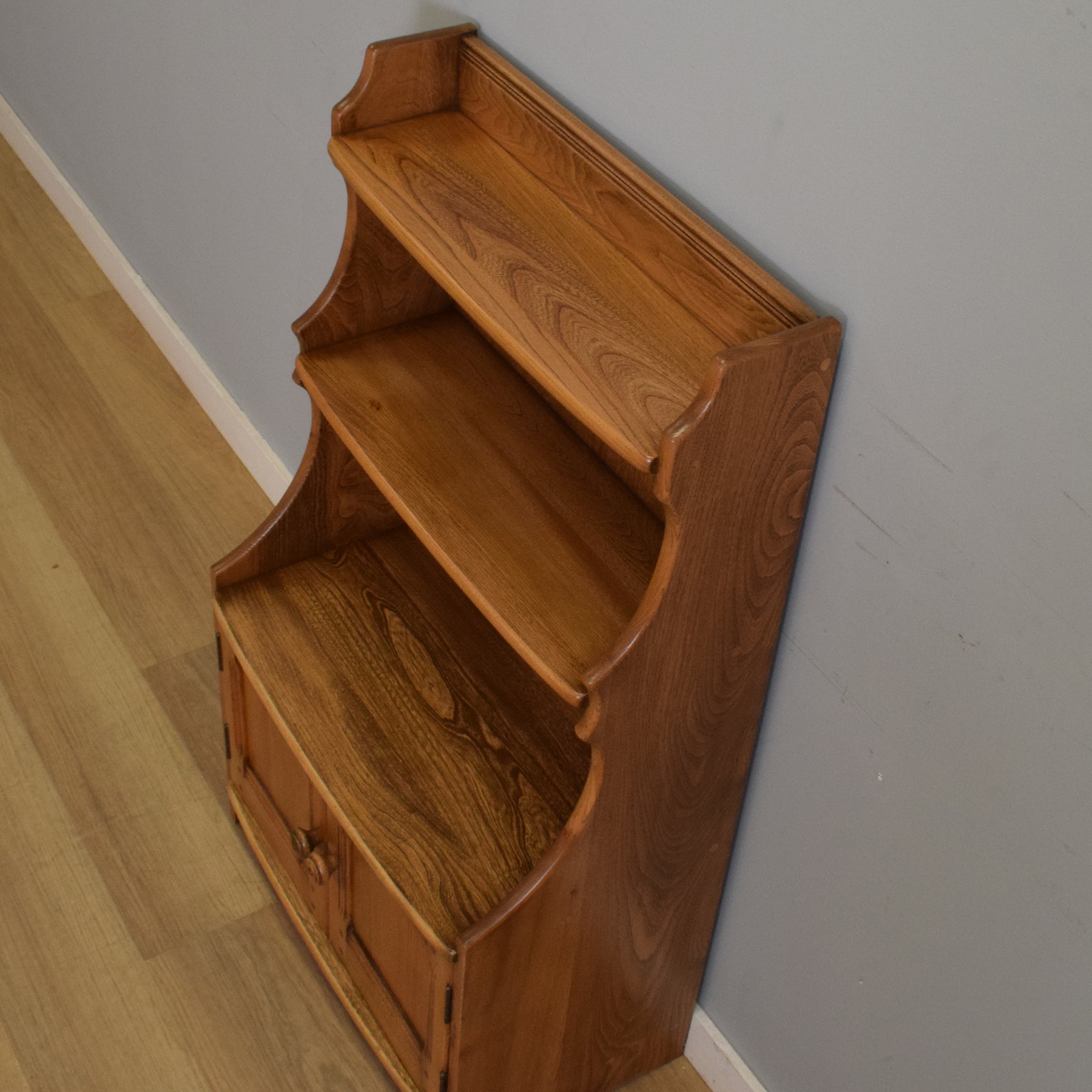 This elegant bookcase features Ercol’s signature curved “waterfall” edges, with two fixed open shelves above a spacious double-door cupboard, offering a balance of display and concealed storage. The piece showcases the distinctive grain patterns of elm throughout, particularly on the top and side panels, while rounded edges and turned wooden handles add a touch of classic charm. The cupboard doors open to reveal a generous internal compartment, ideal for tucking away books, office supplies, or other household items.