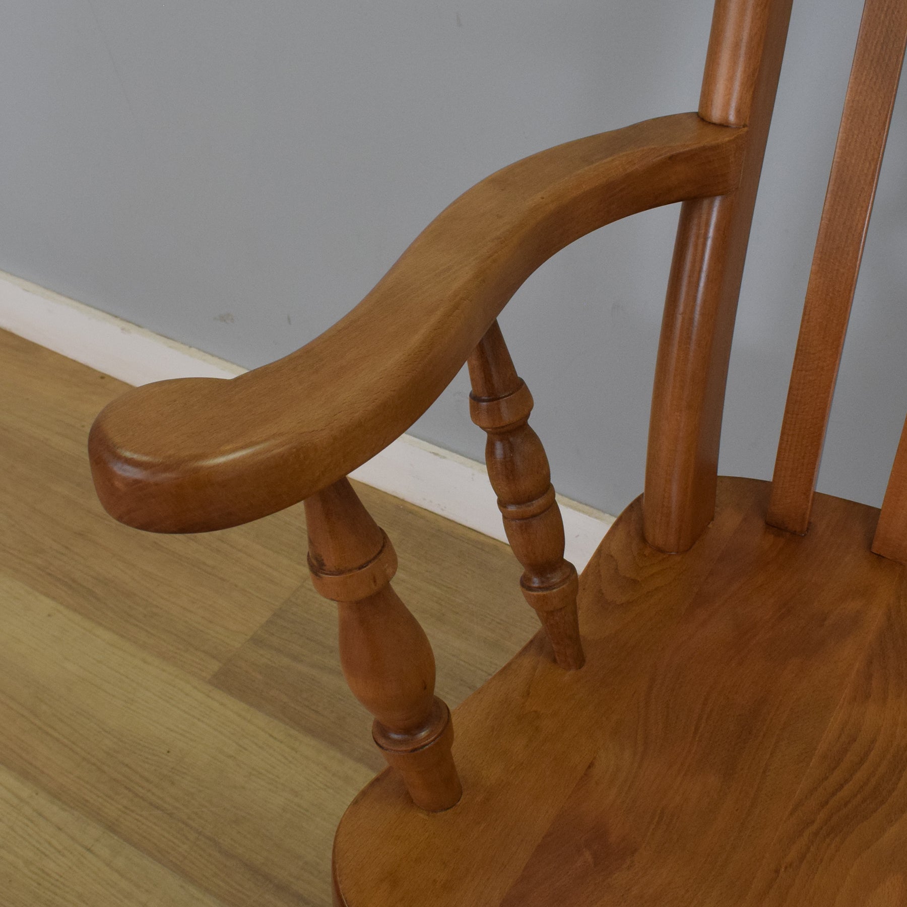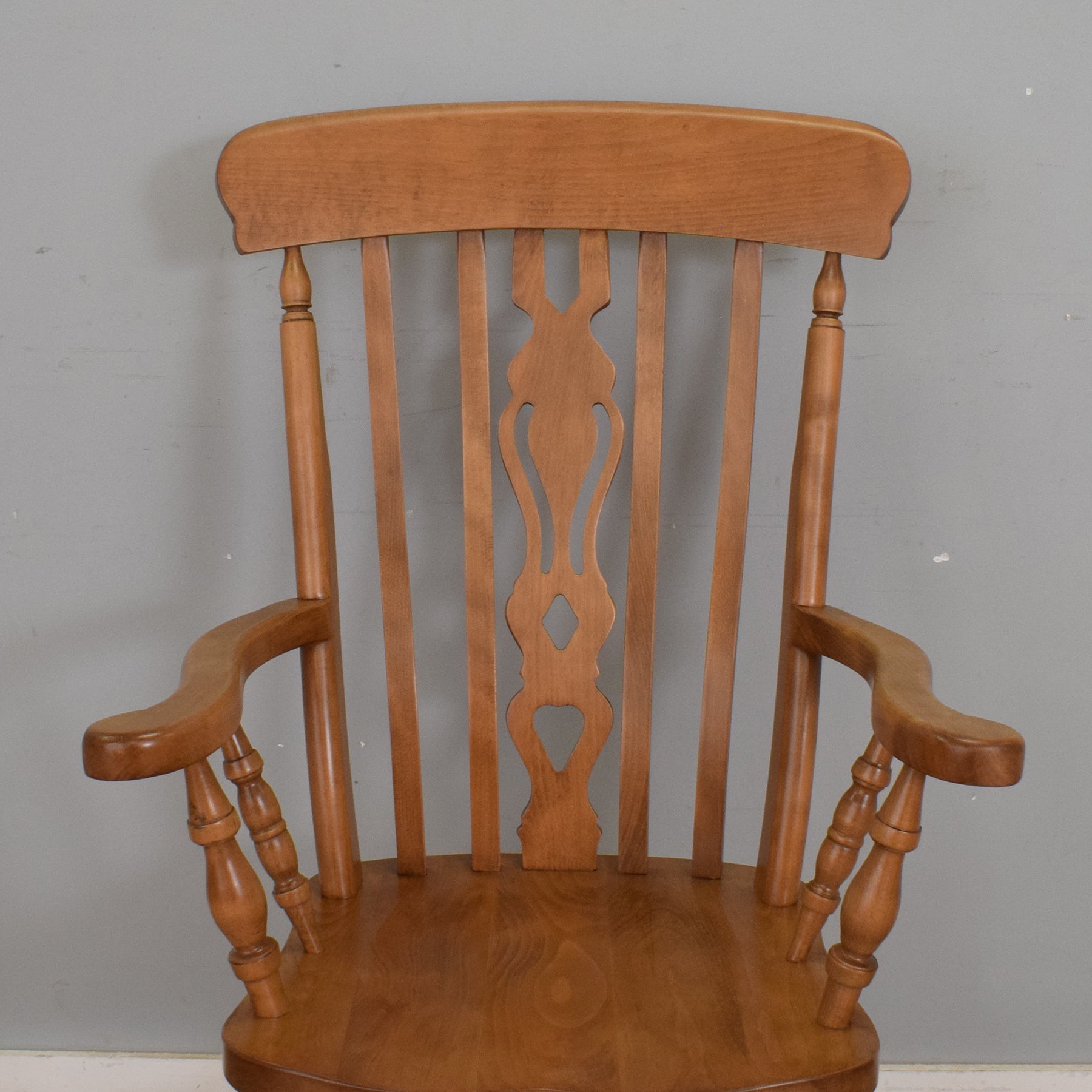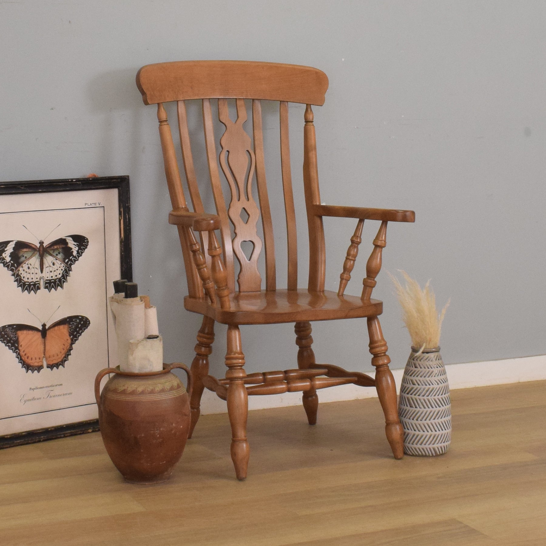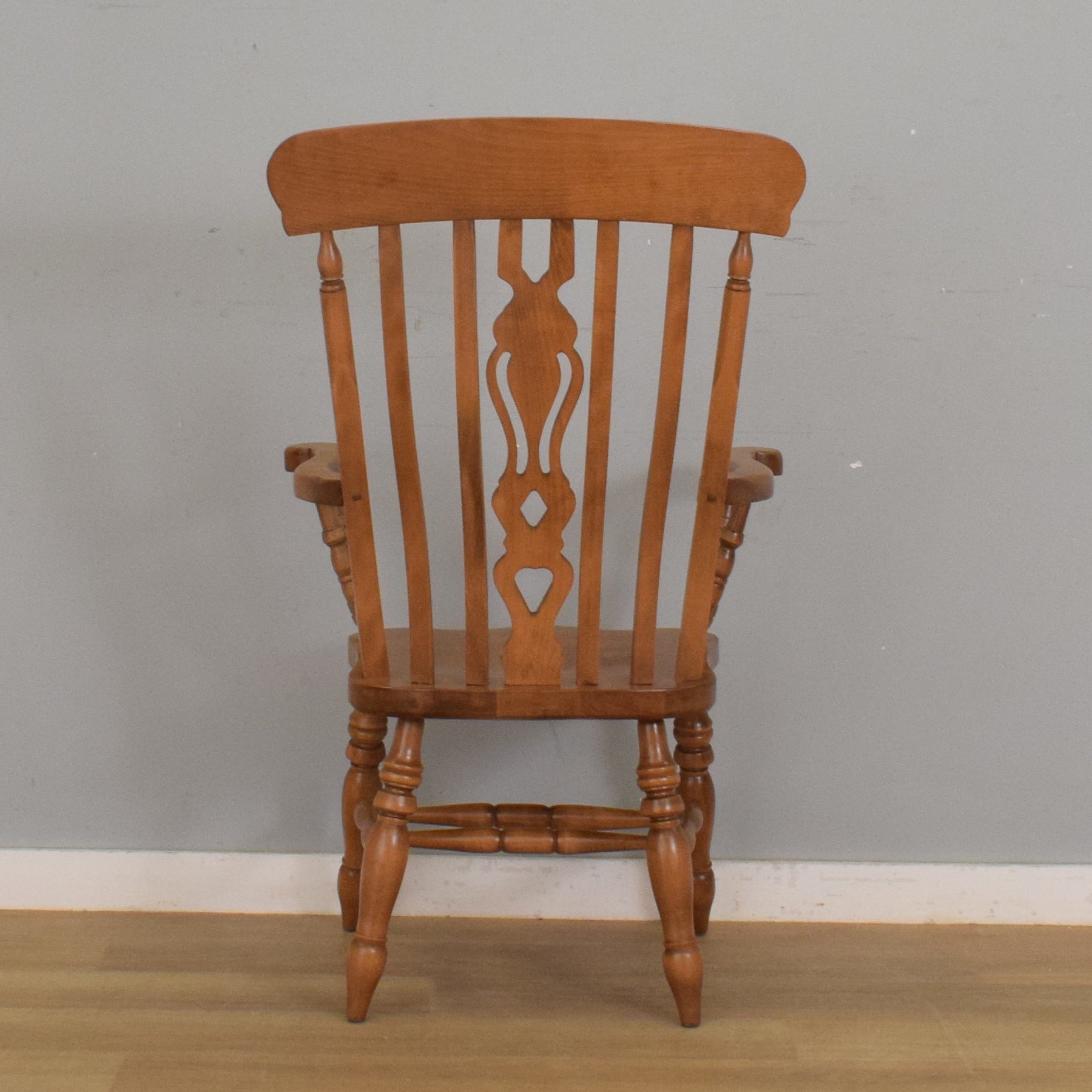 This farmhouse-style carver chair features supportive arms, a shaped top rail, and a classic spindle back with a decorative central splat. The solid seat and turned legs give it a sturdy, traditional look, while the stretcher base adds strength and stability for everyday use.