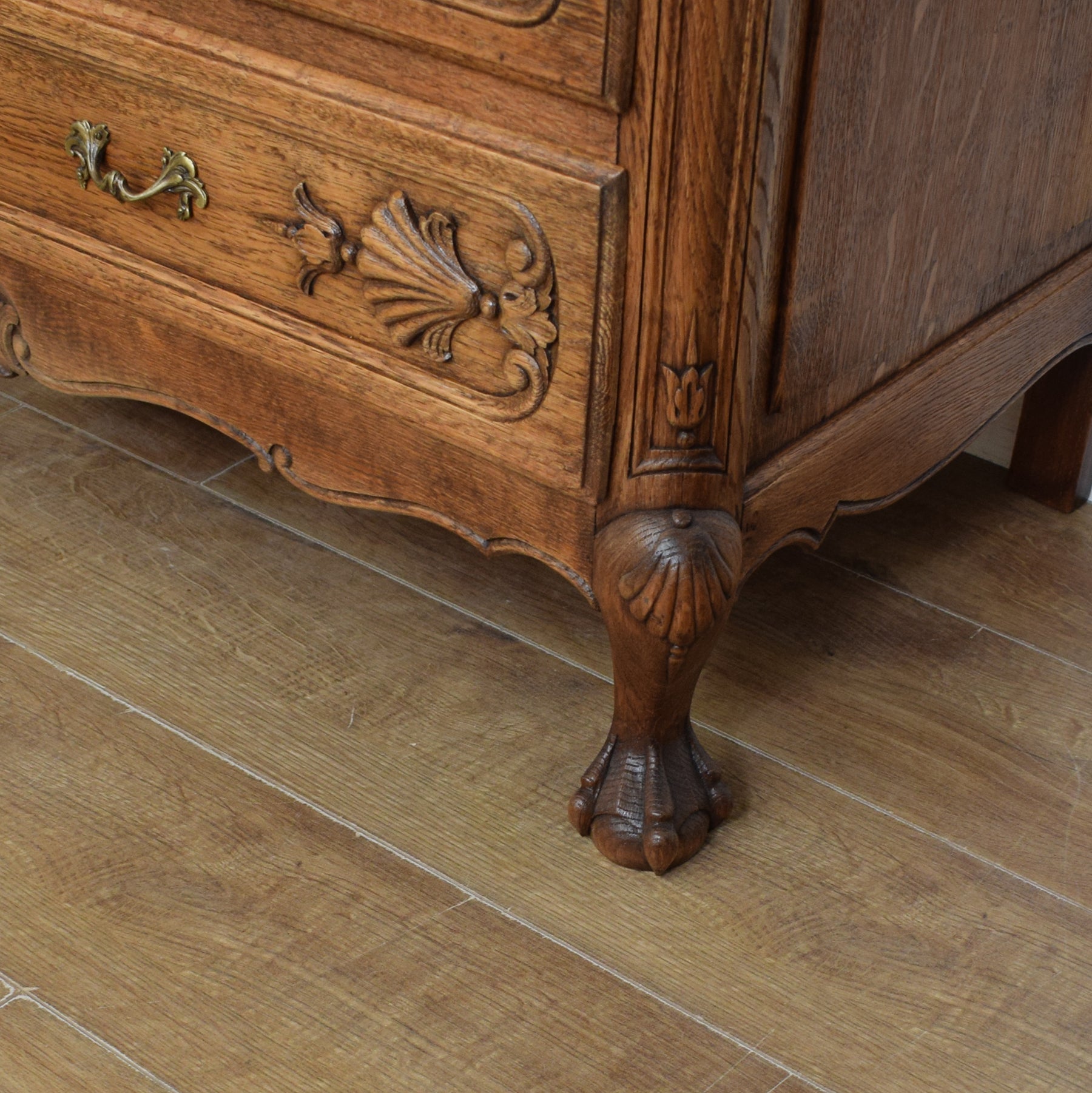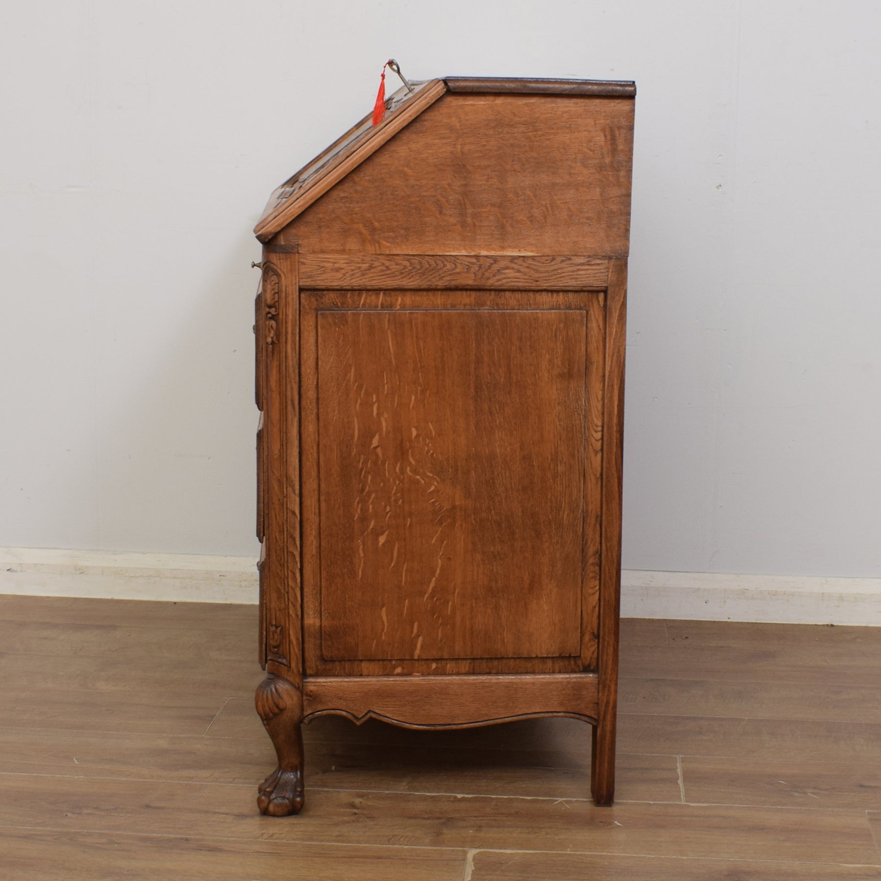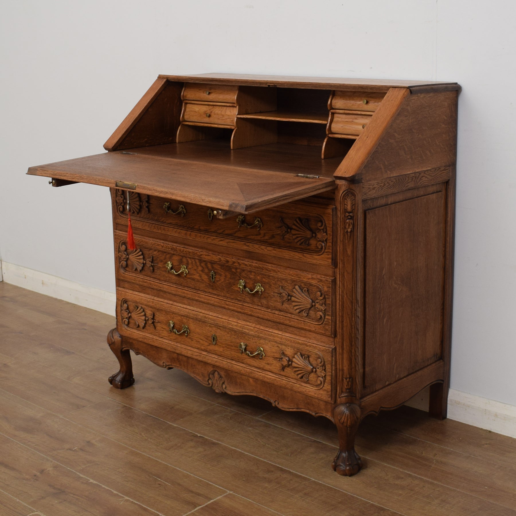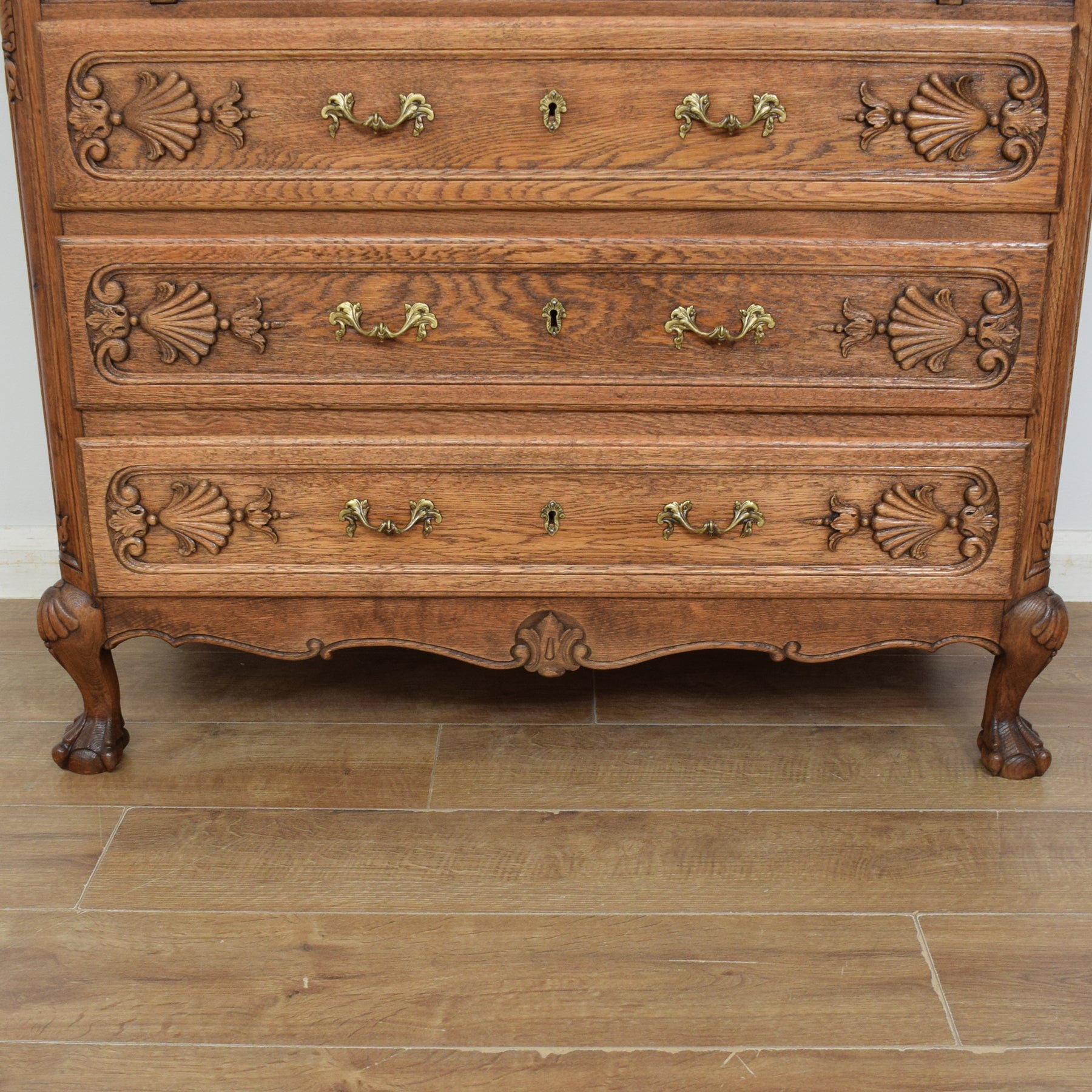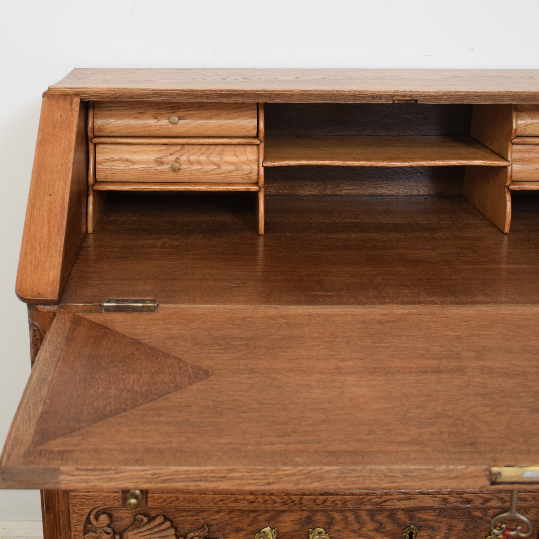 The bottom of this piece offers further storage with three drawers. The beautiful wood carvings right across this piece add to its character and appeal. The curvaceous legs are typical of the French styling this bureau exudes. There are two support struts for the desktop which must be manually pulled out to create a stable work base. There are no keys for the drawers.