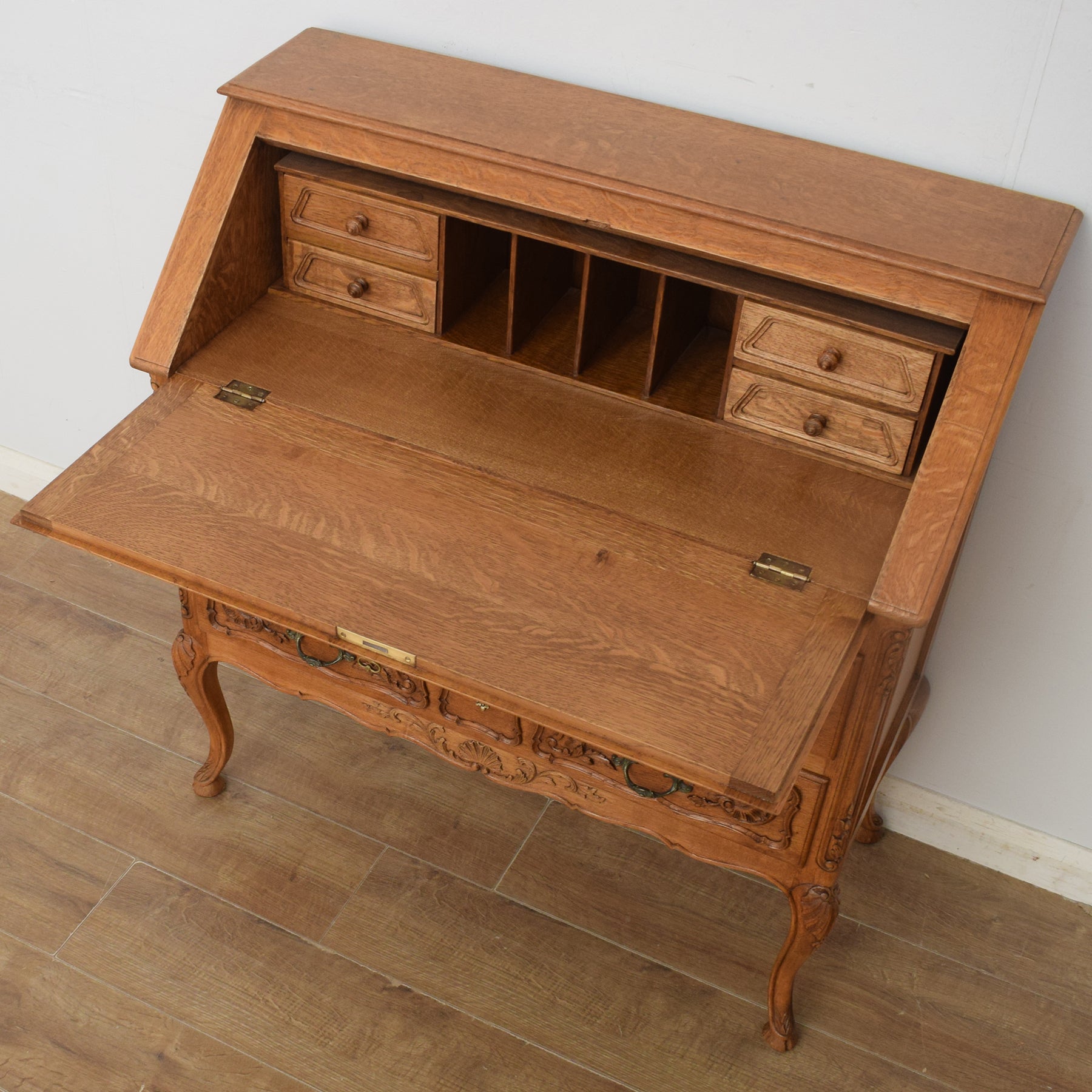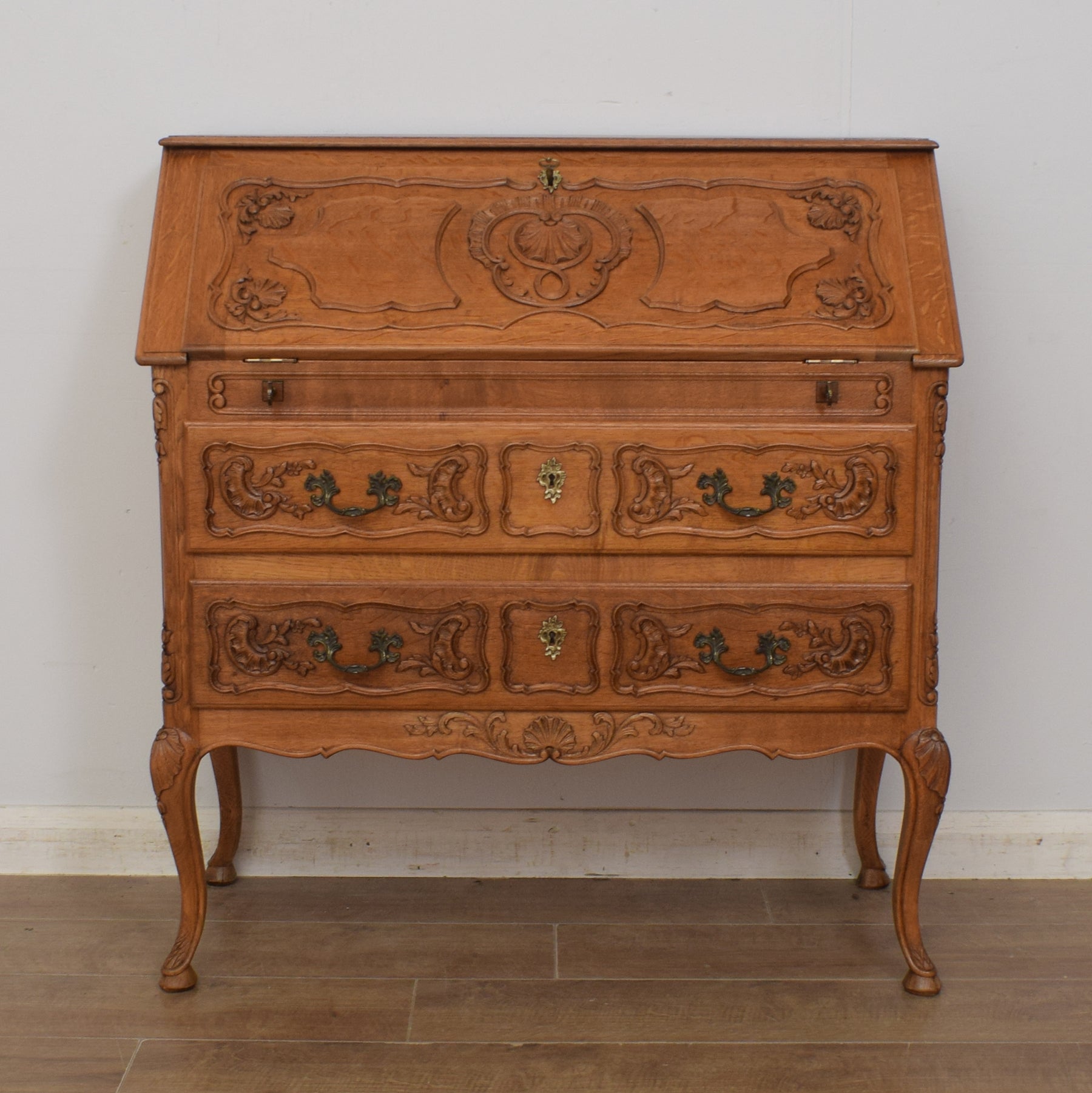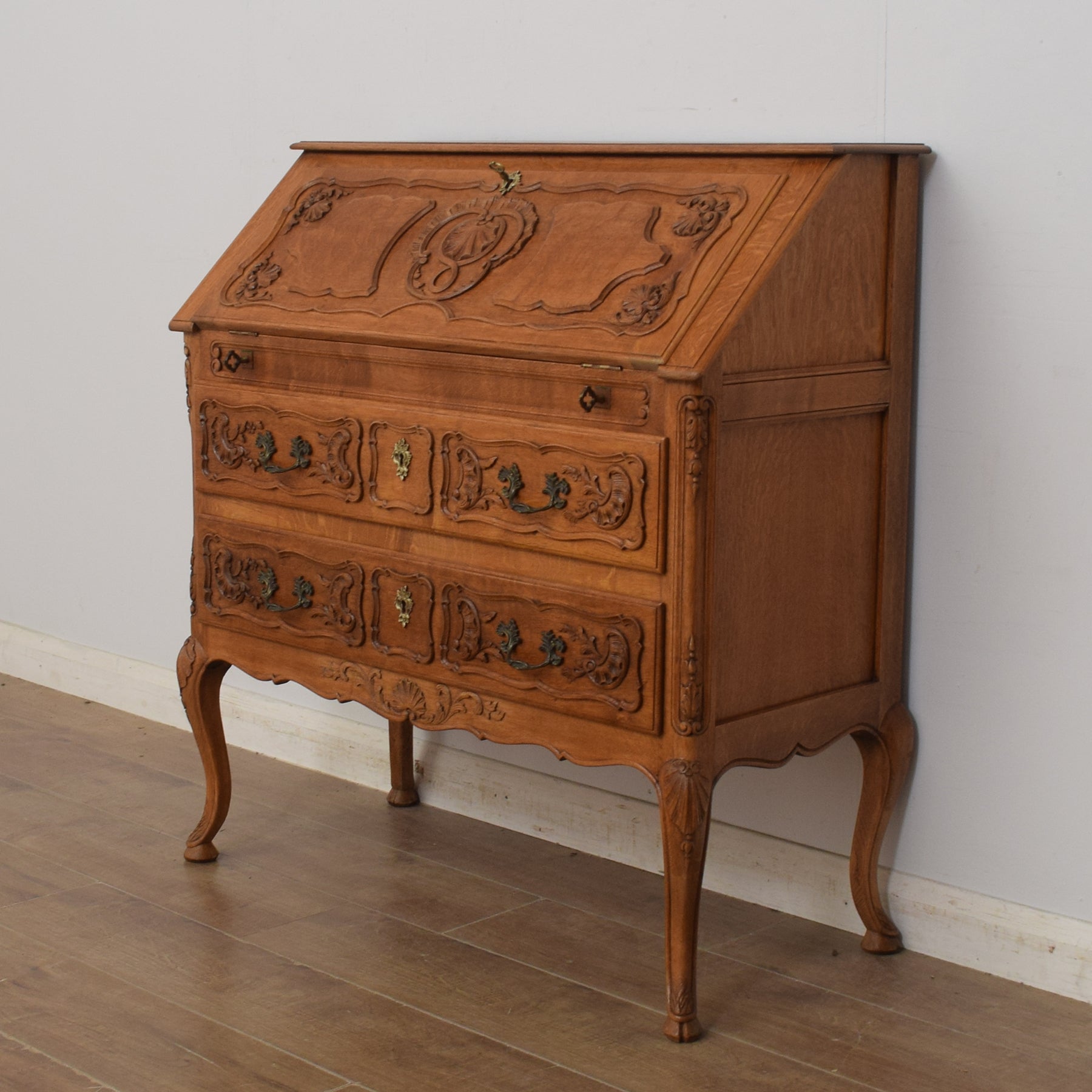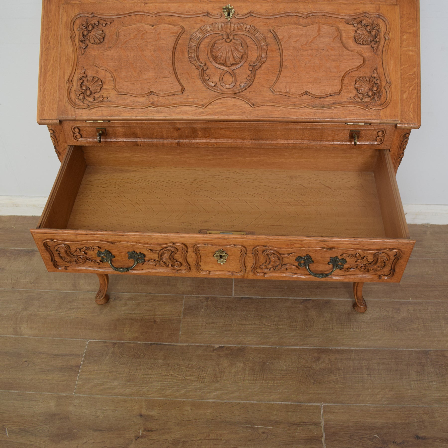 The bottom of this piece offers further storage with two drawers. The beautiful wood carvings right across this piece add to its character and appeal. The curvaceous legs are typical of the French styling this bureau exudes. There are two support struts for the desktop, which must be manually pulled out to create a stable work base.