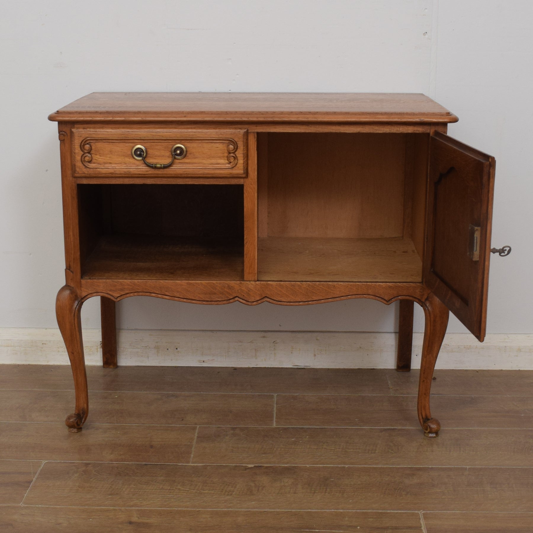 The piece features a single cupboard, to the right, and a single drawer, on the left, above and an open display shelf —perfect for showing off decorative items or keeping essentials within easy reach. The drawer is adorned with a decorative brass-style pull, and delicately carved scrollwork. The cupboard door has an attractive escutcheon and one key is provided. The cabriole legs and shaped apron add to the cabinet’s graceful silhouette, while the mellow tones of the wood lend a natural, understated appeal.