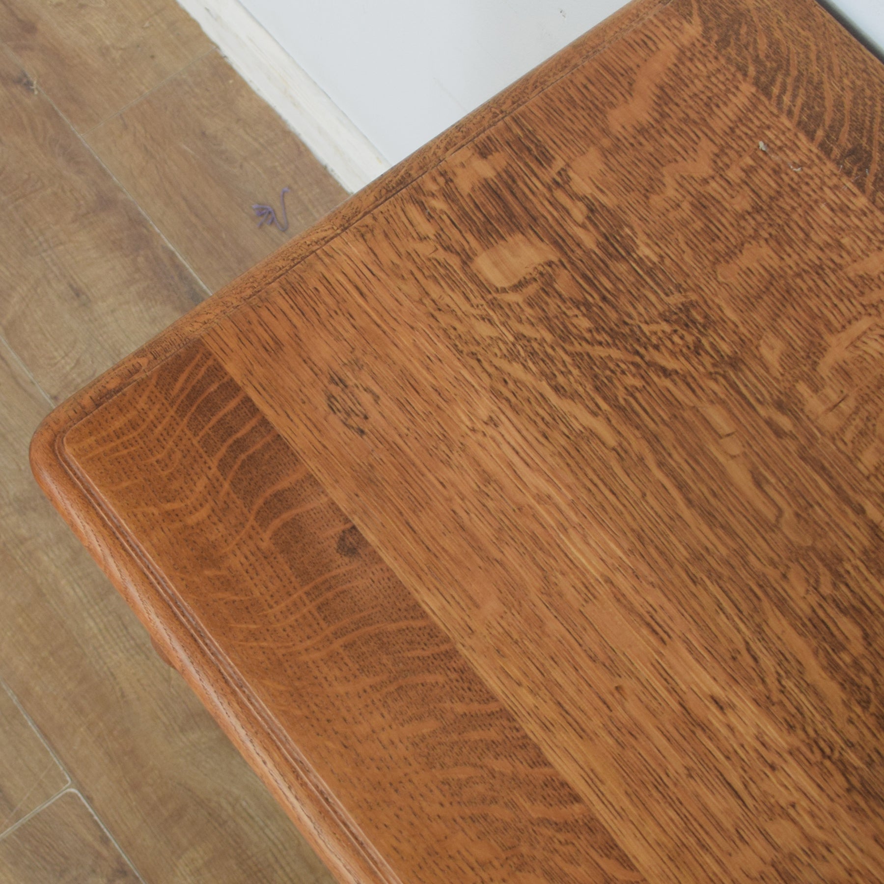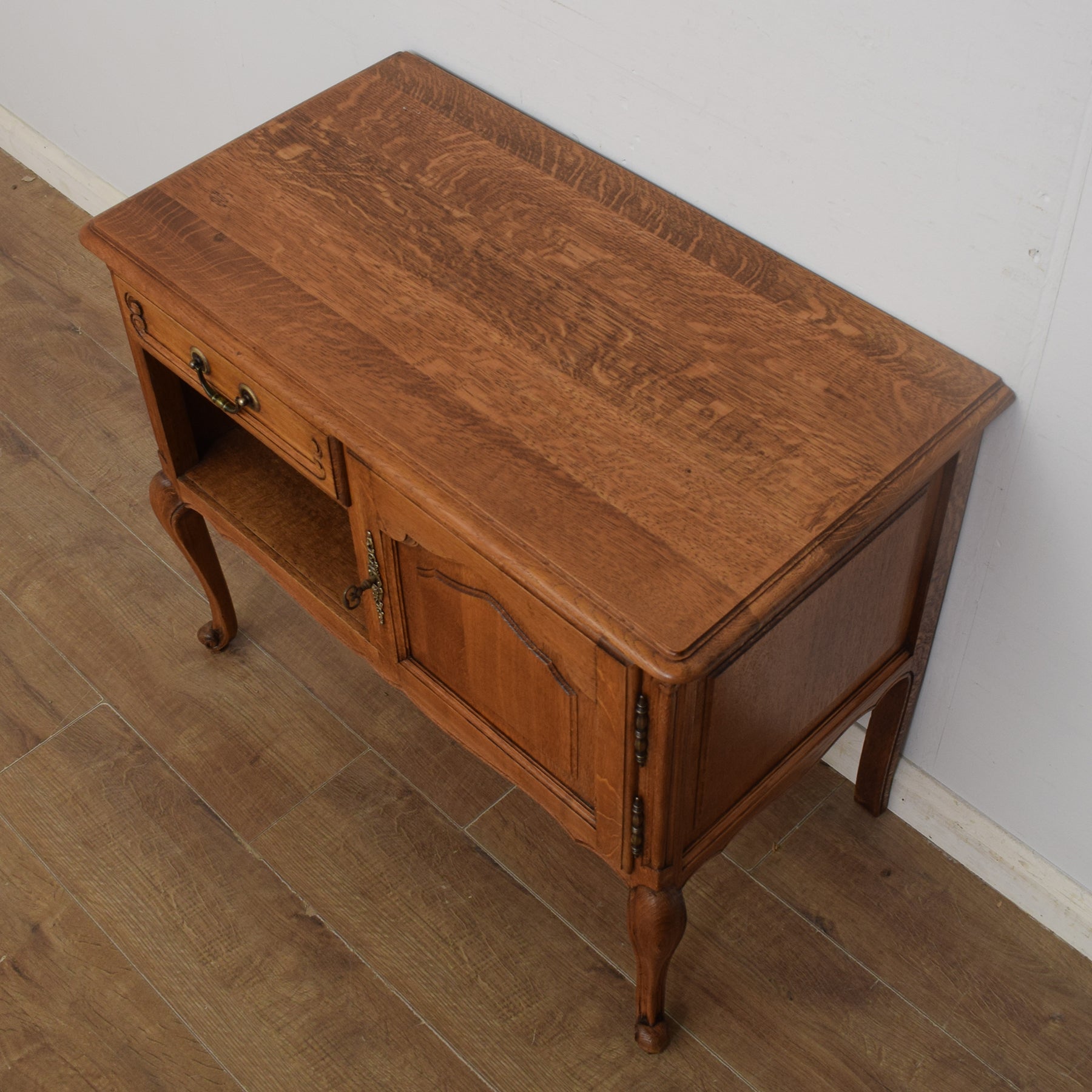 The previous darker finish has been carefully stripped, and multiple coats of hard-wearing matte lacquer have been applied. This not only enhances the oak grain but also provides a durable, long-lasting surface. The cabinet is constructed from a mixture of oak and oak veneer, while the back, the base and drawer sections are made from plywood.