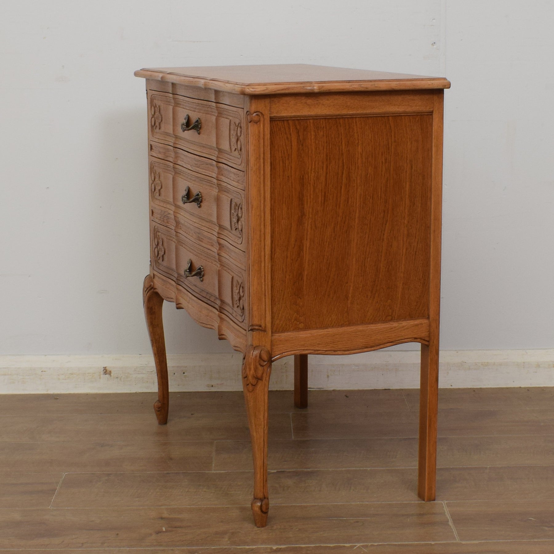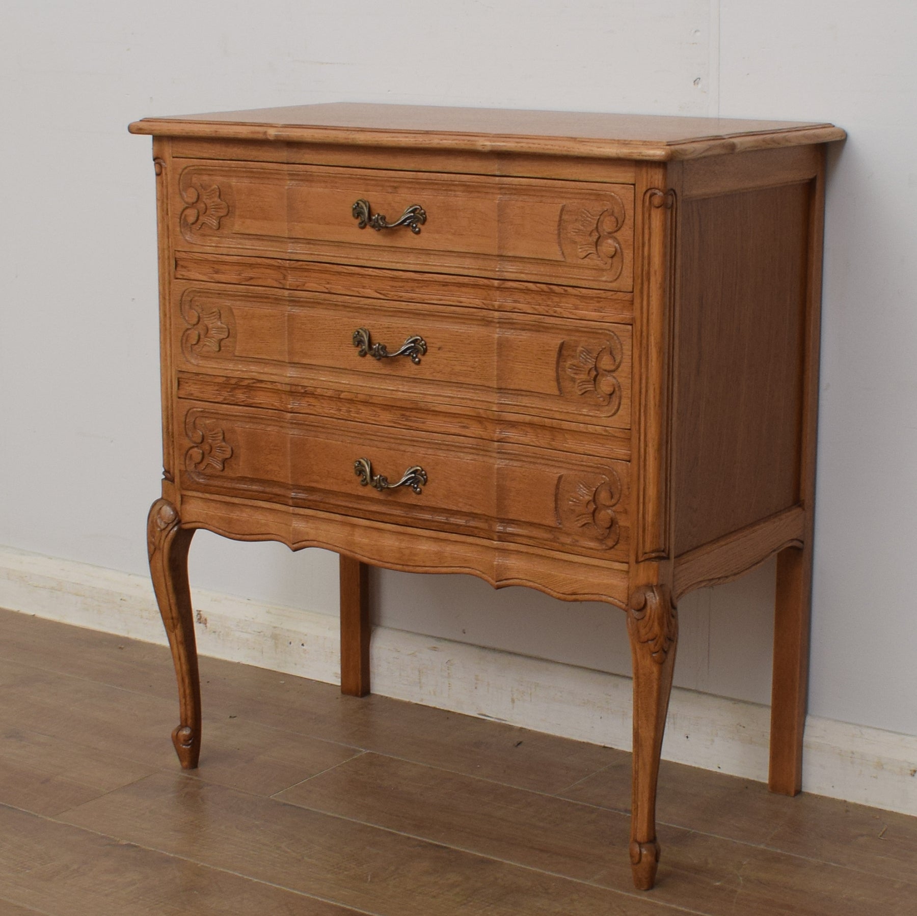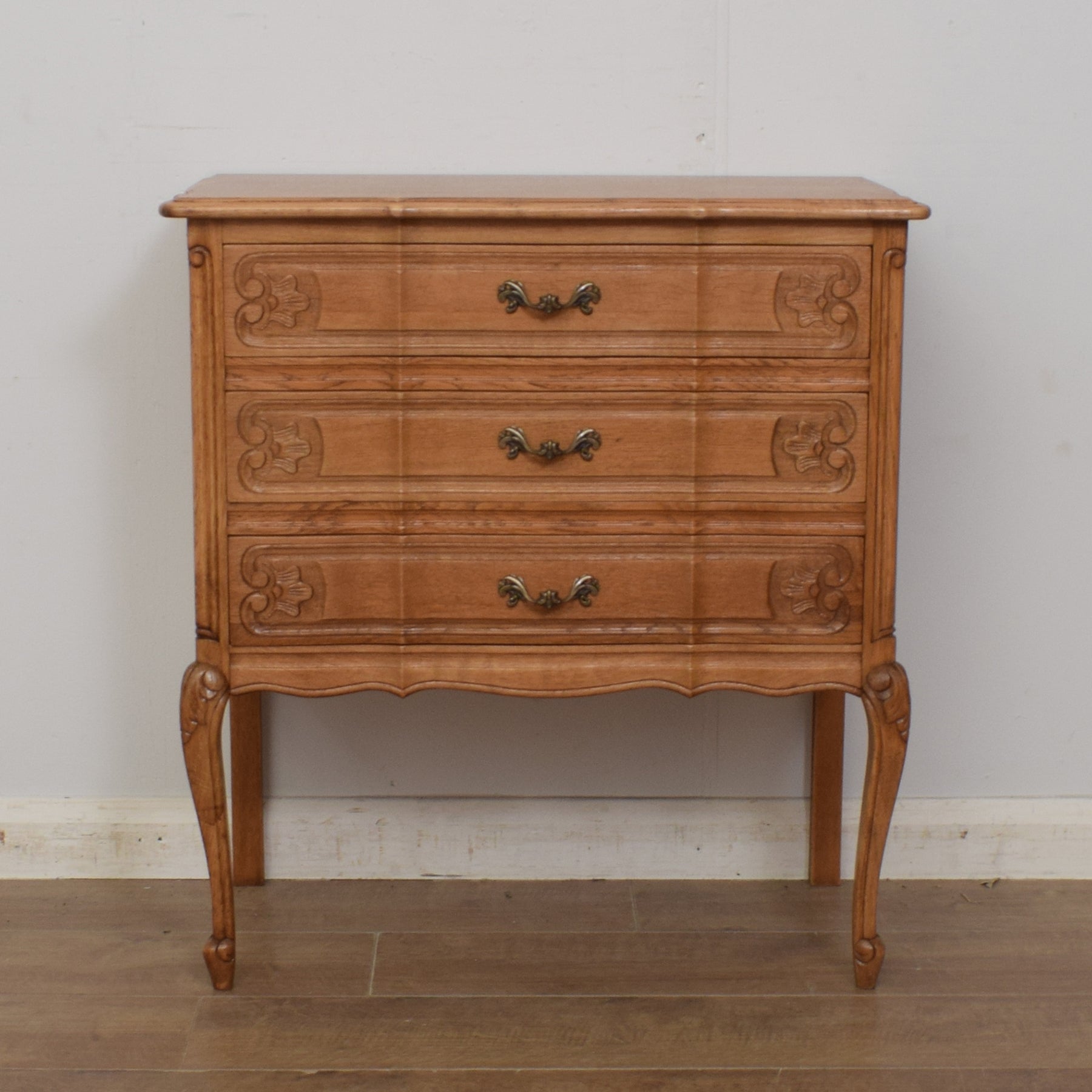 This delightful oak French-style 3-drawer chest would make a great addition to any home and is both practical and full of unique character.