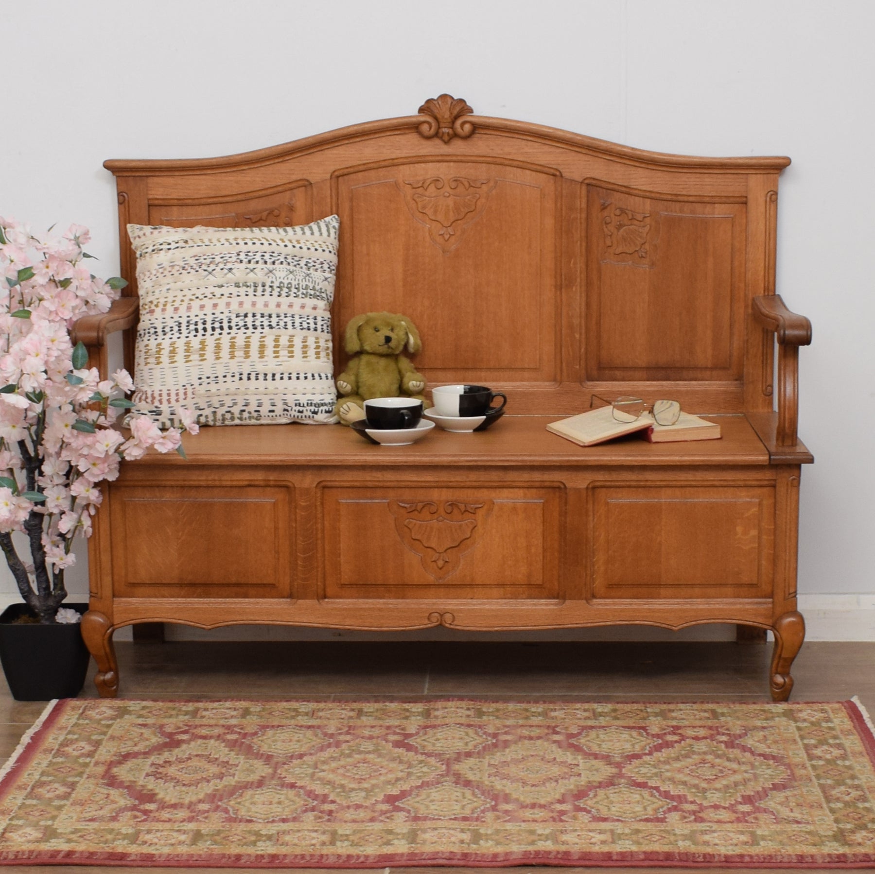 This traditional piece of furniture is very practical and can be used as both a bench and a storage box for all those 'out of sight' items. Underneath the seat is a spacious storage compartment, perfect for storing away bags, boots, toys and games. The beautiful carvings and curvaceous backrest, along with the rich golden tones, give this item a very appealing look.
