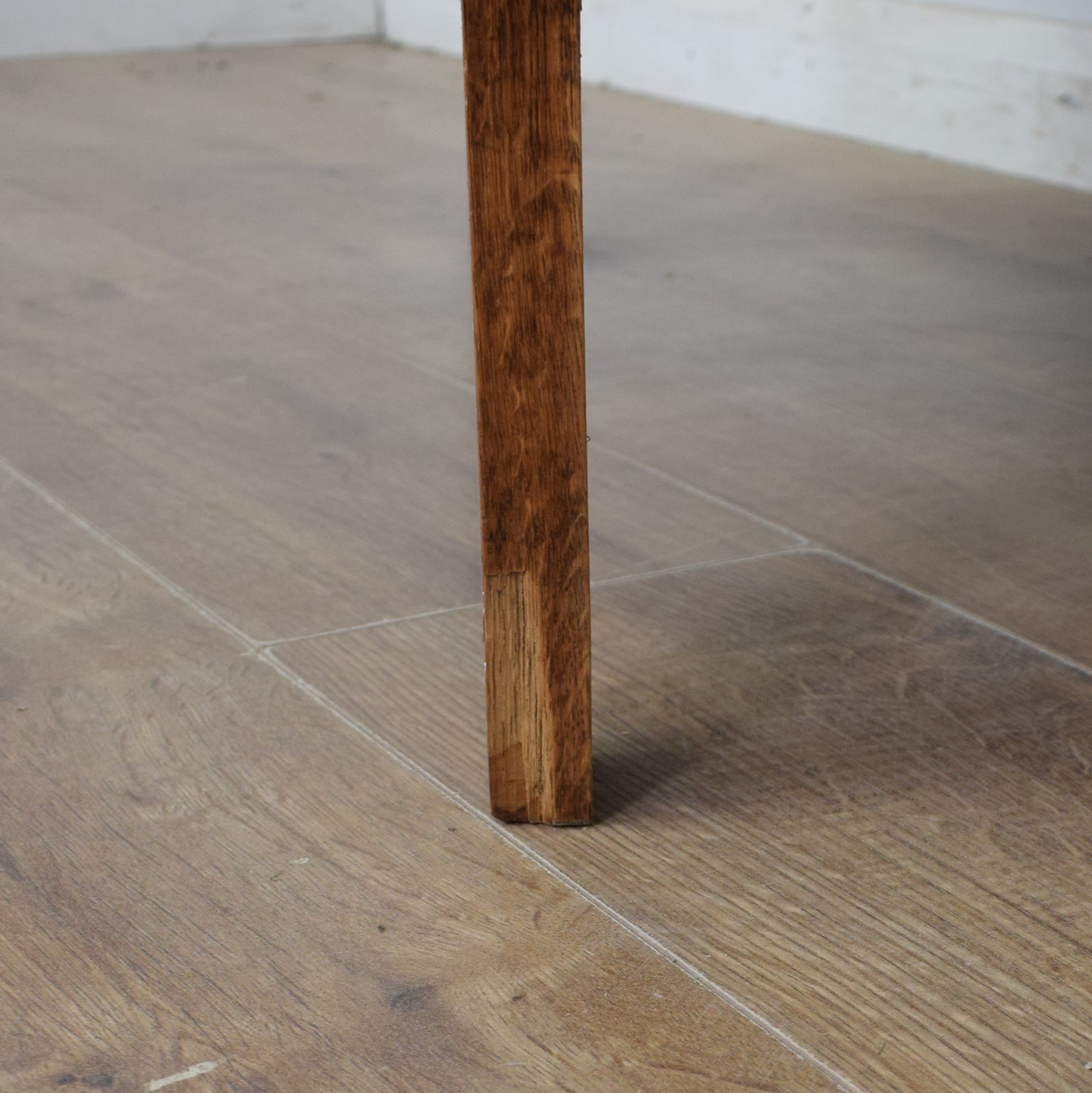 The previous finish has been stripped, and multiple coats of hard-wearing matte lacquer have been applied, creating a durable, long-lasting surface while enhancing the natural wood grain. There is a small dent in the top surface and a chip to one of the back legs, which can be seen in the photographs. These are minor imperfections and do not detract from the overall use of this piece. This item has been made using a mixture of solid oak and oak veneer.
