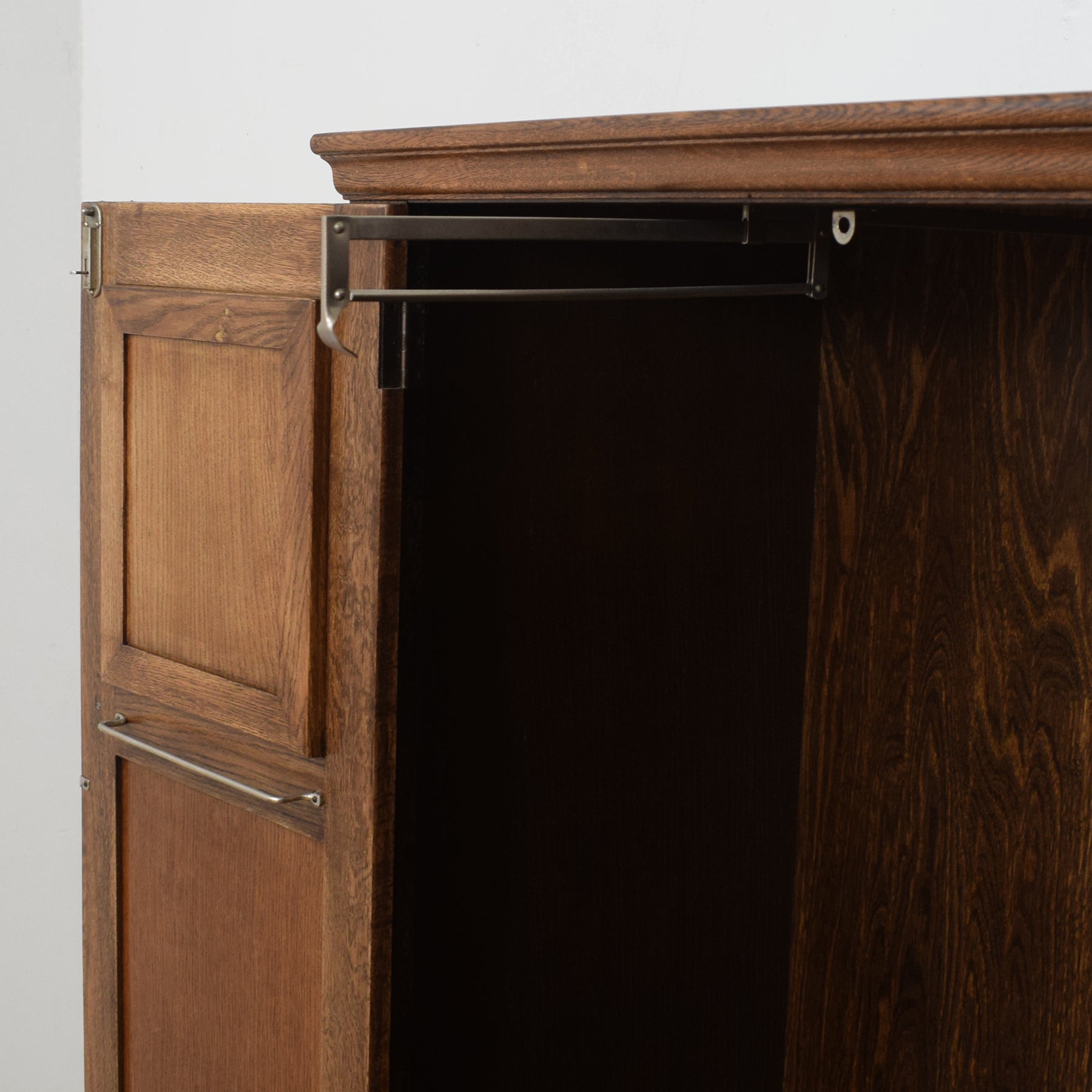 Our restoration workshop has stripped and cleaned this wardrobe before applying a matt lacquer finish that provides a good level of day-to-day protection as well as accentuating the colour and grain of the wood. The wardrobe is made from a mixture of woods, with some solid oak and some veneer panels. The back and shelves are plywood.