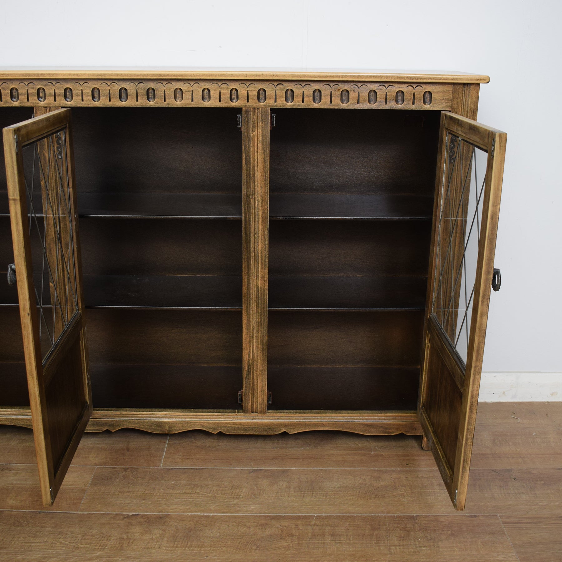 The cabinet features three leaded-glass glazed doors, each with a lower solid panel. The top edge is adorned with a carved border, adding a touch of craftsmanship to its simple form. Inside, the two fixed shelves and the base shelf provide ample space for books, display items, or tableware, while the glazed sections offer an attractive way to showcase favourite pieces. The dark metal drop-ring handles and decorative hinges complement the warm wood tones perfectly.