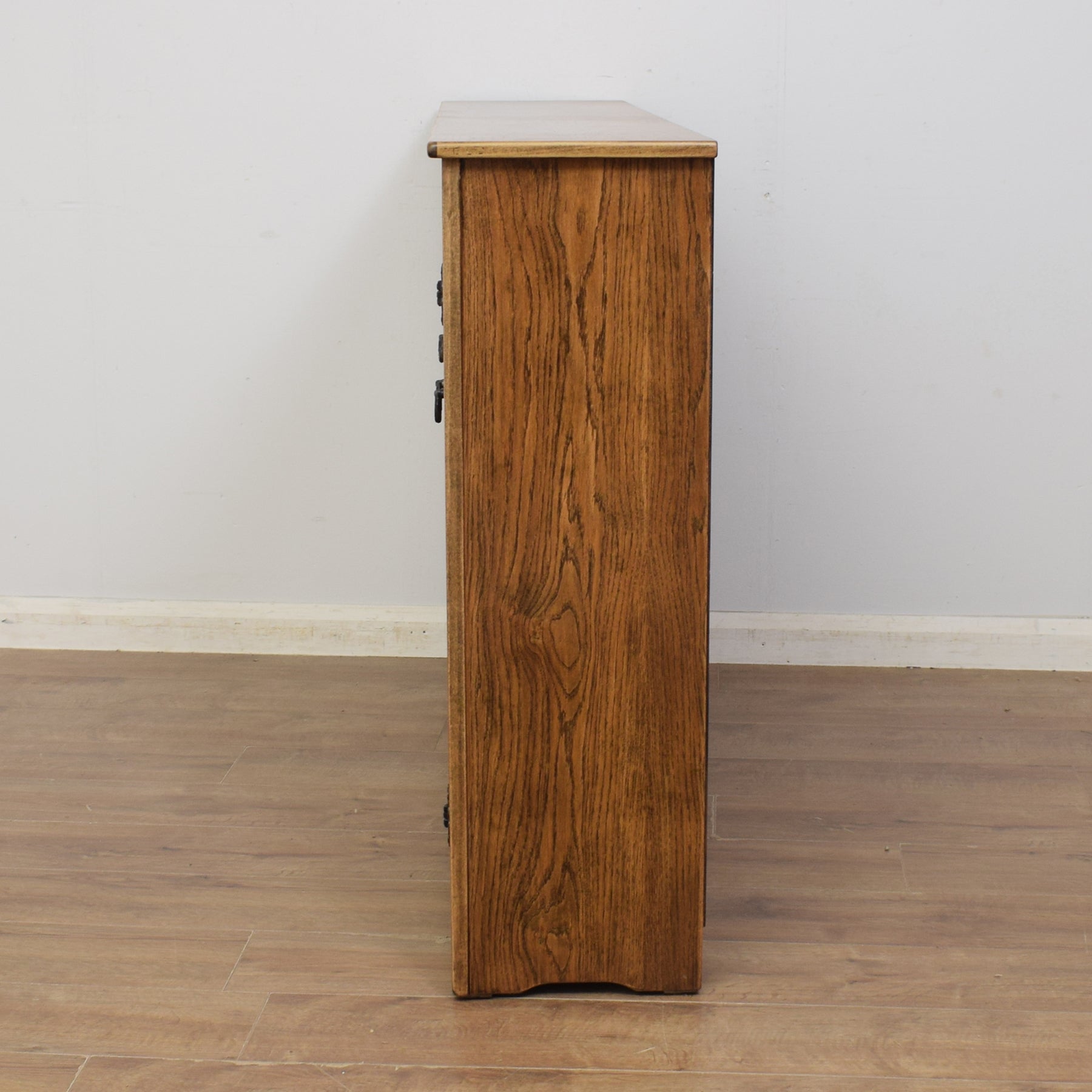 The item has been stripped of its previous finish and treated with multiple coats of hard-wearing matte lacquer, enhancing the natural beauty of the oak grain while offering a durable and easy-to-maintain surface. This item is constructed from a mixture of woods: solid oak, veneer panels and plywood for the back.