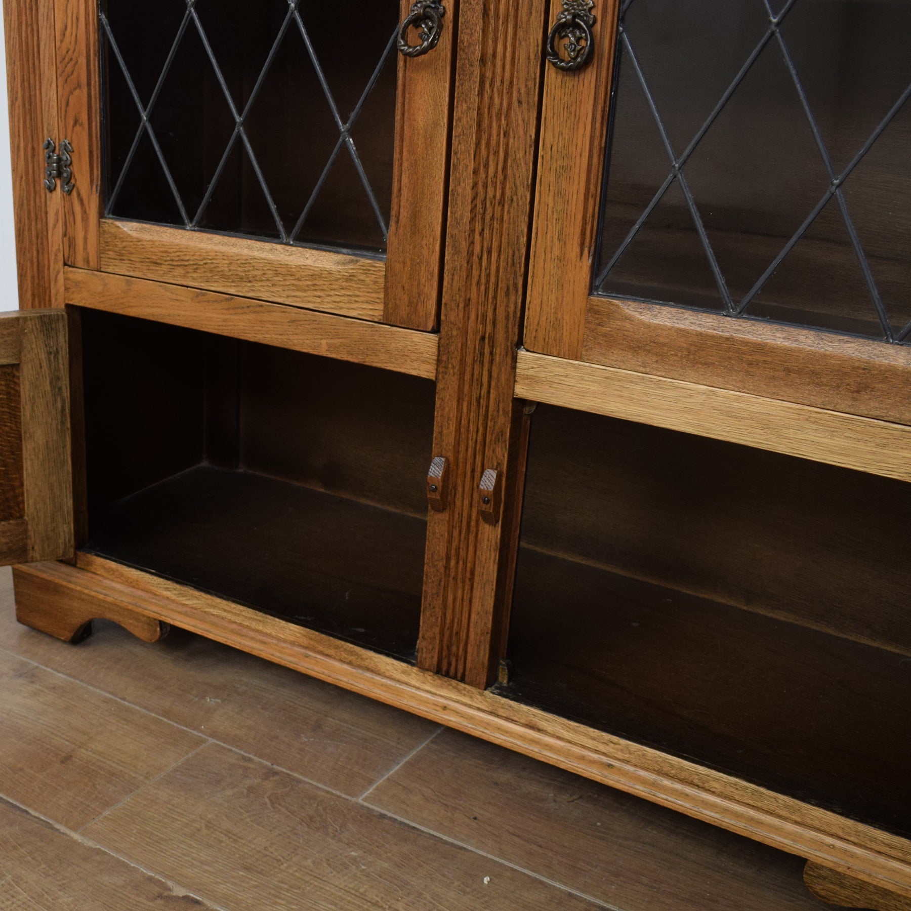 This oak-glazed bookcase features a well-proportioned two-section design. The upper section includes two glazed doors with decorative leaded glass panels, opening to reveal internal shelving suitable for books, glassware, or ornaments. Carved detailing along the top frieze and fluted side accents add character, while the lower cupboard doors display attractive panels that provide additional concealed storage. The warm oak tone highlights the natural grain and complements both traditional and more modern interiors.