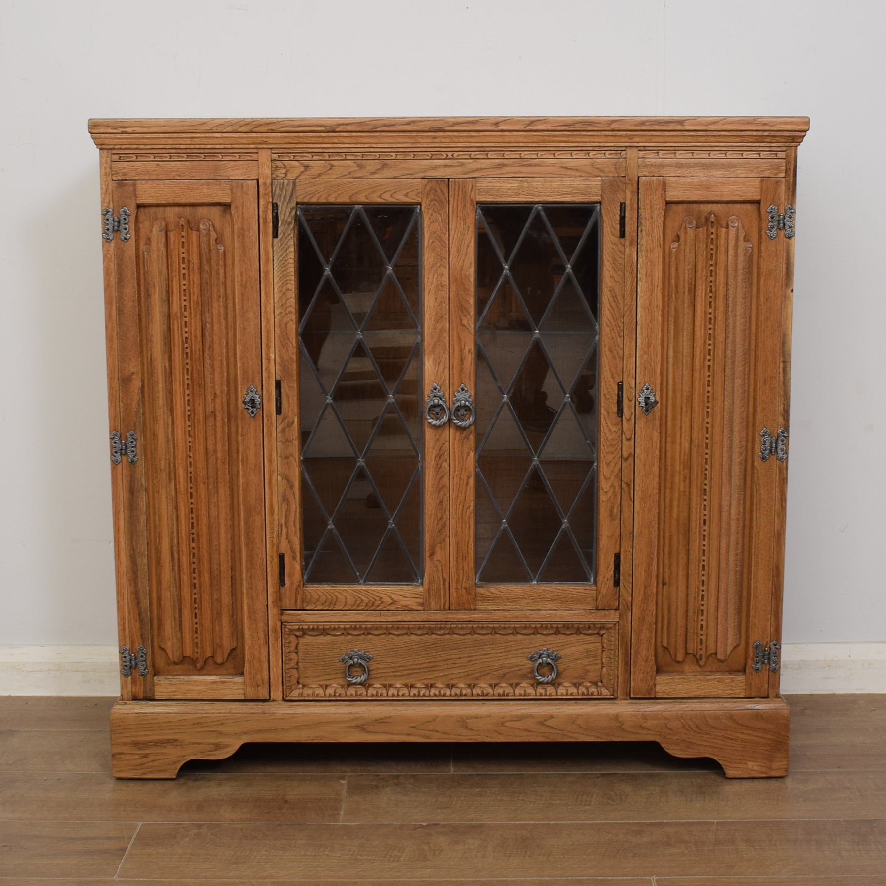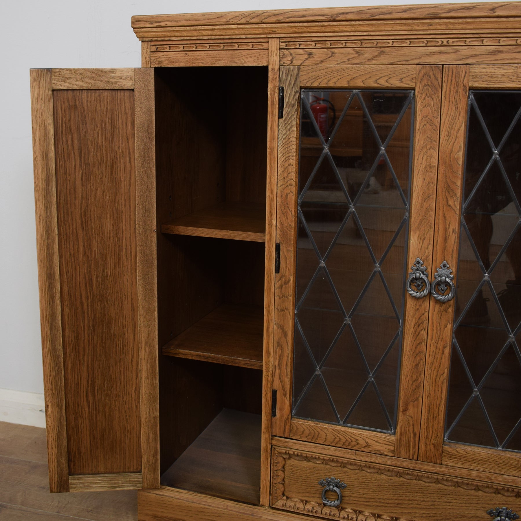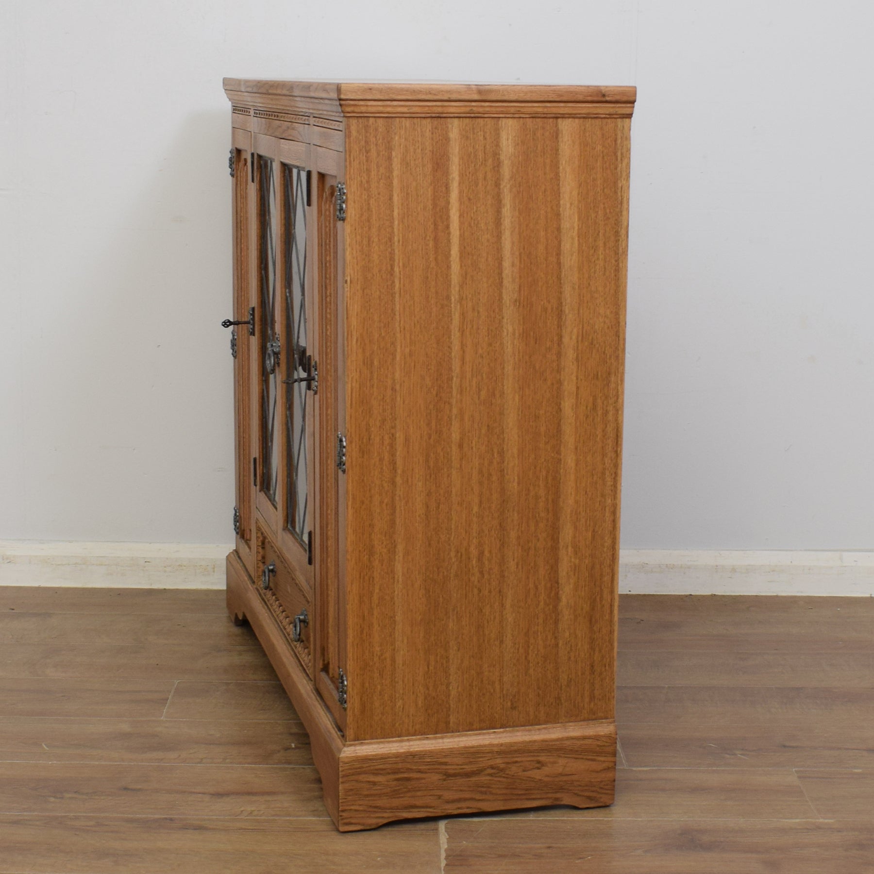 The carvings on the drawer front, the linenfold styling on the cabinet doors, the attractive oak grain, leaded glazed doors, and ornate hinges all contribute to the charm and quality of this lovely piece. It will fit with both traditional and more contemporary interiors.