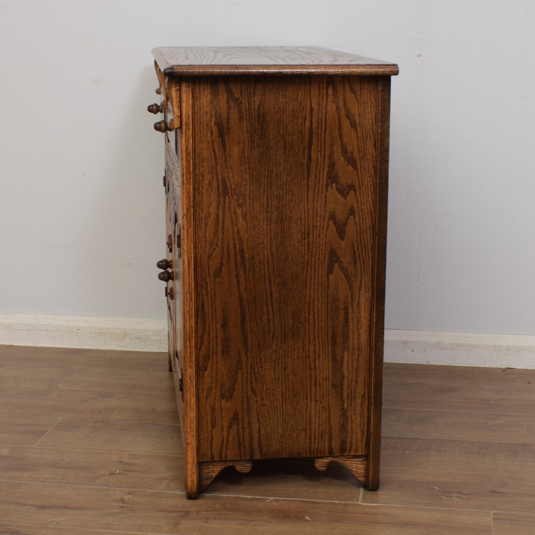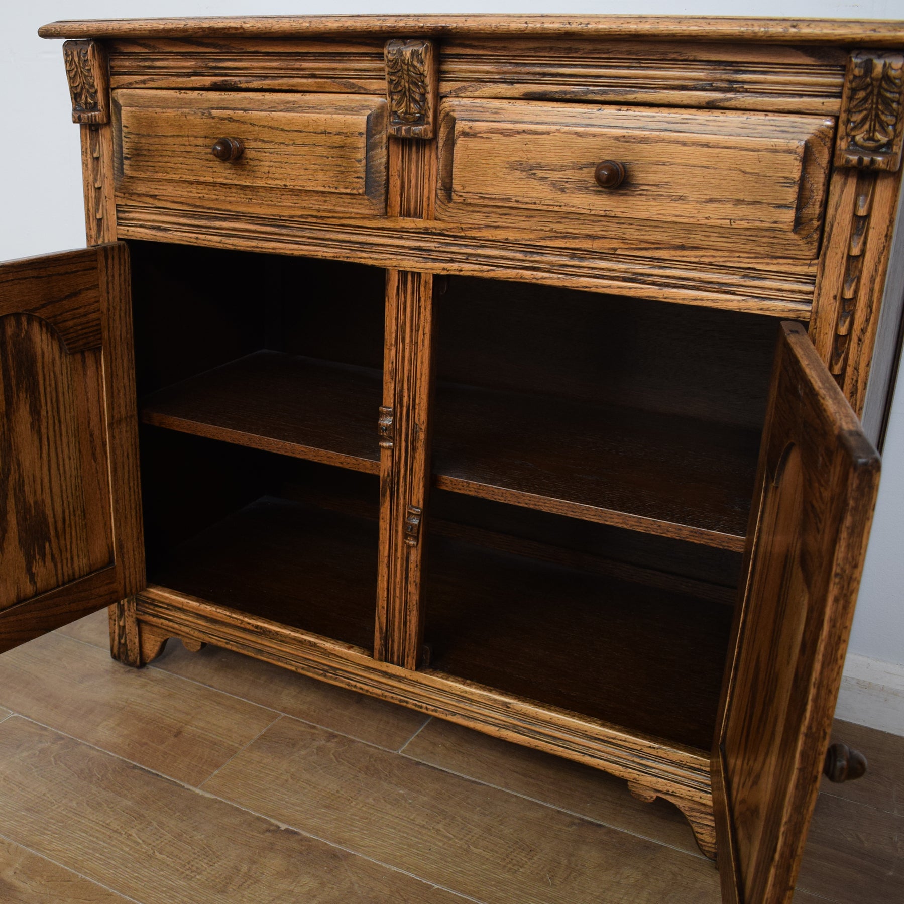 The top of this sideboard is the ideal place for favourite ornaments or family photos and a vase of flowers. It has a double cupboard providing plenty of space to store those items that are best kept out of sight. It also has two drawers which are ideal for smaller items and personal effects. The detailed carvings and attractive oak grain mean this sideboard is full of personality and style.