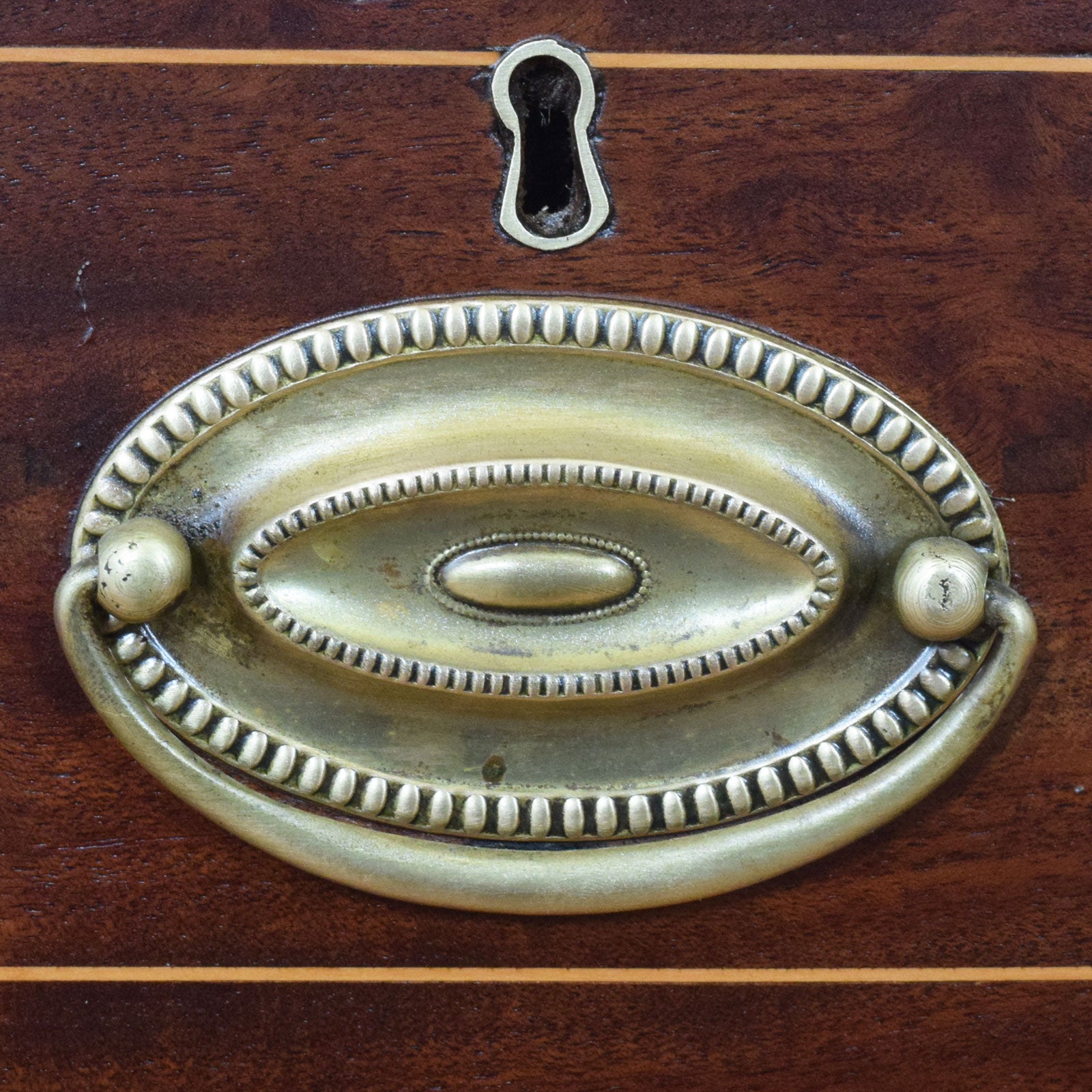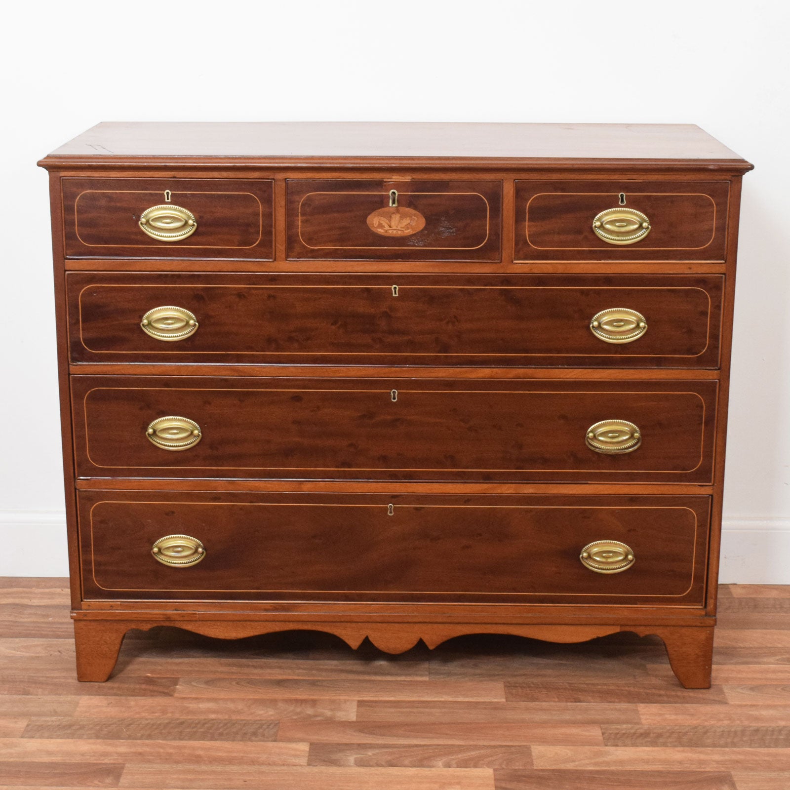 The chest is arranged with three smaller drawers across the top over three full-width graduated drawers below, providing practical storage for clothing and household items. Each drawer front is decorated with delicate boxwood string inlay, framing the rich mahogany grain and adding subtle definition. The top central drawer features an oval inlaid motif, creating a focal point that enhances its traditional appeal. Original-style brass oval drop handles and escutcheons complement the warm tones of the timber, and the shaped apron and bracket feet give the piece a balanced, elegant stance. A working key is provided, which operates the lock on the top central drawer.