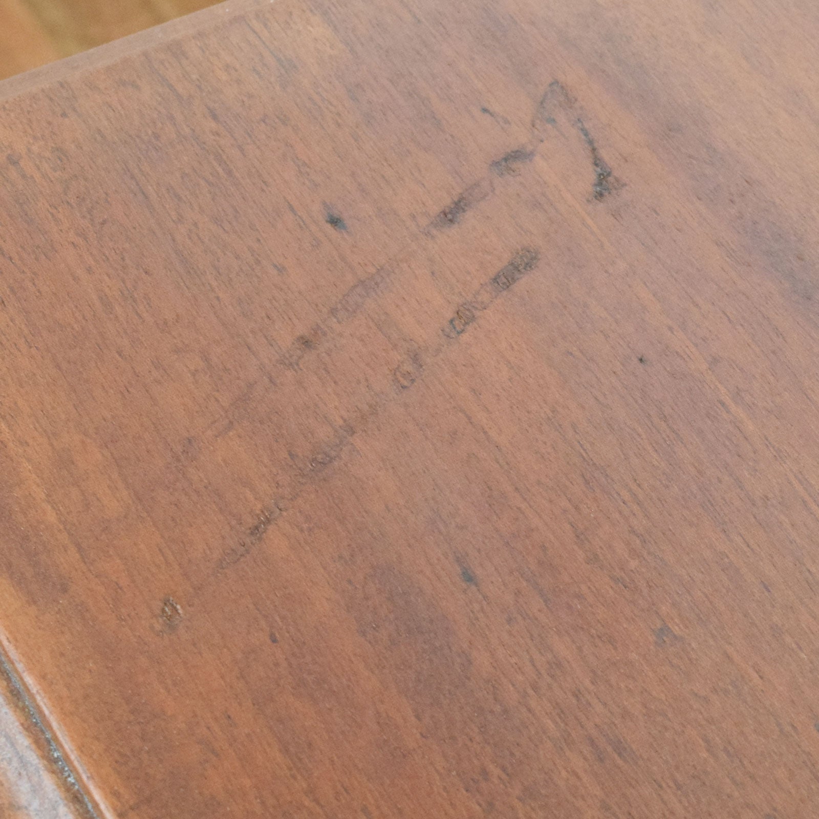 The previous finish has been carefully stripped, and multiple coats of hard-wearing matte lacquer have been applied, providing a durable, long-lasting finish while accentuating the natural depth and figure of the mahogany. There are visible dents and age-related marks to the top surface, along with surface scratches and darker marks consistent with its history and use. There is also veneer damage to the top central drawer, which remains visible and has been retained as part of the piece’s character. The chest is made from mahogany, with pine drawer bases and pine back panels, and features traditional dovetail jointed drawers.
