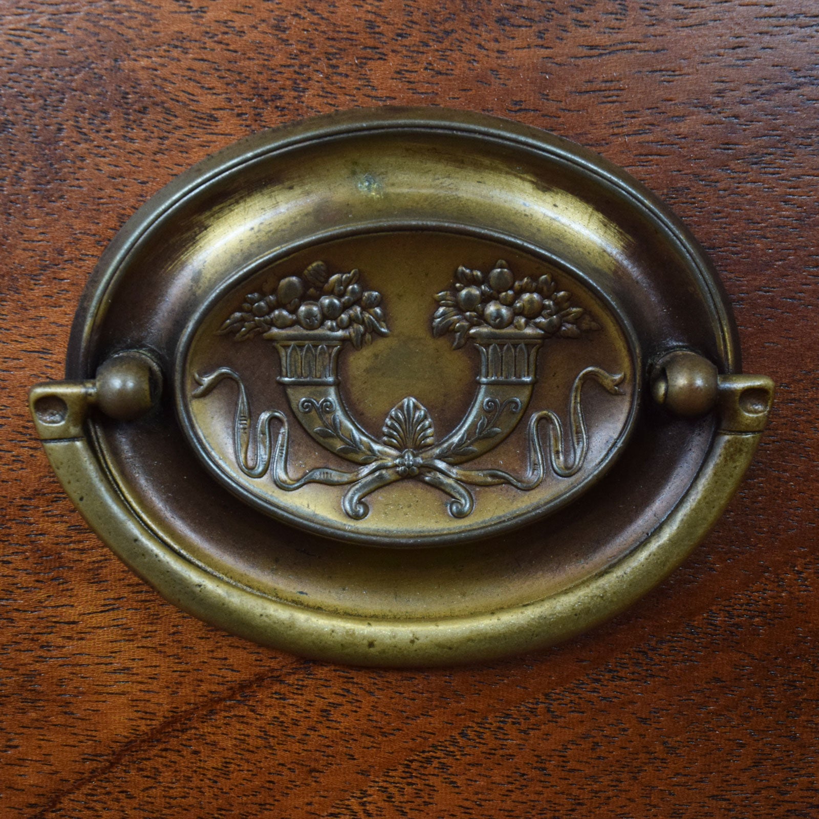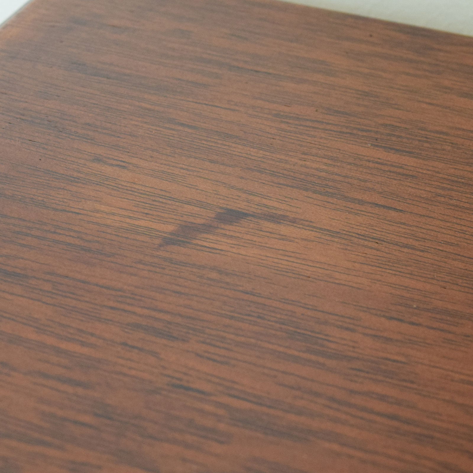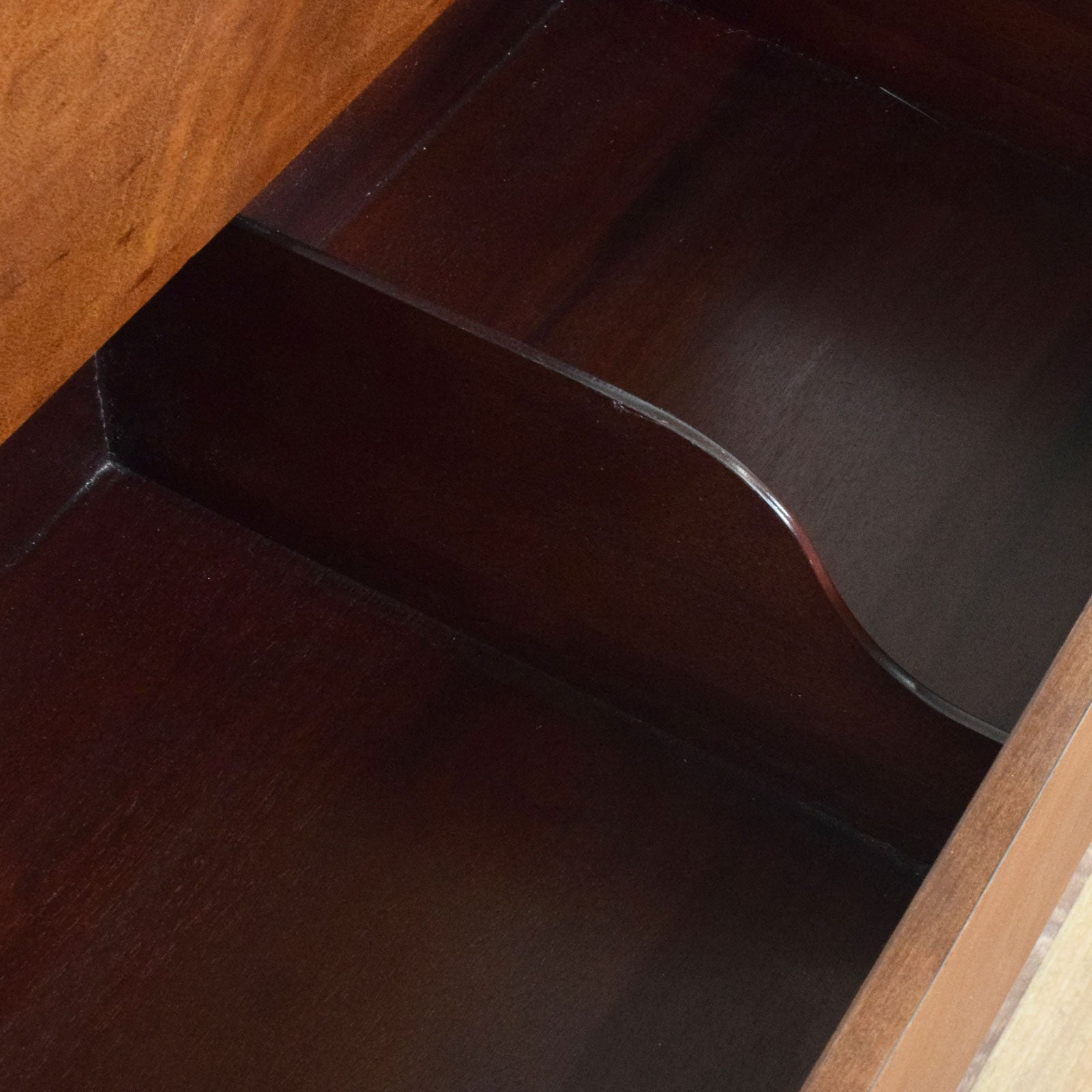 The previous darker stain has been stripped, and then multiple coats of hard-wearing matte lacquer have been applied, providing a durable, long-lasting finish while also accentuating the natural mahogany grain. There are some visible watermarks and age-related markings present, including marks on the top surface and a small area of wear to the front edge, all of which can be seen in the photographs and reflect the piece’s age and history. This item is made from compressed material covered in mahogany veneer, with the drawer bases and back panels made from plywood.