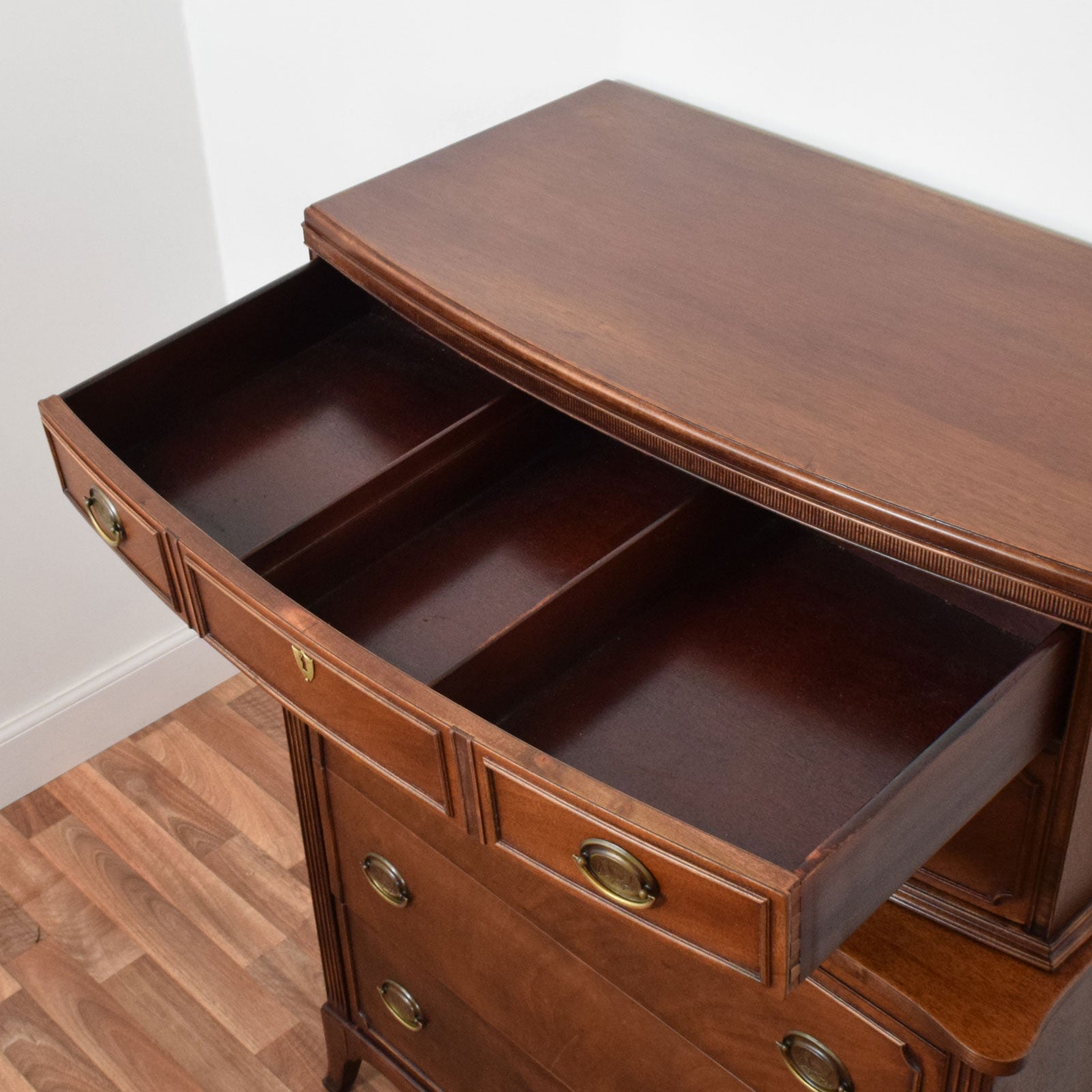This restored mahogany chest of drawers features a classic arrangement with two smaller drawers above three larger full-width drawers; two of the drawers are fitted with dividers providing plenty of practical storage. The drawer fronts display attractive mahogany grain, complemented by decorative moulded detailing and fluted corner accents that add subtle visual interest. The drawers are fitted with brass drop handles featuring decorative backplates, while the chest stands on shaped bracket-style feet that give the piece an elegant and balanced appearance.
