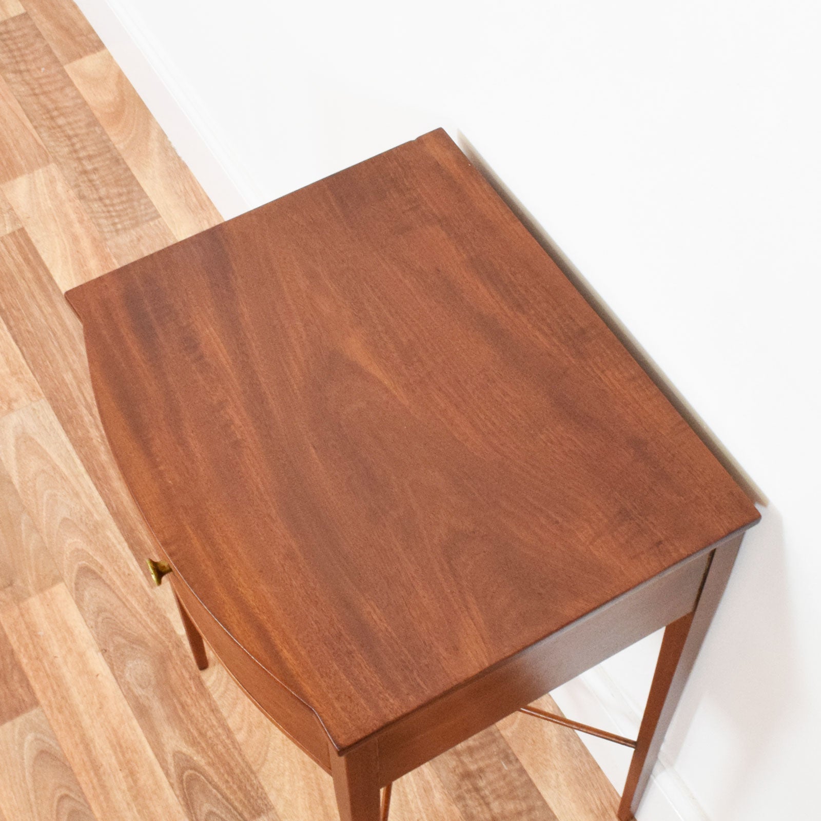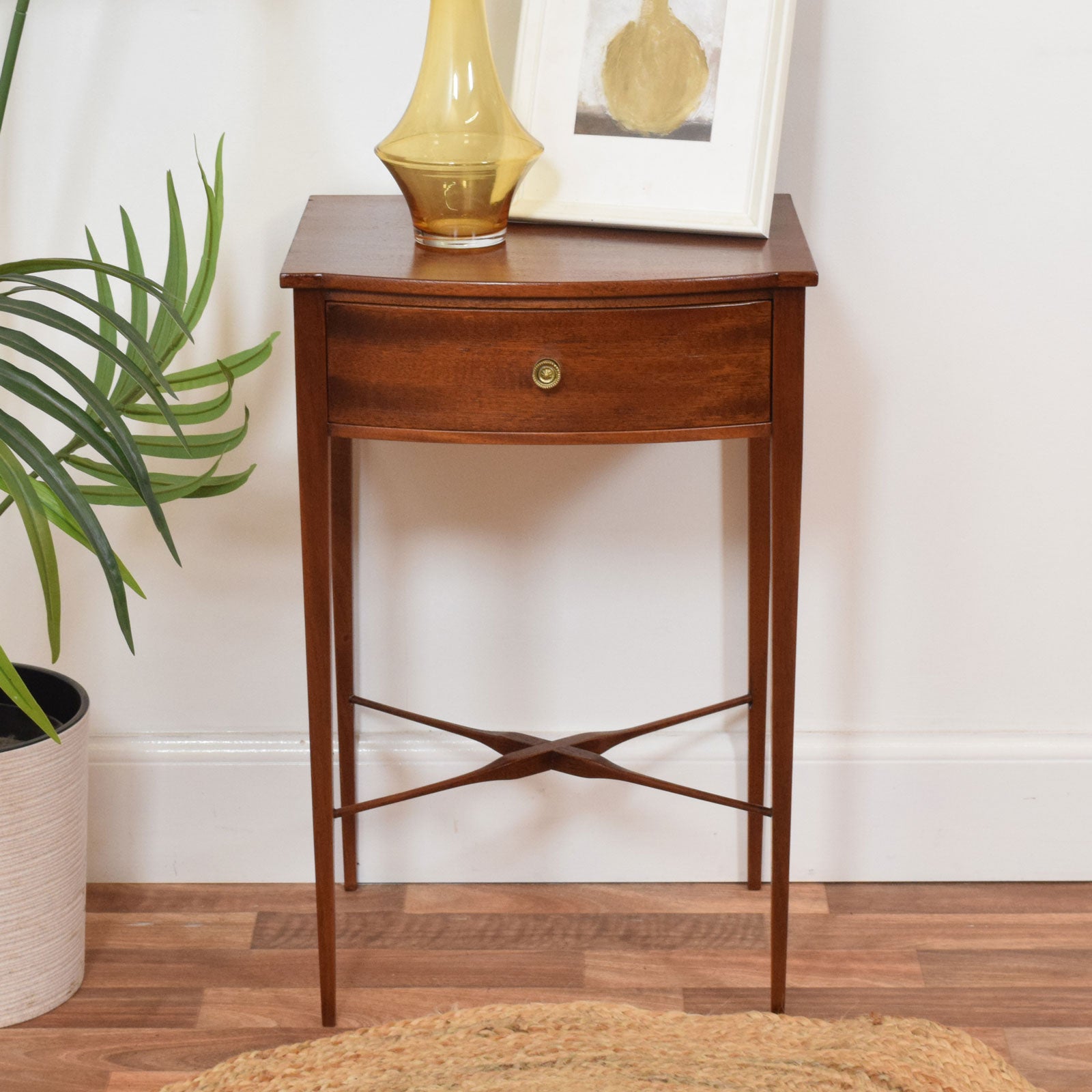 This restored mahogany console table features a gently shaped top with a subtle serpentine front, adding a refined detail to its otherwise clean lines. The single drawer, set neatly beneath the top, offers convenient storage and is finished with a decorative brass knob that complements the rich tone of the timber. The slender, tapered legs give the piece an elegant stance, while the shaped cross stretcher provides both stability and visual interest. The warm colour and fine grain of the mahogany enhance its traditional character, making it suitable for both classic and more contemporary interiors.