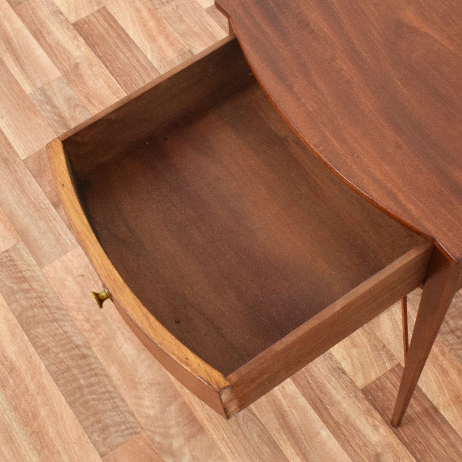 The previous darker stain has been stripped, and then multiple coats of hard-wearing matte lacquer have been applied, providing a durable, long-lasting finish while also accentuating the natural mahogany grain. This careful restoration highlights the depth of colour and ensures the surface is well protected for everyday use. This item is made entirely from mahogany.