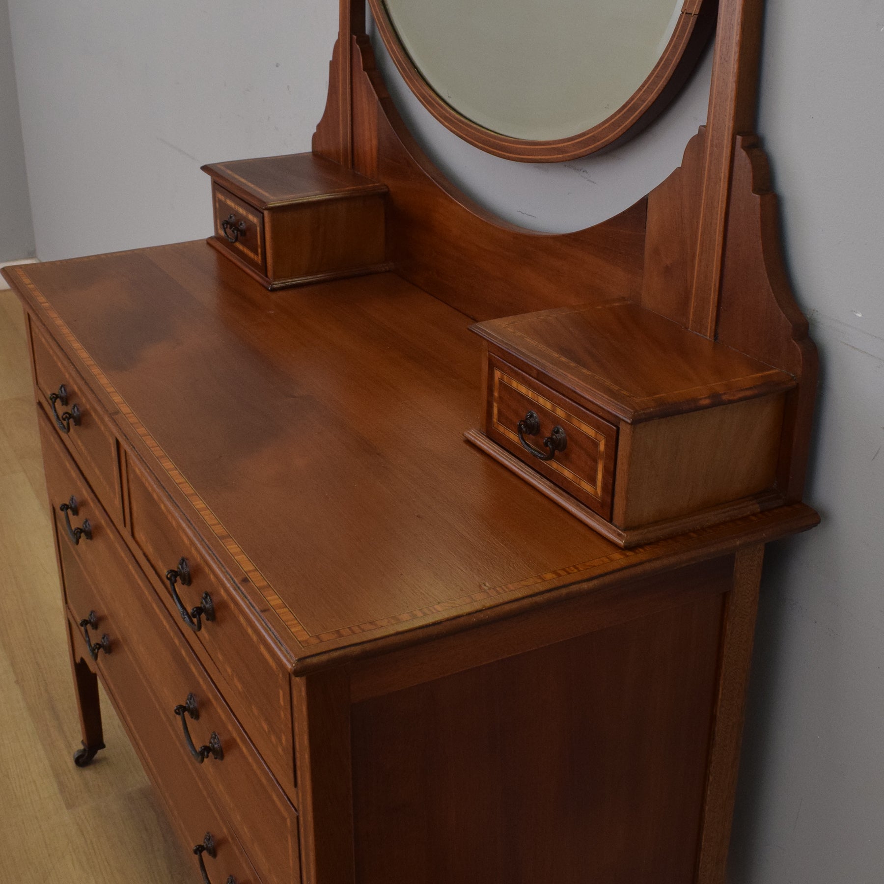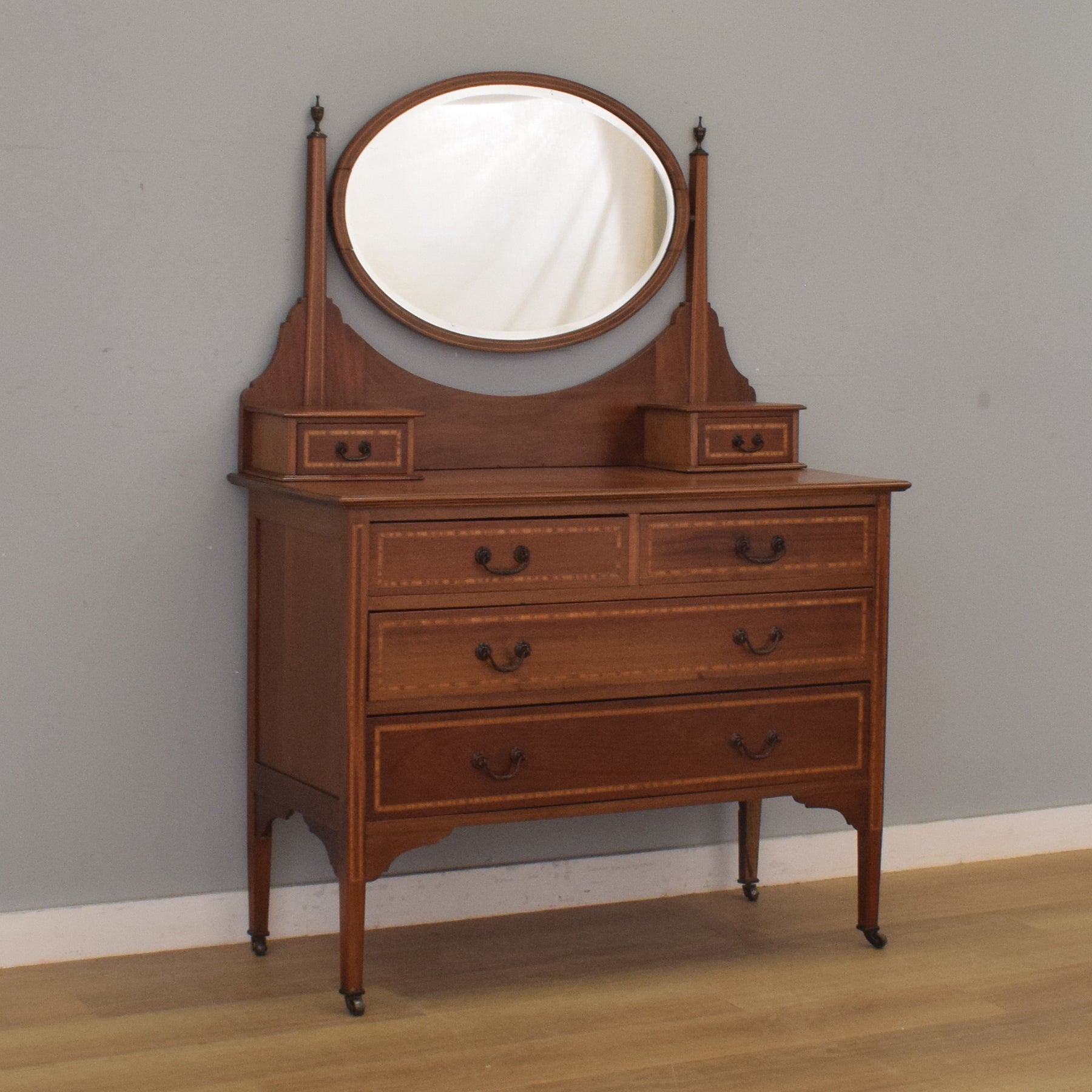 An elegant mahogany dressing table with an oval mirror back, delicate inlaid detailing and classic slender legs on castors—an eye-catching piece for a bedroom or dressing room.