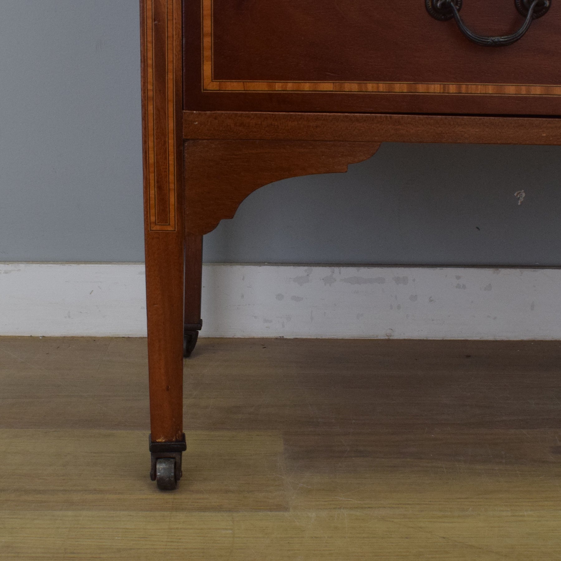 Made mostly from mahogany, with some veneered sections, and plywood used for the back and drawer bases. It has been stripped and then lacquered, leaving a rich, clean finish while retaining light age-related character marks and subtle variations to the tone.
