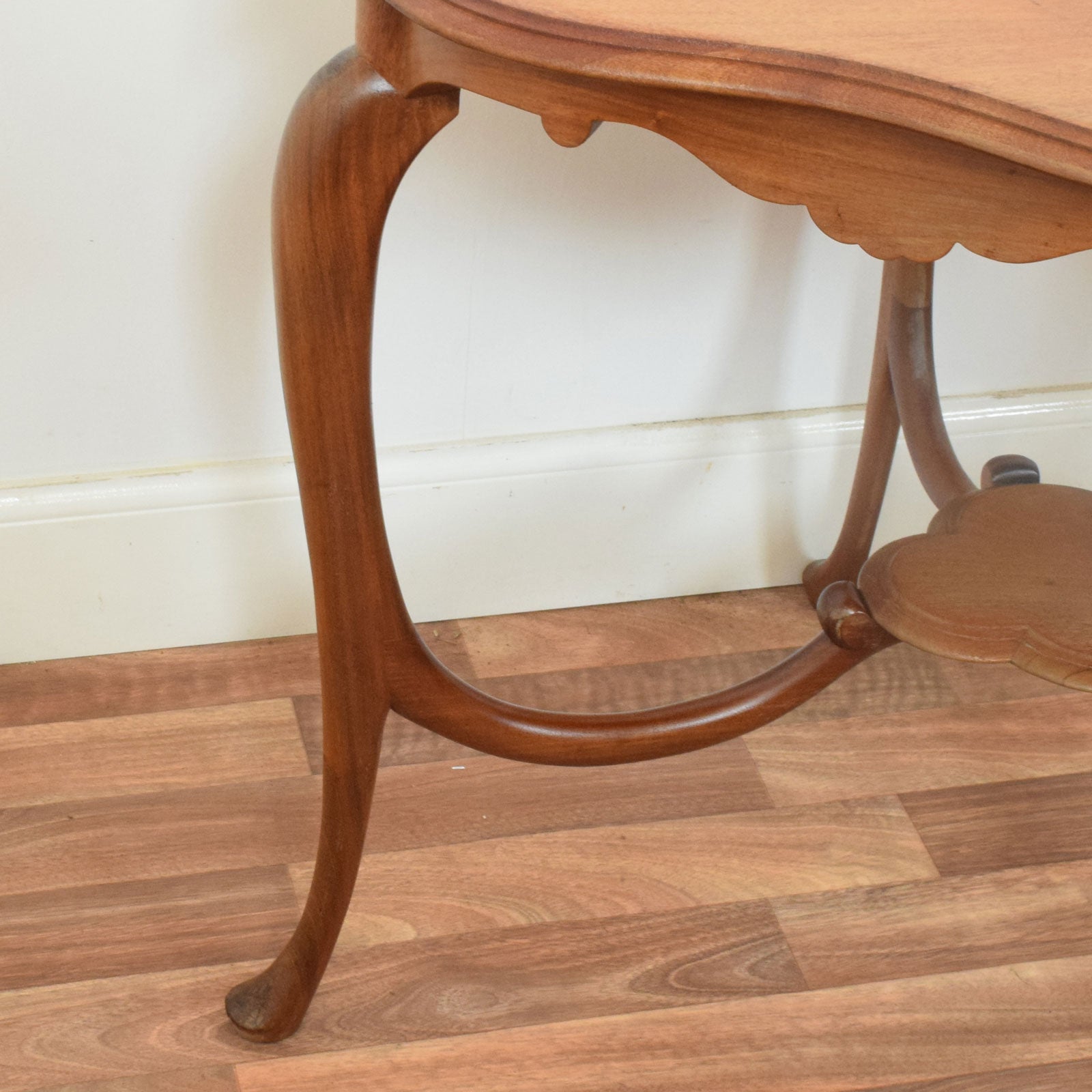 The table features a scalloped-edge top and slender, curving legs that extend down to delicate pad feet, joined by an ornamental lower shelf in a matching shape design. The gentle curves and light proportions give it a refined presence, ideal for use as a side table or display surface.