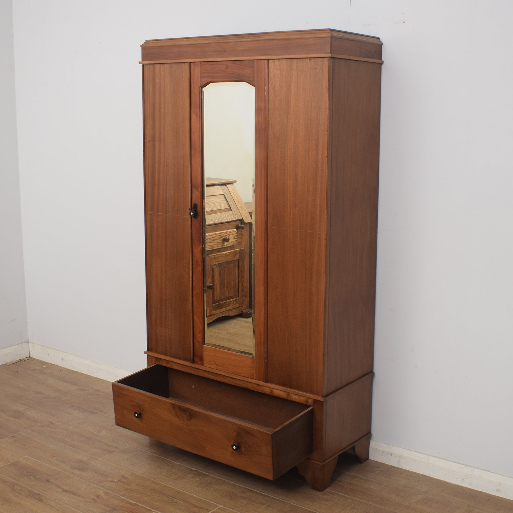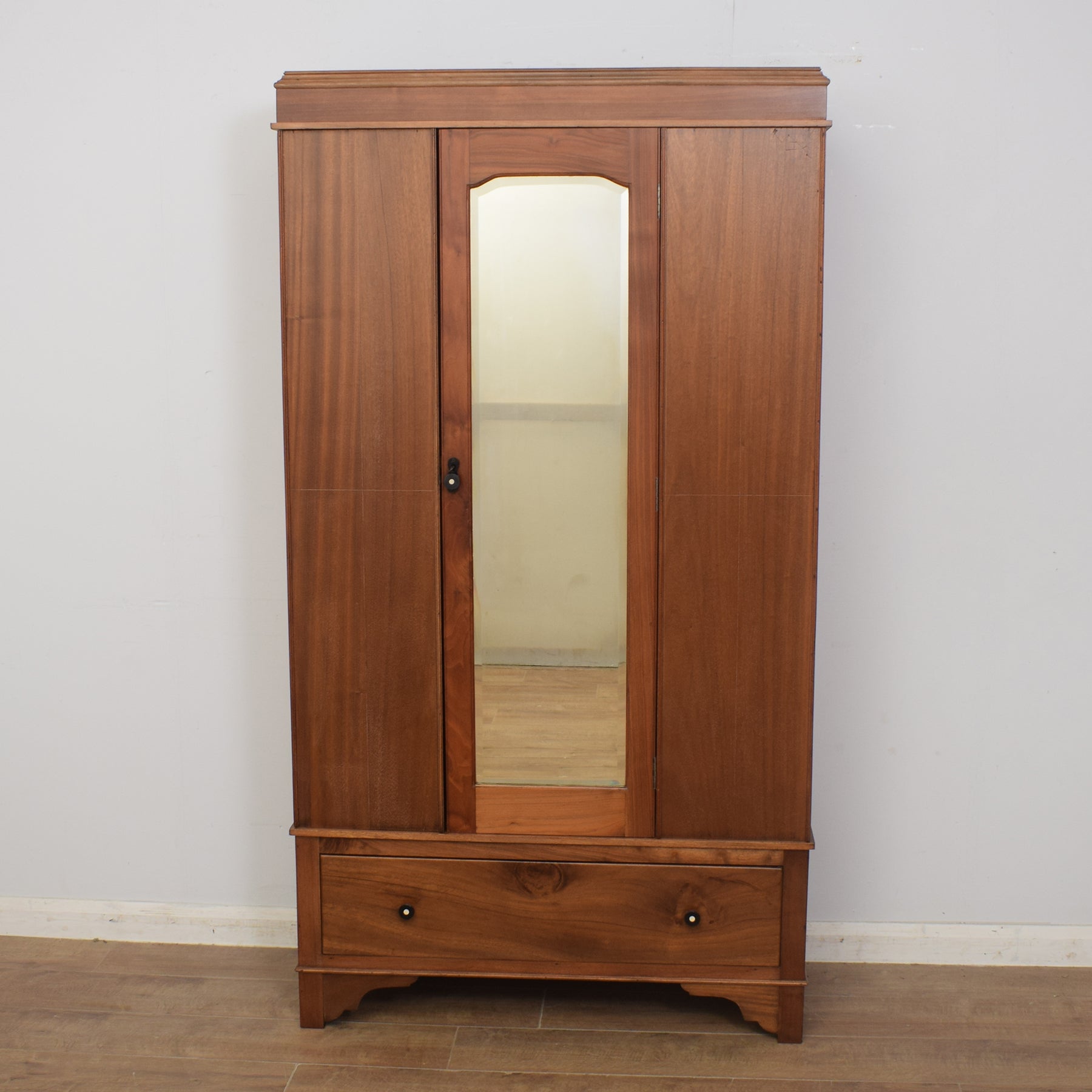 This hallrobe features a central door fitted with a bevelled mirror, flanked by attractive veneered panels on either side. Inside, a single hanging rail holds seven original metal sliding hooks—ideal for coats, jackets, or light garments. A full-width lower drawer provides additional storage for shoes, bags, or seasonal items.