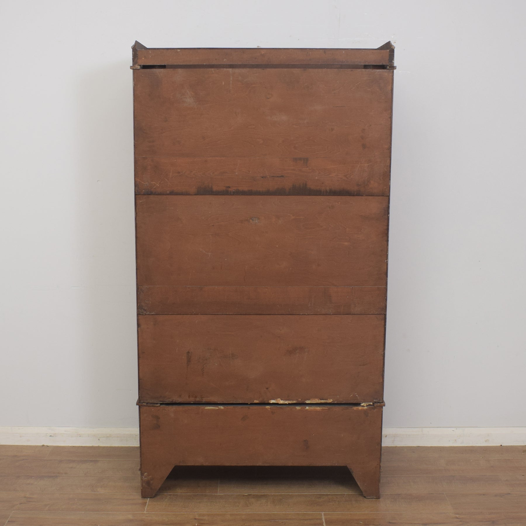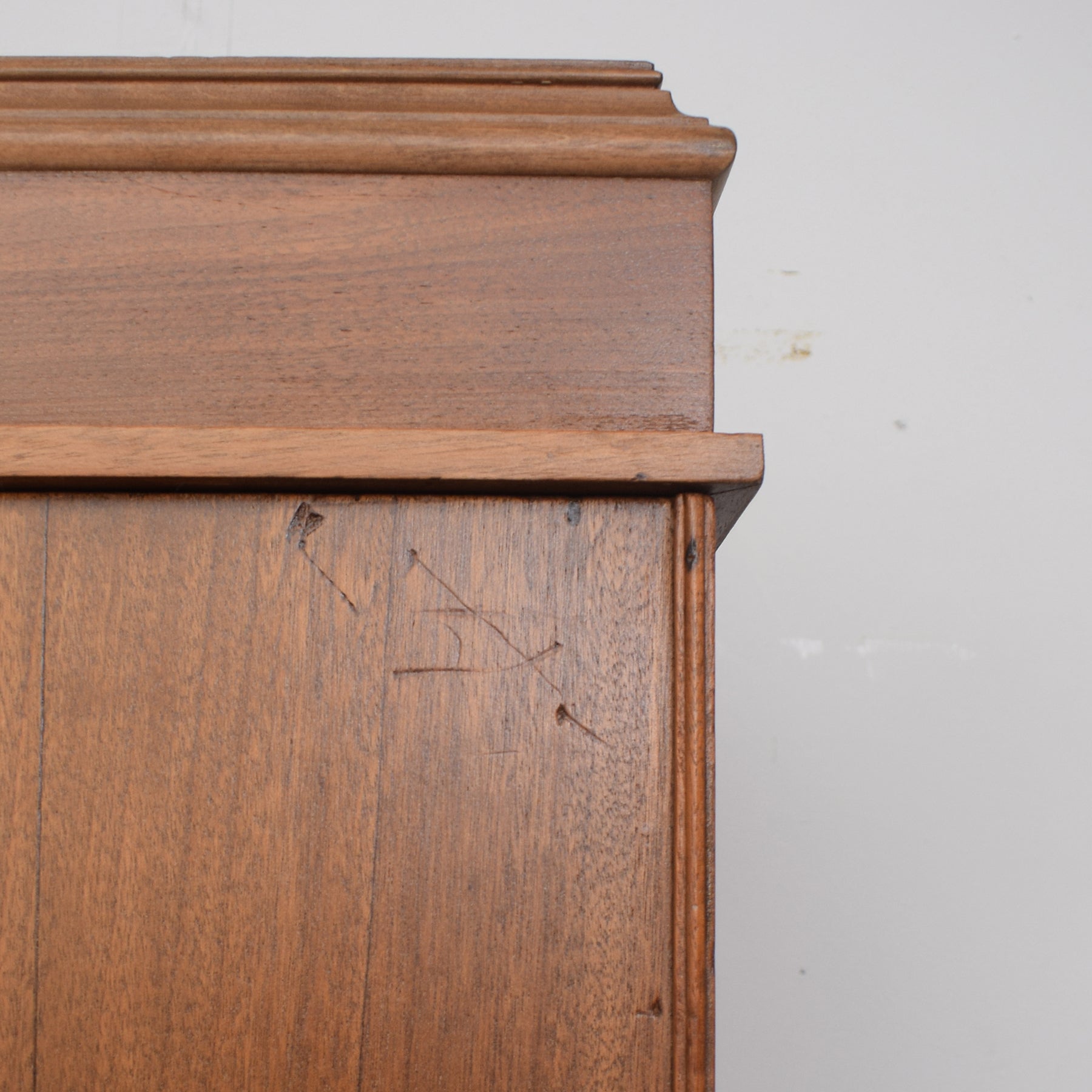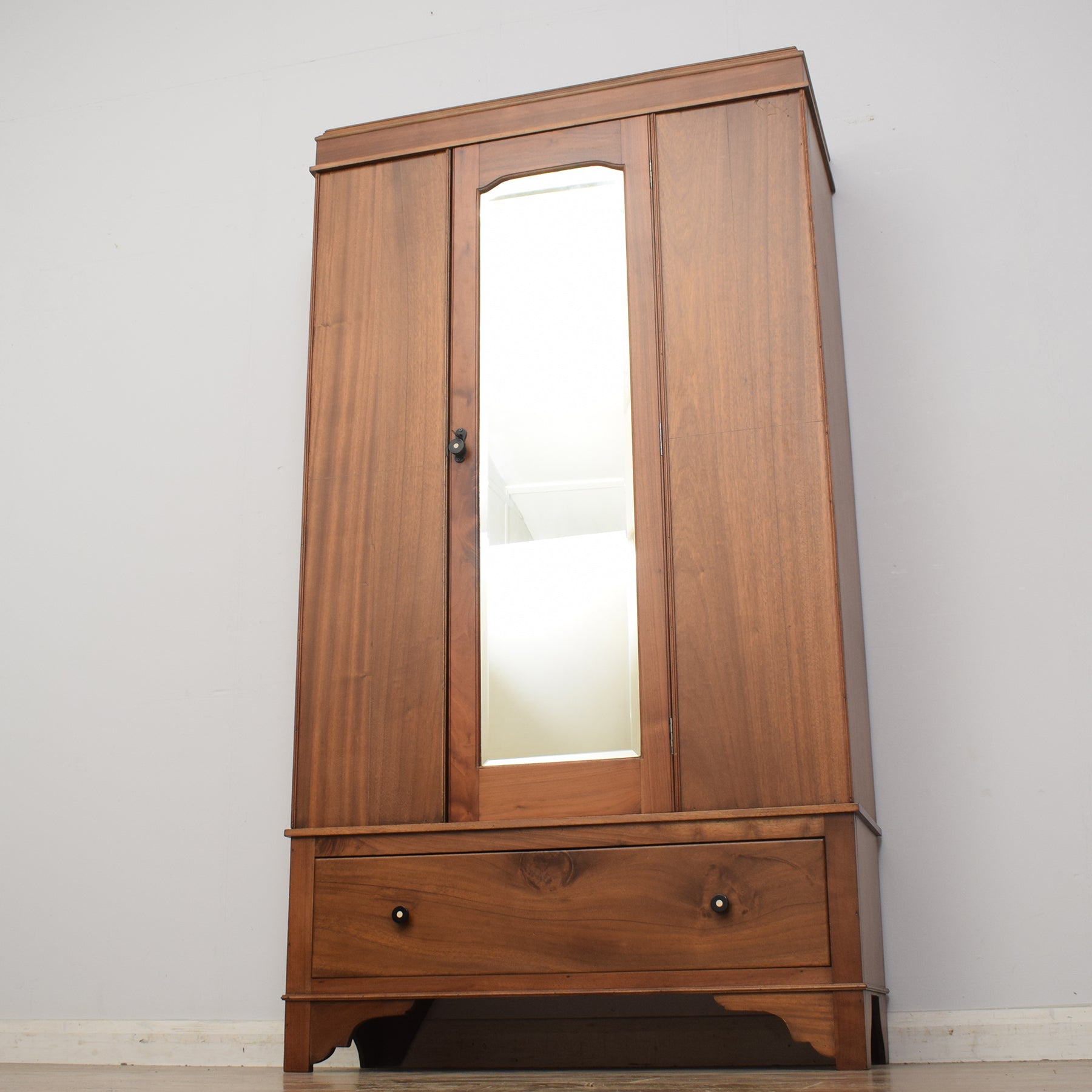 The original finish has been carefully removed and replaced with multiple coats of protective matte lacquer, which enhances the colour and texture of the mahogany while offering lasting durability. This piece is constructed from a combination of solid mahogany and mahogany veneer, with plywood used for the back panel and drawer base. There is a small area with some scratches on the front of this wardrobe in the top right-hand corner, as shown in our final photograph. These are minor cosmetic blemishes and do not detract from what is a great-looking hall robe.