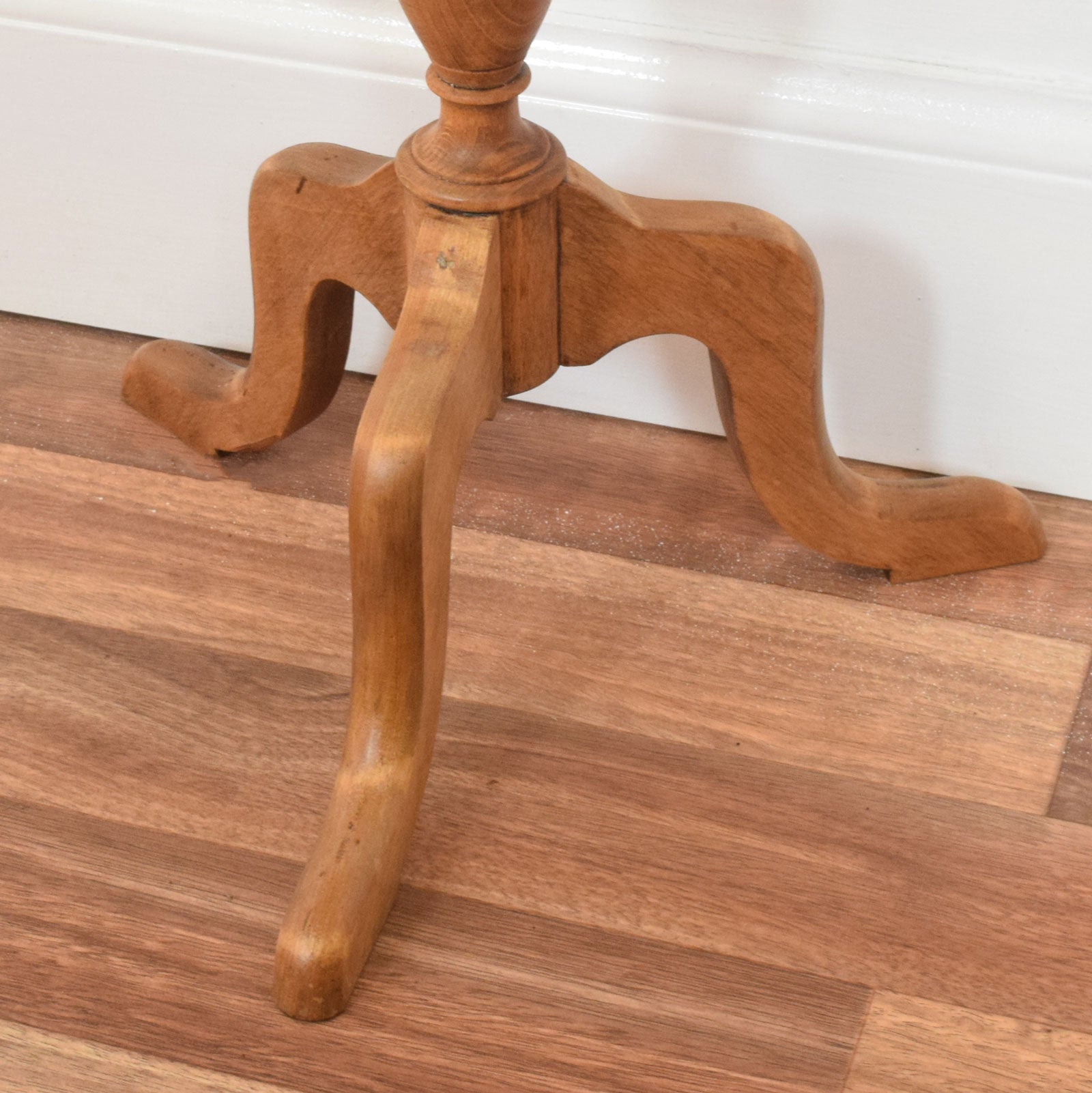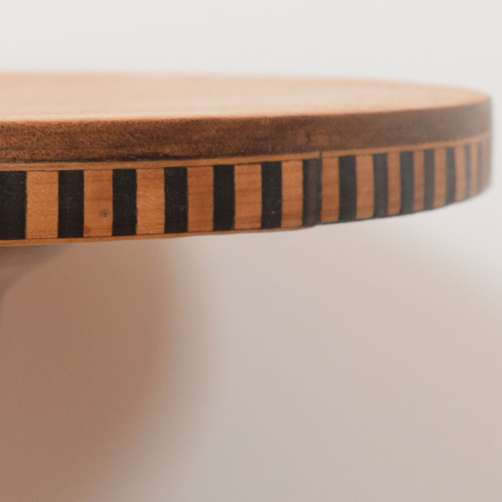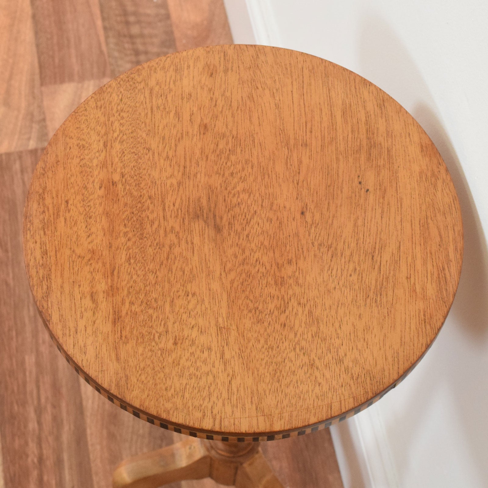 This restored plant stand features a finely turned central column, resting on a tripod base with gracefully splayed legs. The circular top is edged with an inlaid decorative band of alternating light and dark wood, lending a refined touch to the simple silhouette. Its compact size makes it an ideal choice for corners, window bays, or alongside a fireplace.