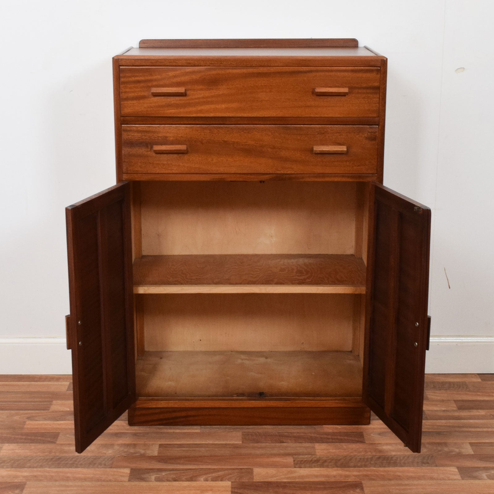 This vintage mahogany tallboy features a striking vertical form, incorporating two spacious drawers above a double-door cupboard. The design is defined by its elegantly simple, integrated wooden handles and fluted door fronts, which add subtle depth and interest to the facade. Inside, a fixed internal shelf provides convenient storage for folded clothes, accessories, or linens. The top surface includes a raised gallery edge, adding a refined finishing touch while also offering display space for decor or essentials.