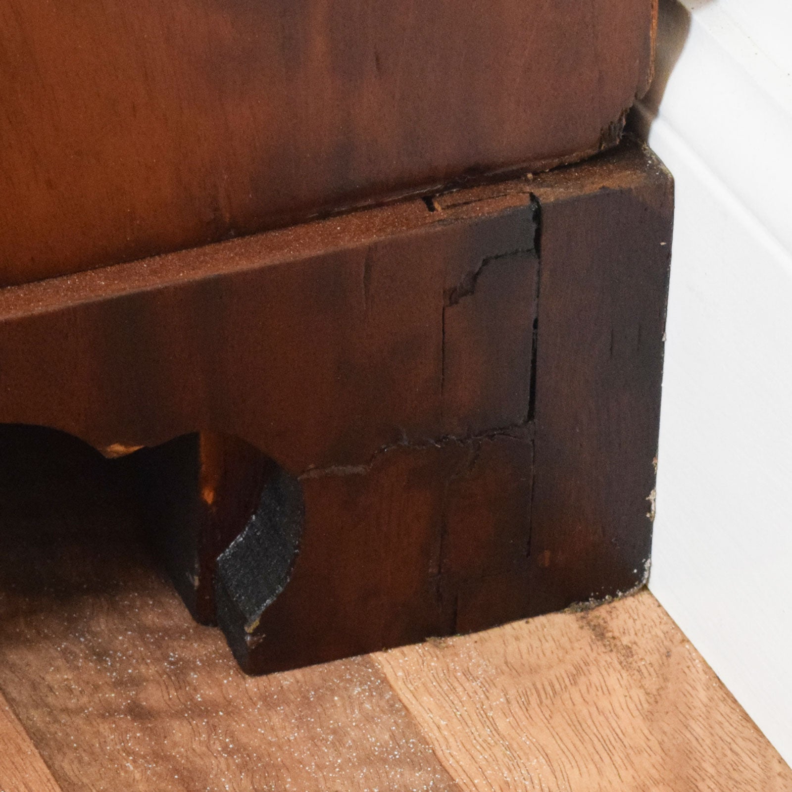 Please note that there is veneer damage around the base and a visible crack on the back-left side near the base, as shown in the photos. These areas are cosmetic and do not affect the structural use of the wardrobe.