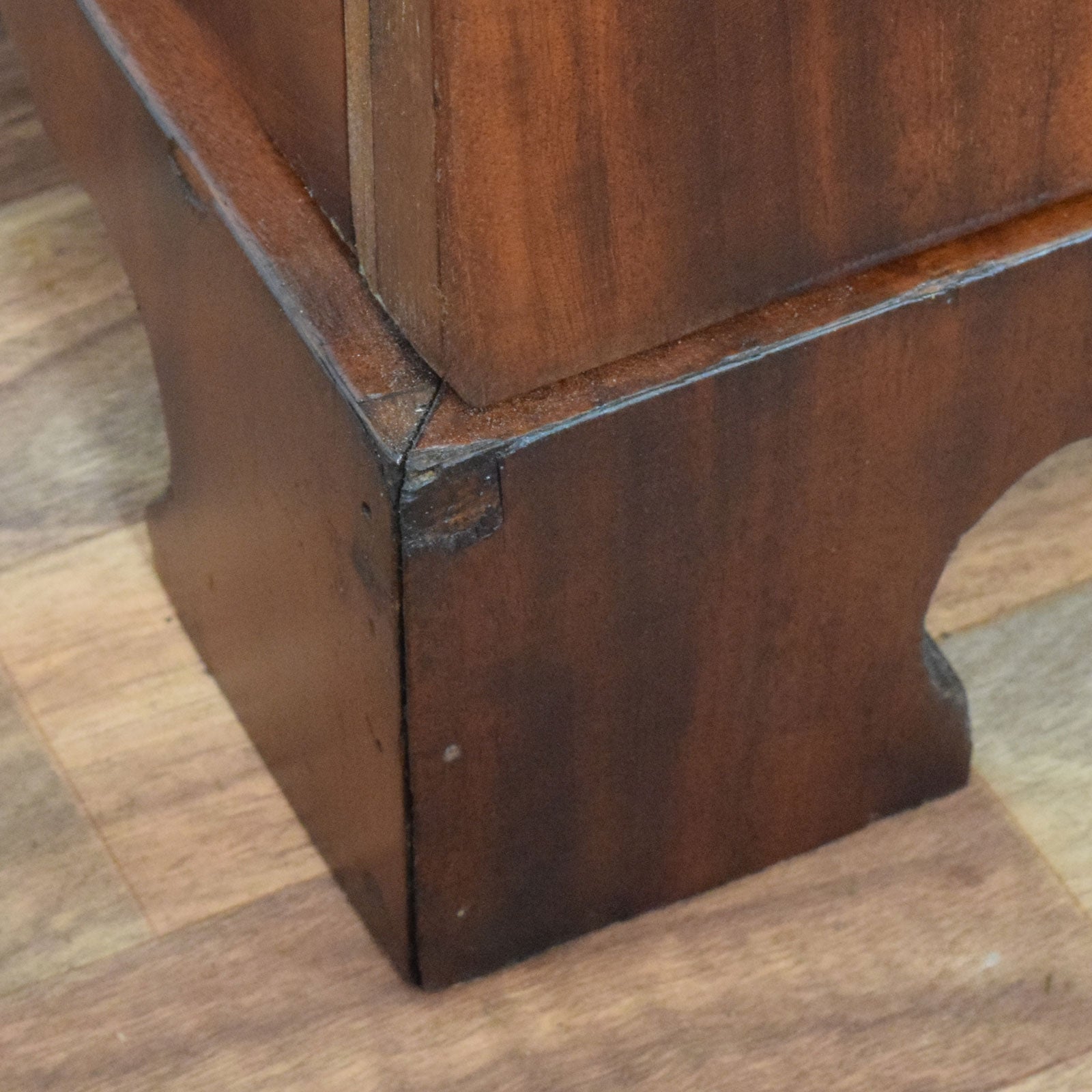 The previous darker stain has been stripped, and then multiple coats of hard-wearing matte lacquer have been applied, providing a durable, long-lasting finish while also accentuating the natural beauty of the mahogany grain. This item is made with a mahogany veneer, with the drawer bases and back being made from plywood.