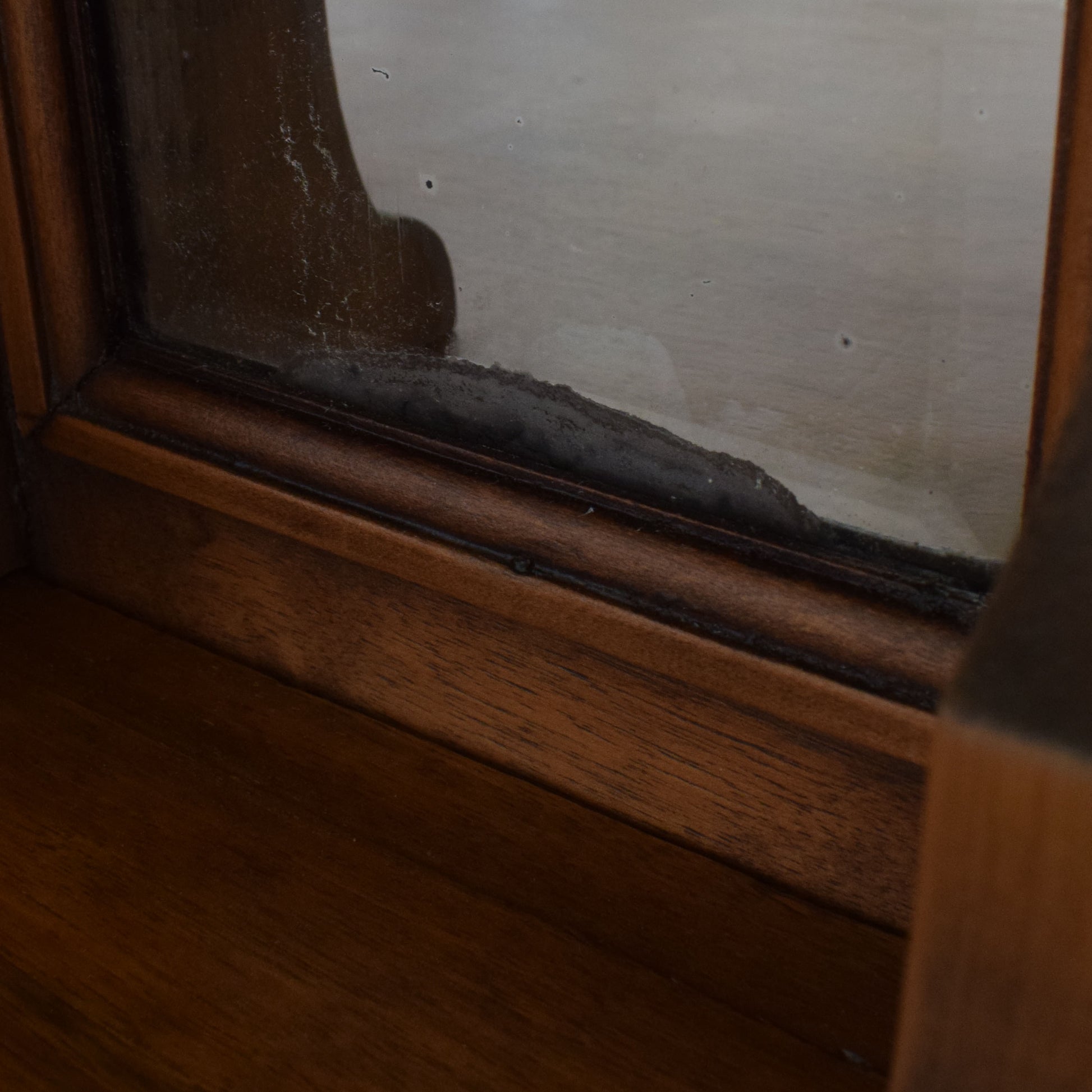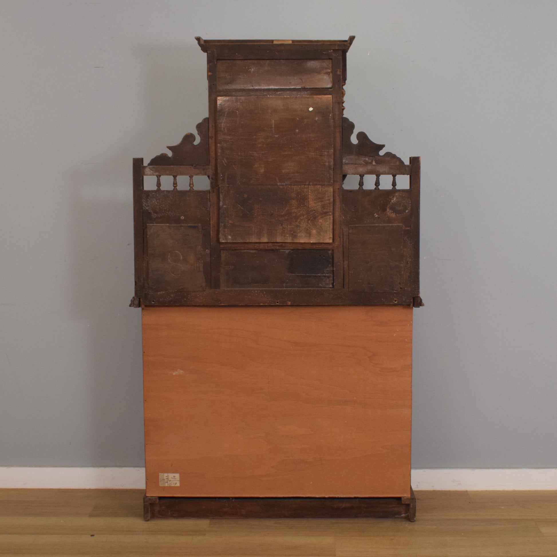 Crafted from a combination of hardwood and veneer, this piece features a two-door cupboard with internal shelving and two drawers above for smaller items. The raised mirrored back is highly decorative, with turned supports, hand-carved detailing, and shaped brackets flanking three original mirrors. Delicate fretwork and floral motifs add to the ornamental charm, while aged brass handles complete the look with a sense of quiet authenticity. The open shelves on either side of the mirror provide additional display space for cherished items or practical use in a dining setting.