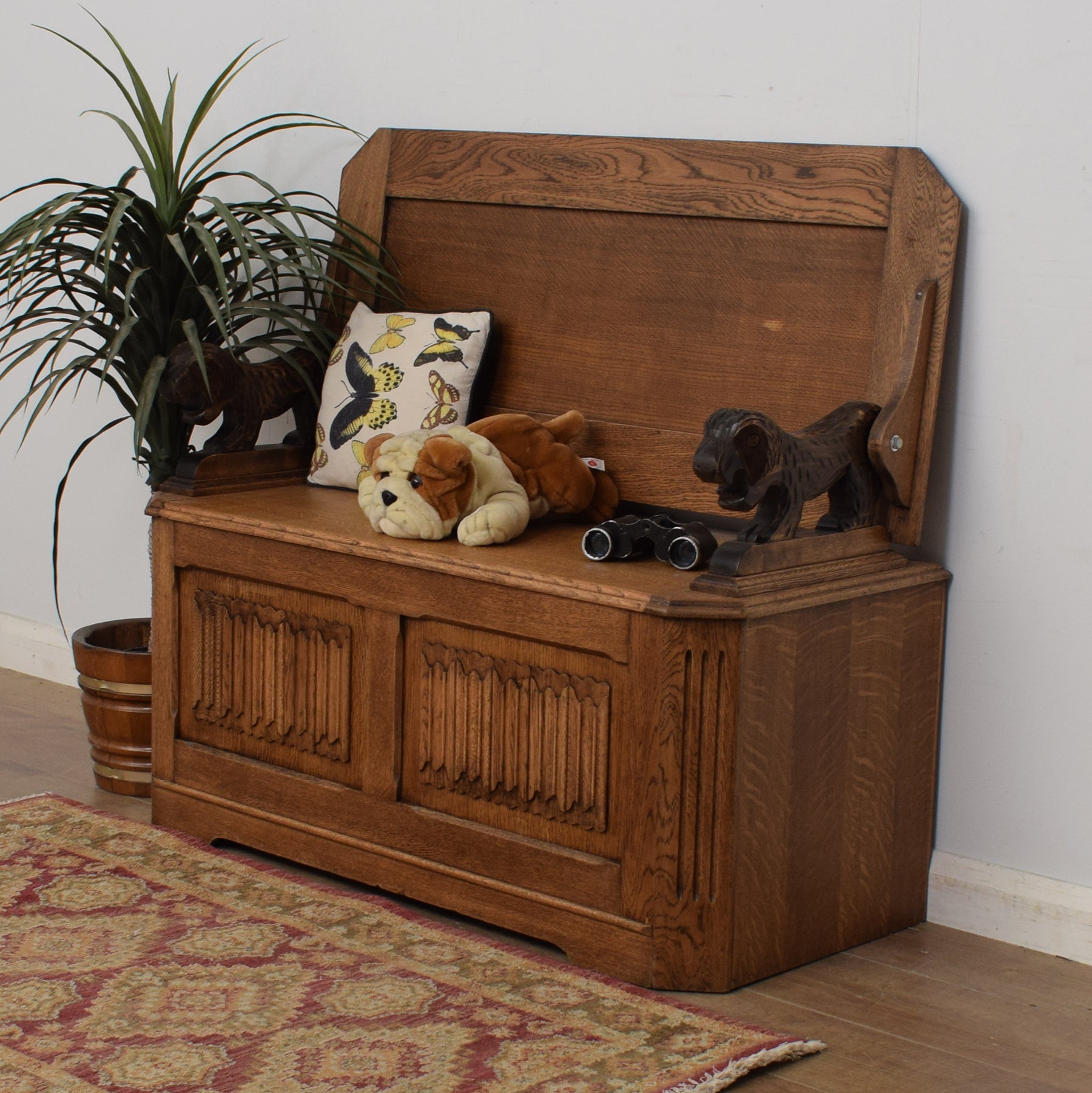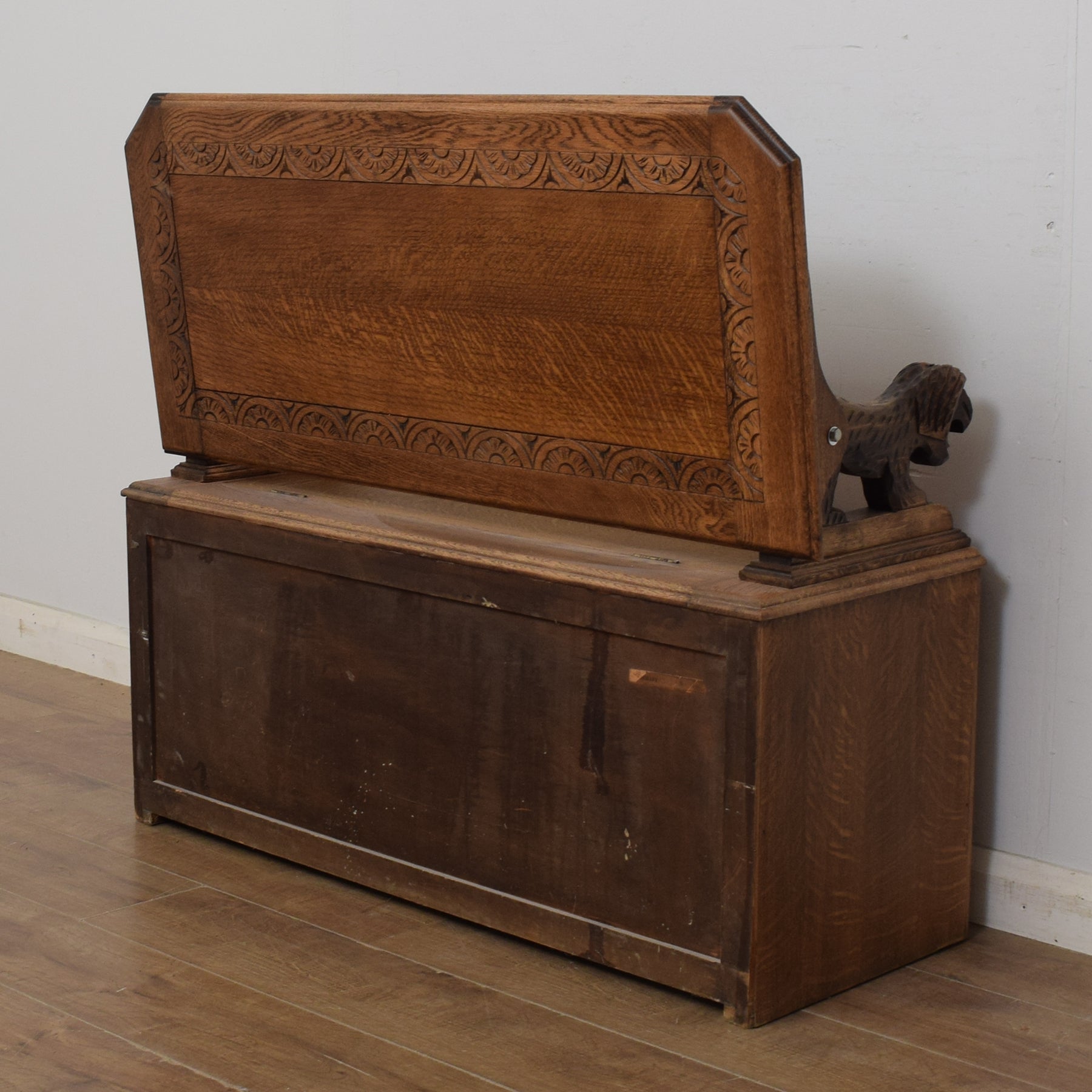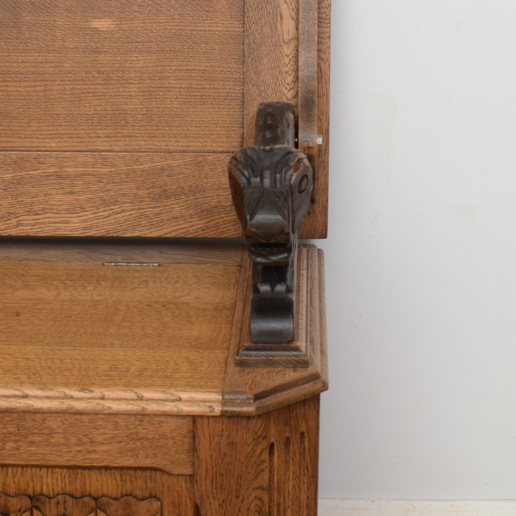 The generous storage box makes the ideal solution to keep shoes, bed linen, toys, games and many other items neatly packed away. With the back in the upright position, it makes a practical and comfortable bench seat that is ideal for putting on shoes. Lowering the back then gives a useful and very sturdy side table. The carvings on this monks bench are very eye-catching, and the lion armrests add heaps of character to this robust piece.