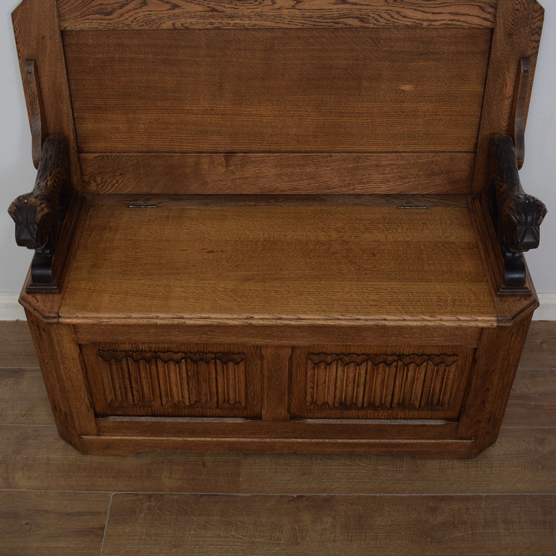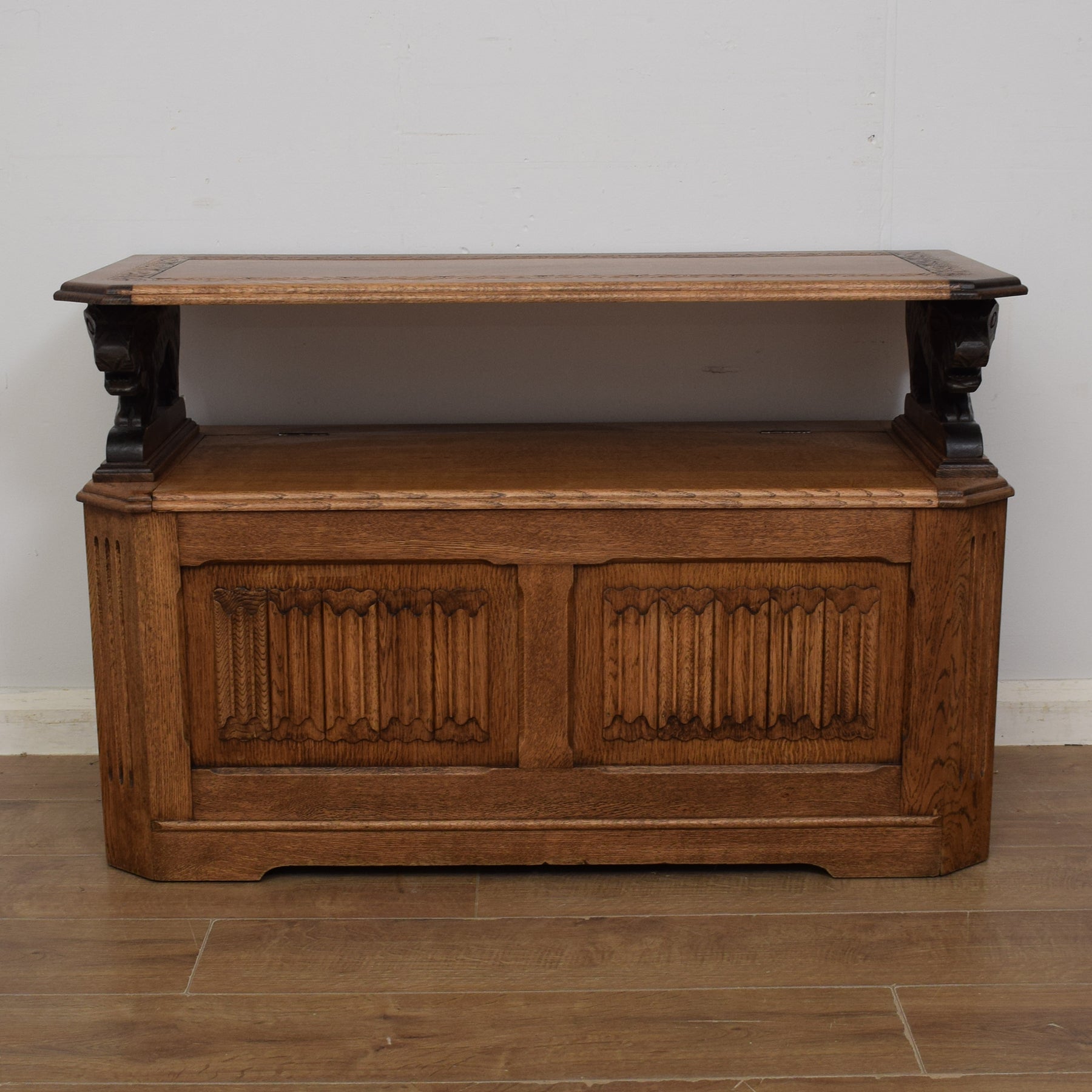 The attractive carvings on the tabletop and the front of the storage box, along with the beautiful oak grain make this monks bench a very desirable piece of furniture, which will look great in a hallway, conservatory, or any other room in the home.
