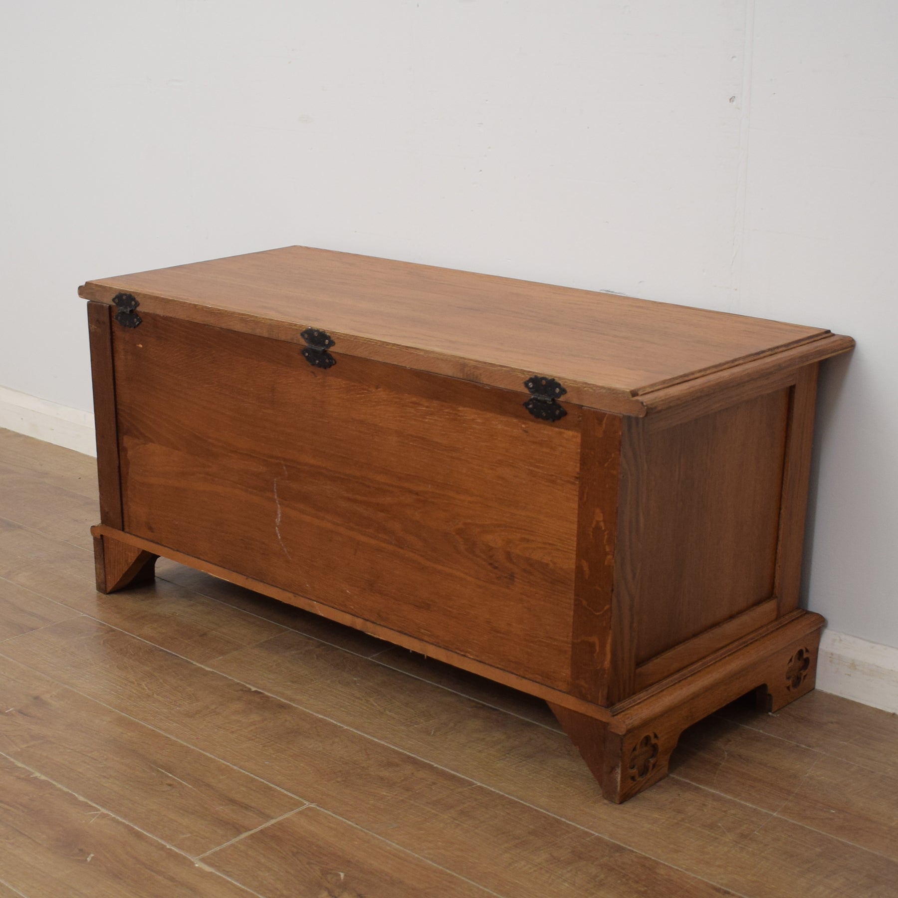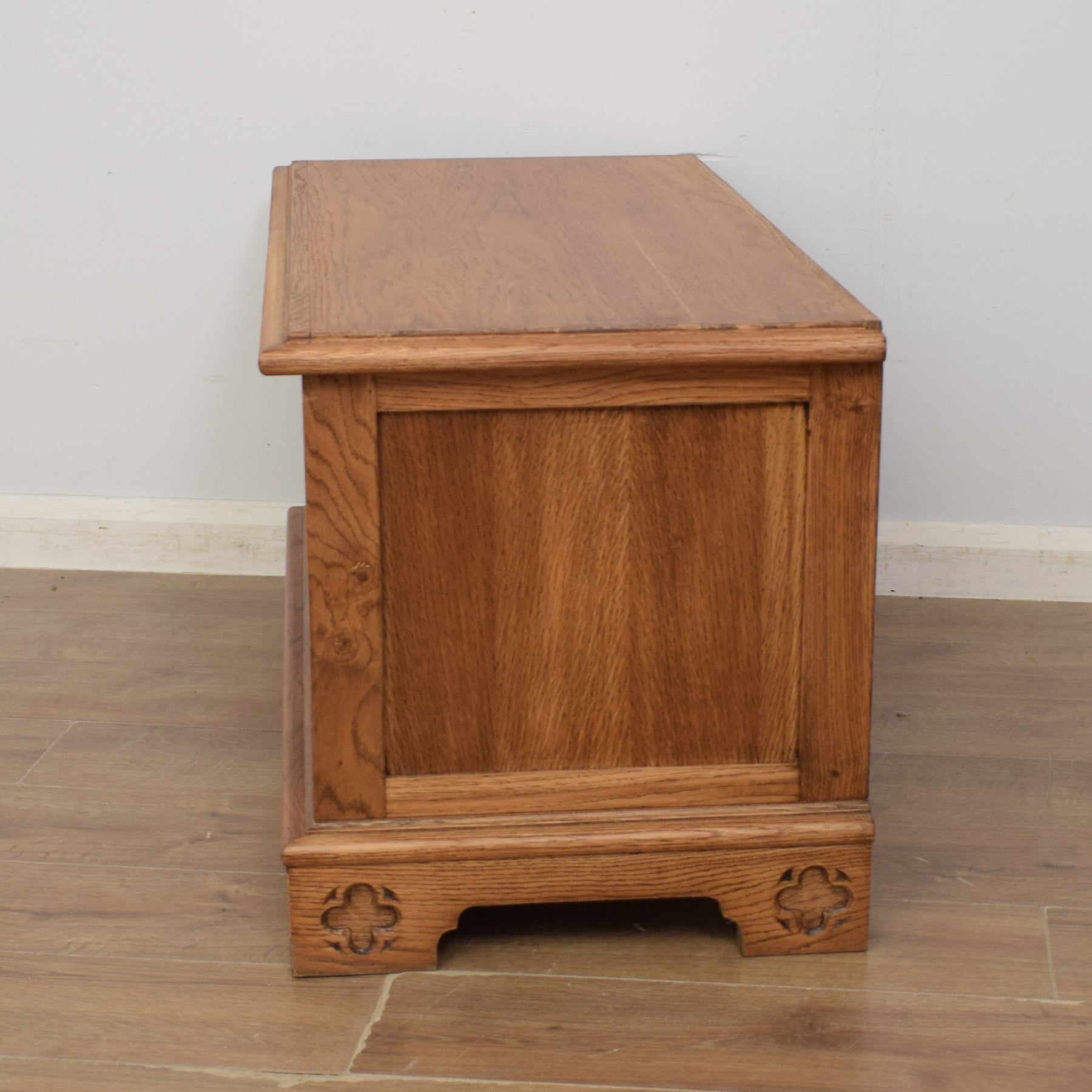 The front of this box has attractive, gothic style carvings and a beautiful oak grain on display. The oak lid opens to reveal a storage compartment that can be used to store spare bedding, toys, games, bags, and boots. There is a small chain to ensure that the lid does not swing over the back of the box when opened. The solid oak construction, combined with the rich medium oak colour and the carved detail gives this box genuine appeal.
