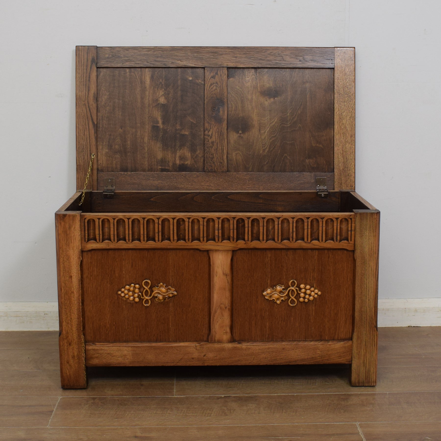 This blanket box features two panels at the front, both of which are adorned with attractive plastic motifs. The lift-up lid reveals a spacious interior and is held open by a metal chain on the left side. The lid is very slightly bowed, meaning that it does not quite make contact with the frame on the left when closed.