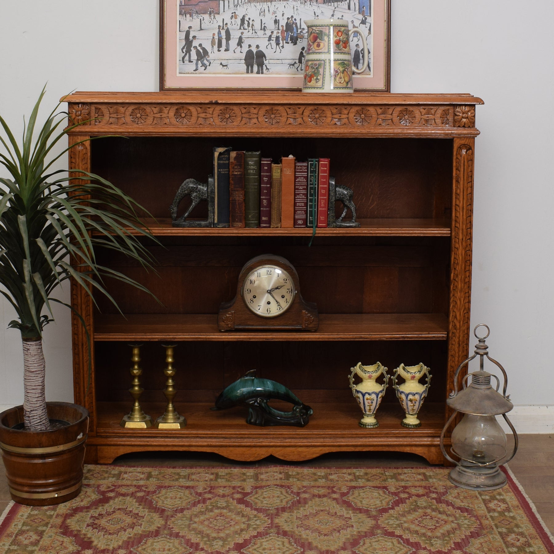 This bookcase features two removable shelves and a base shelf, making it a versatile storage solution. The decorative carved trim along the top and down the sides gives it a touch of classic charm, while the attractive plinth offers a subtle traditional detail. Its sturdy construction ensures durability, and the attractive oak grain adds to the visual appeal.