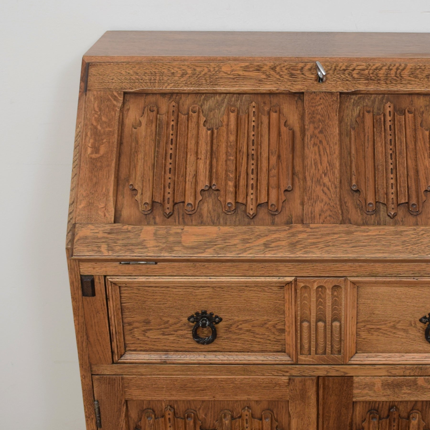 This bureau is made from a mixture of solid oak and veneer panels. The drawer base and back panel are plywood. There is one key provided that locks the main flap. There is a simple mechanism in place which ensures the support arms extend automatically when you open the flap.