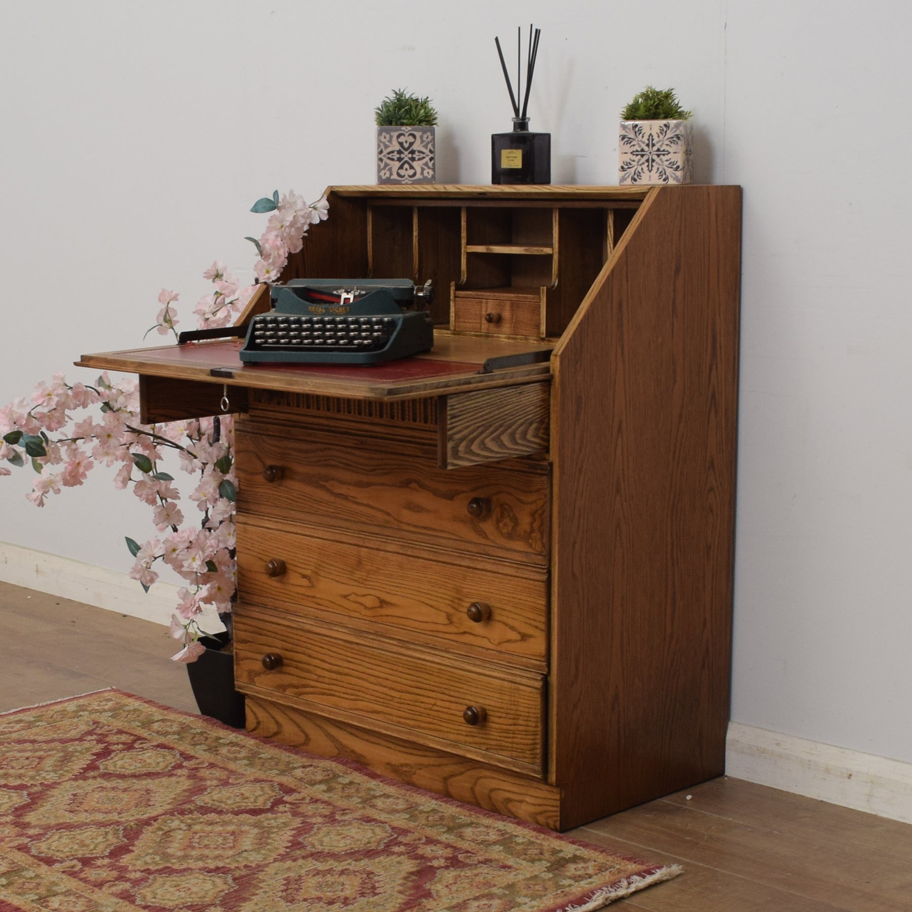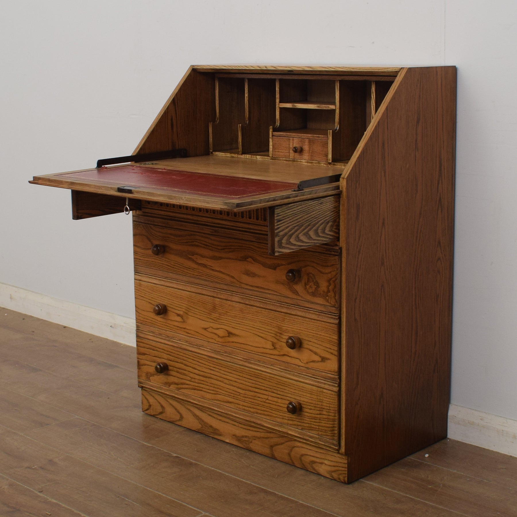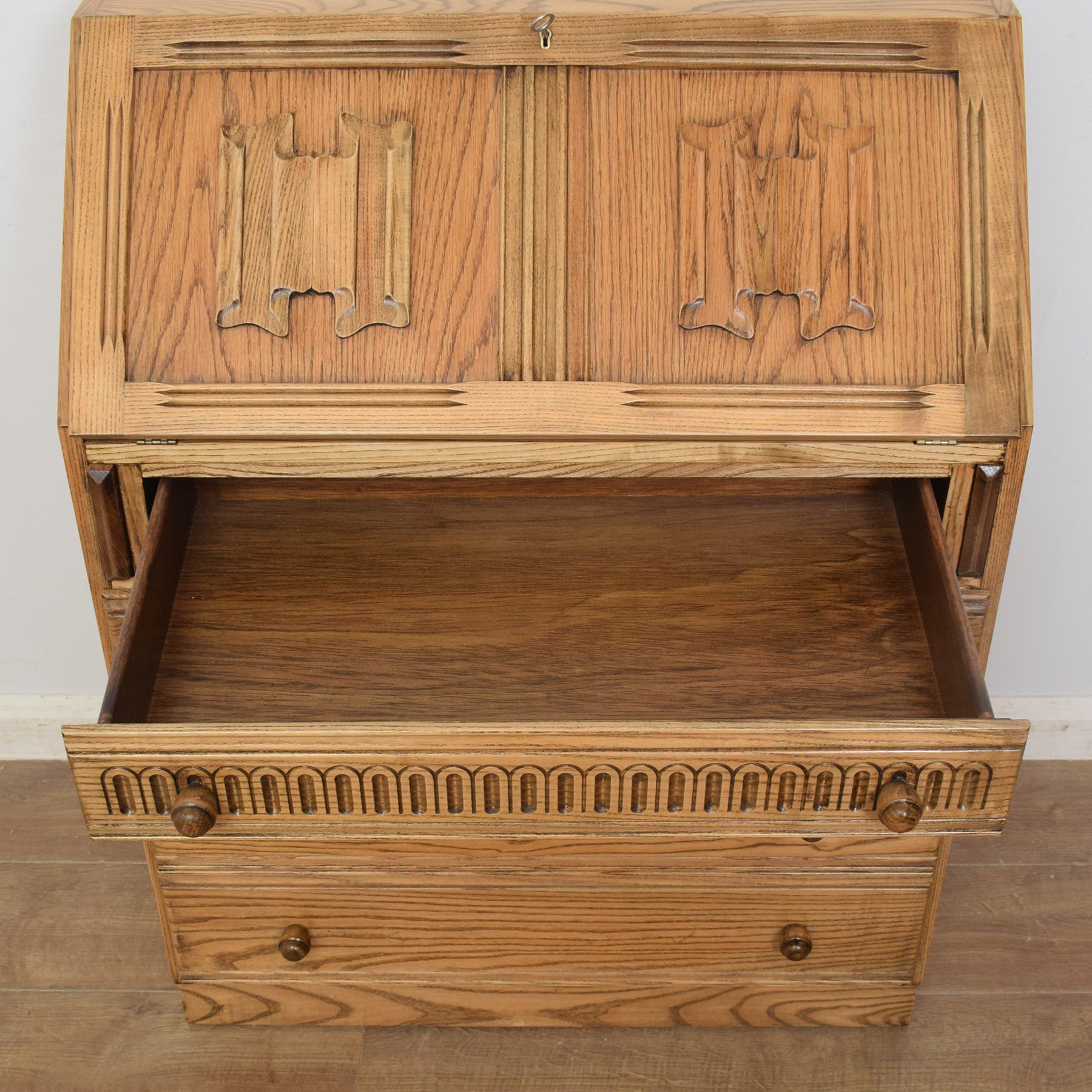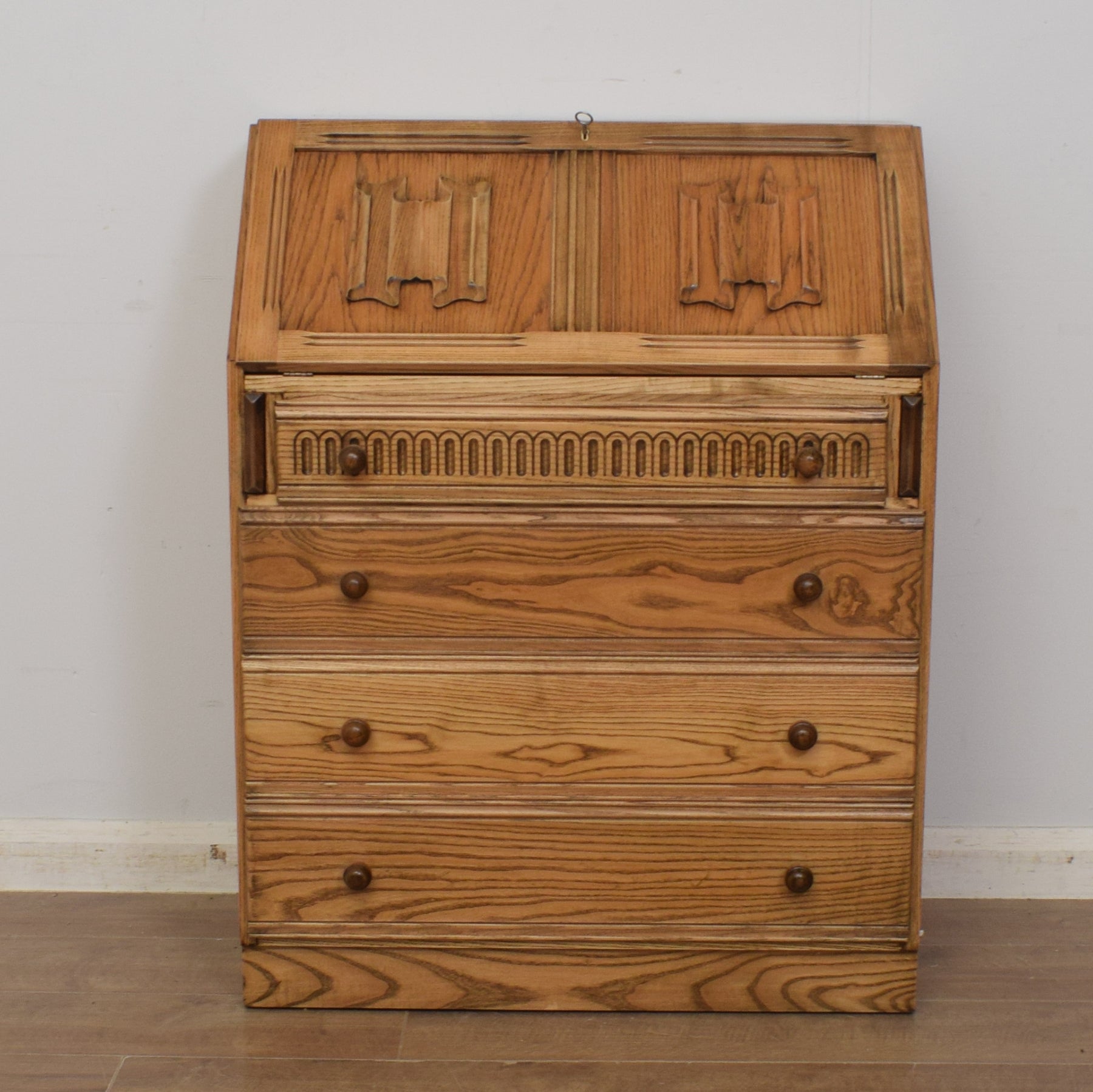 This traditional oak writing bureau would make an attractive and practical addition to the home office, lounge, or other family space.