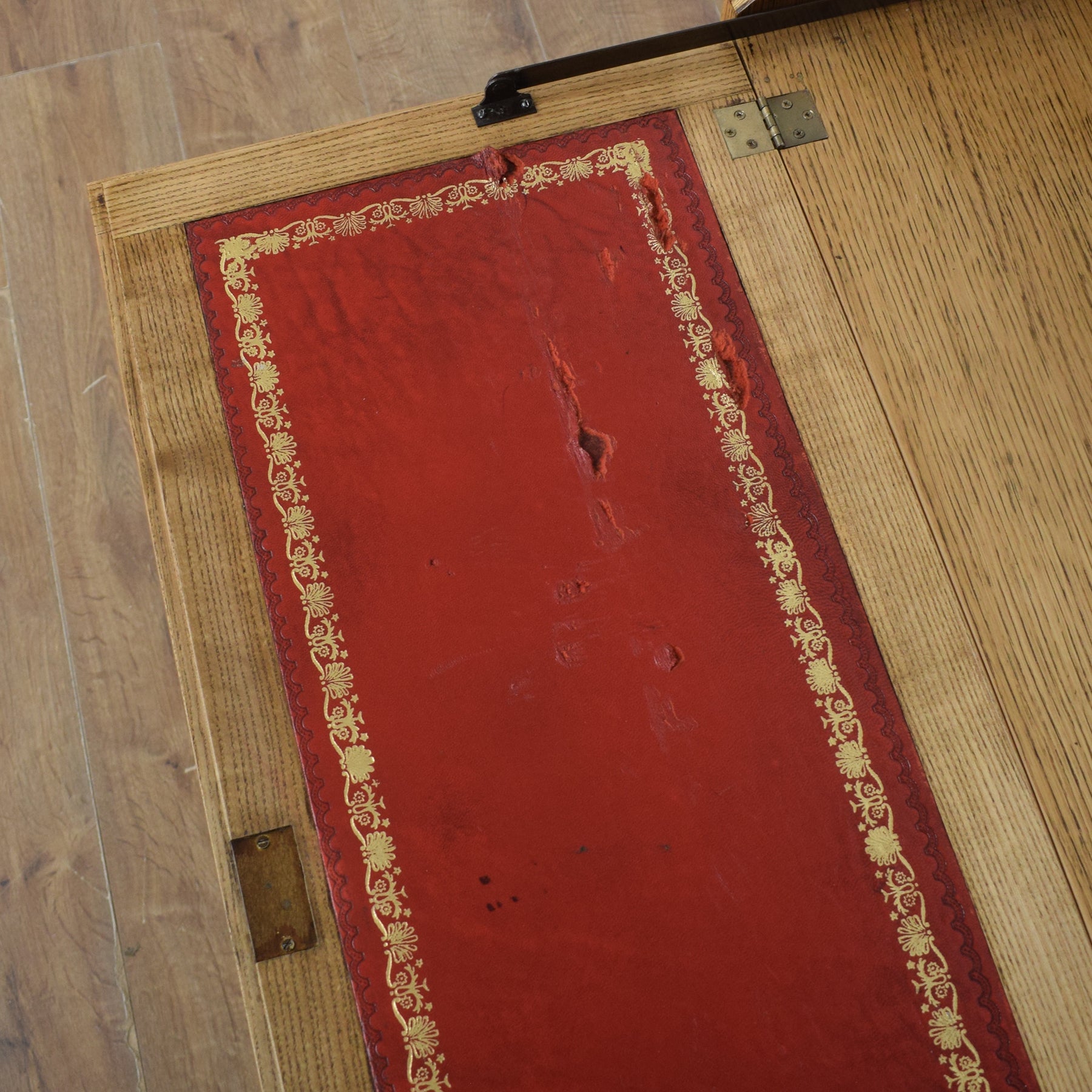 Our restoration team has stripped back by hand the original darker finish before applying a clear lacquer that enhances the natural grain of the wood and provides a good level of protection in everyday use. The dimensions below show the maximum width of this piece. There are signs of wear and tear on the writing pad; this can be seen in the accompanying photographs.