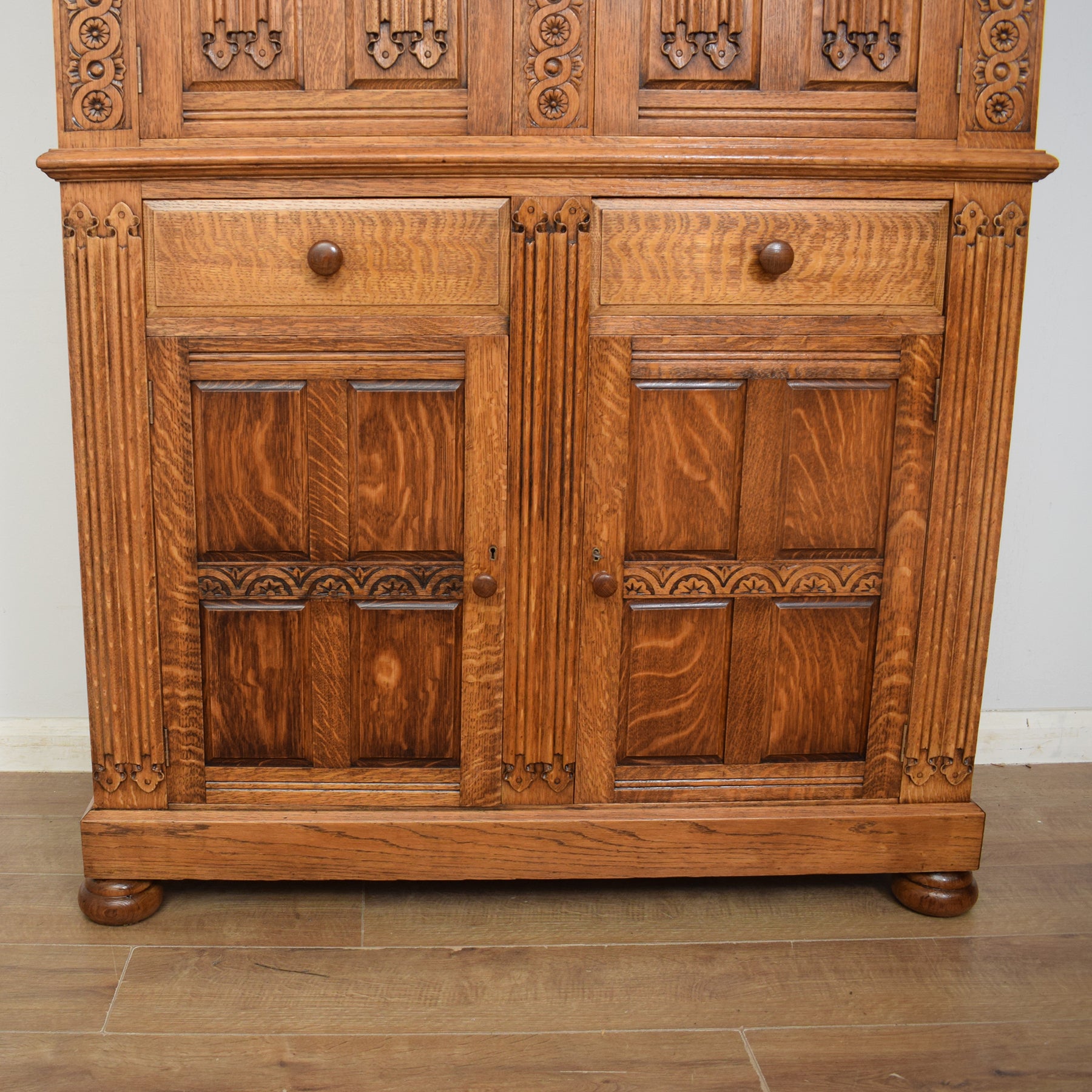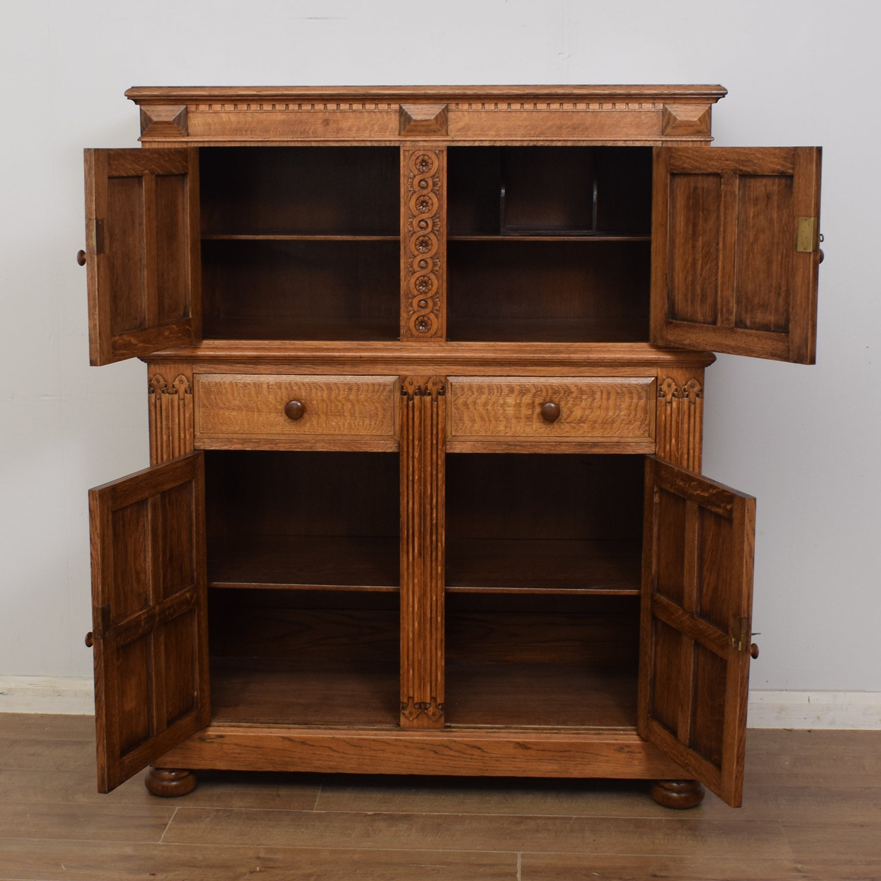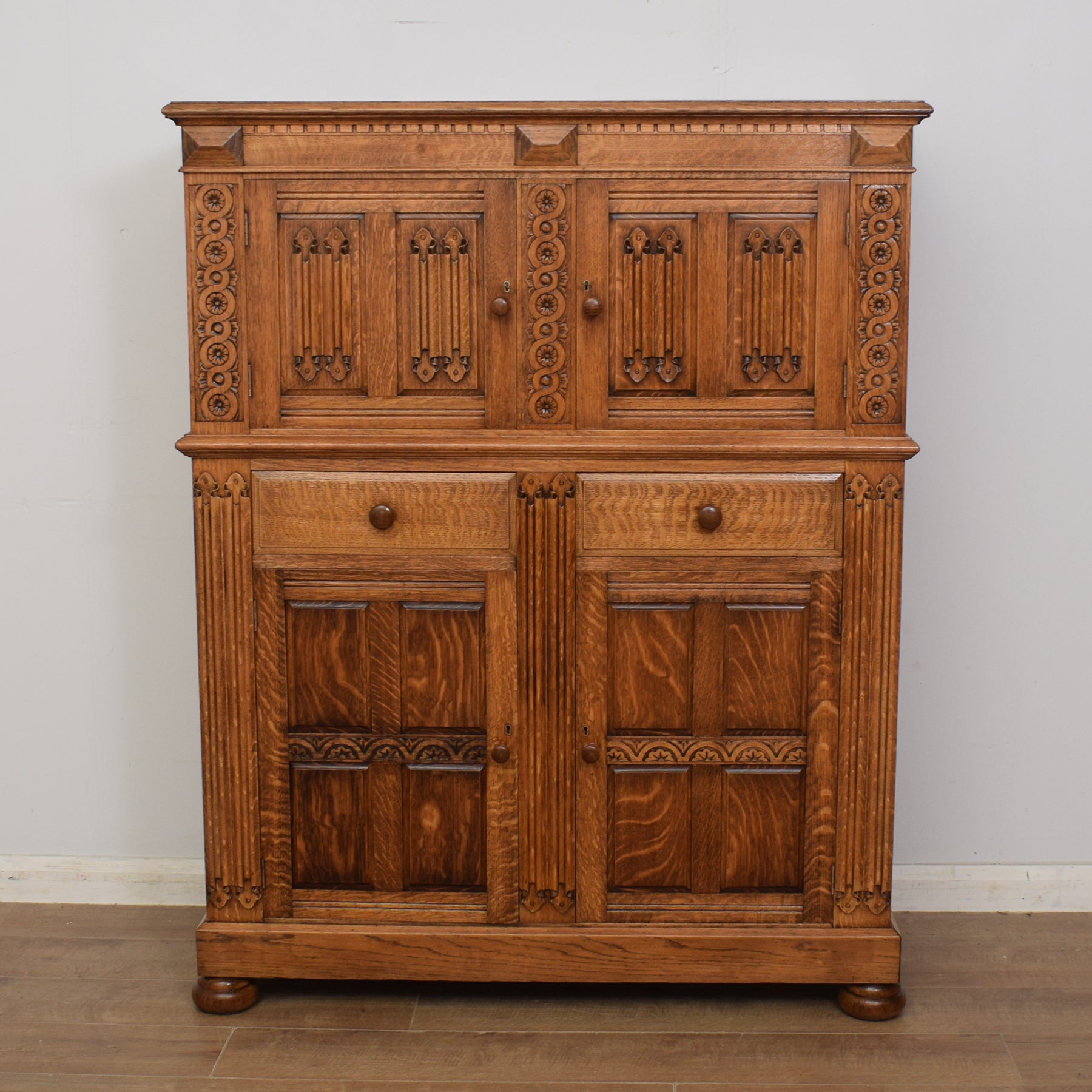 This nicely grained cabinet features linen-fold patterns and carved detail throughout. The upper section is two single cupboards, both with internal shelving and keys which operate the locks smoothly. Below are two more cupboard spaces providing additional storage options. One of the keys operates both the top left and the bottom right locks. There is no key provided for the cupboard door on the bottom to the left.