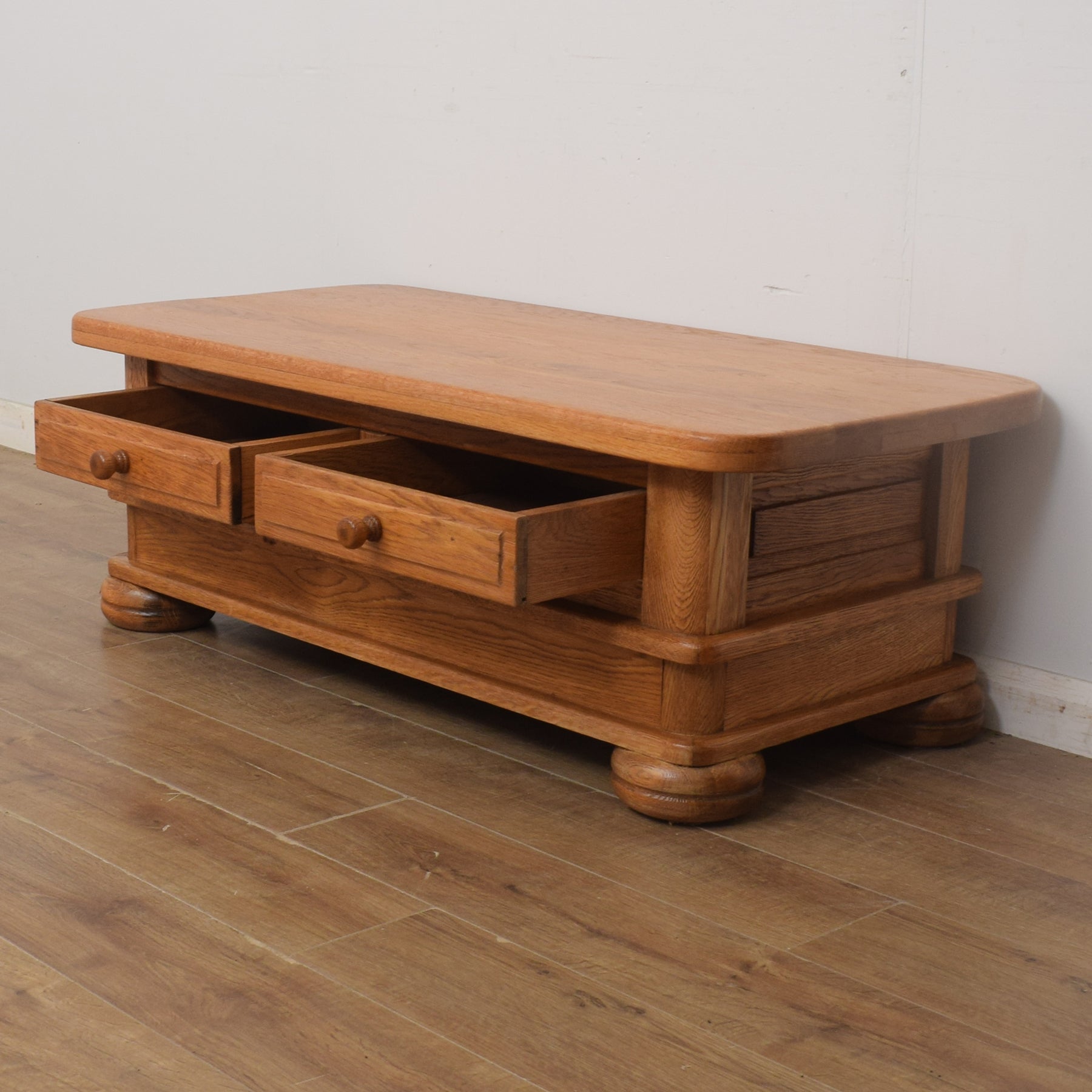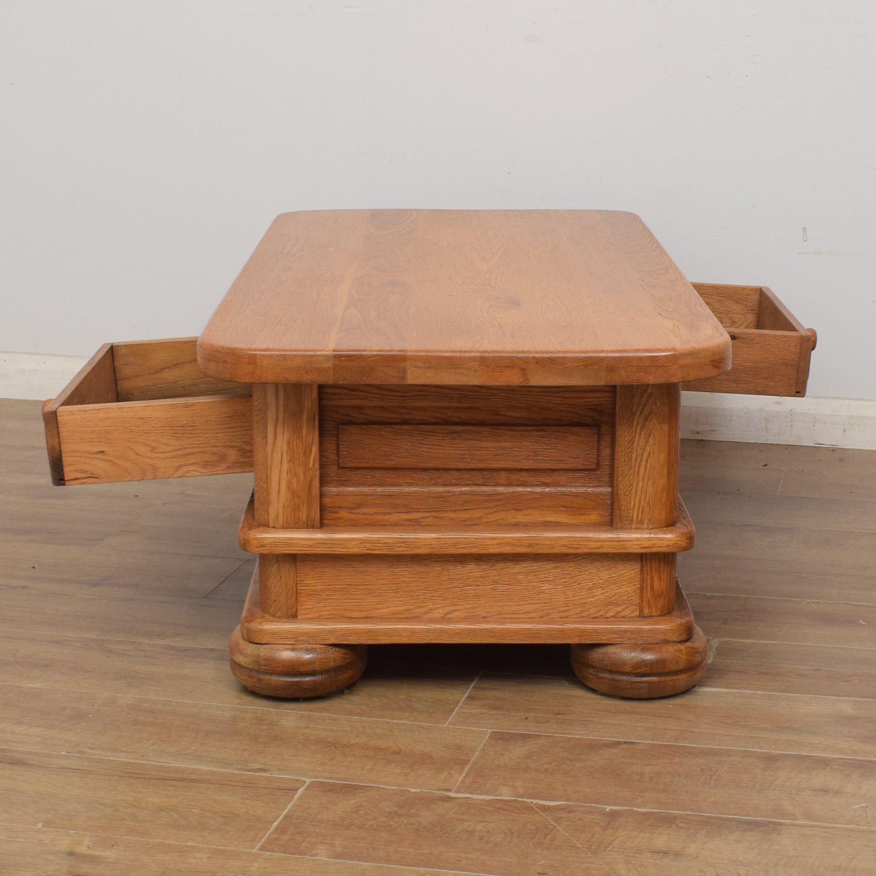 We have stripped this coffee table, by hand, before applying a clear lacquer to accentuate the natural beauty of the oak grain and provide protection. This fabulous coffee table is constructed from solid oak. The drawer bases are plywood.