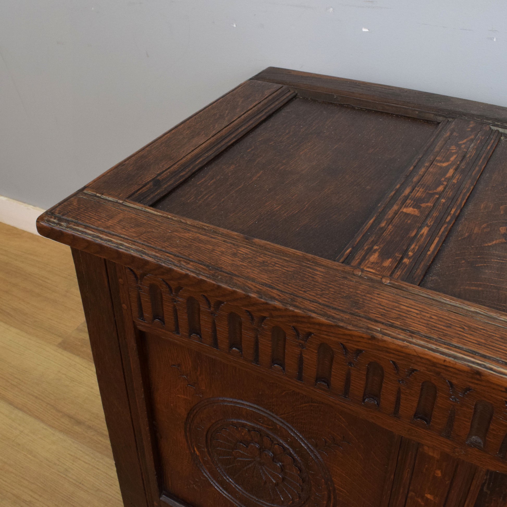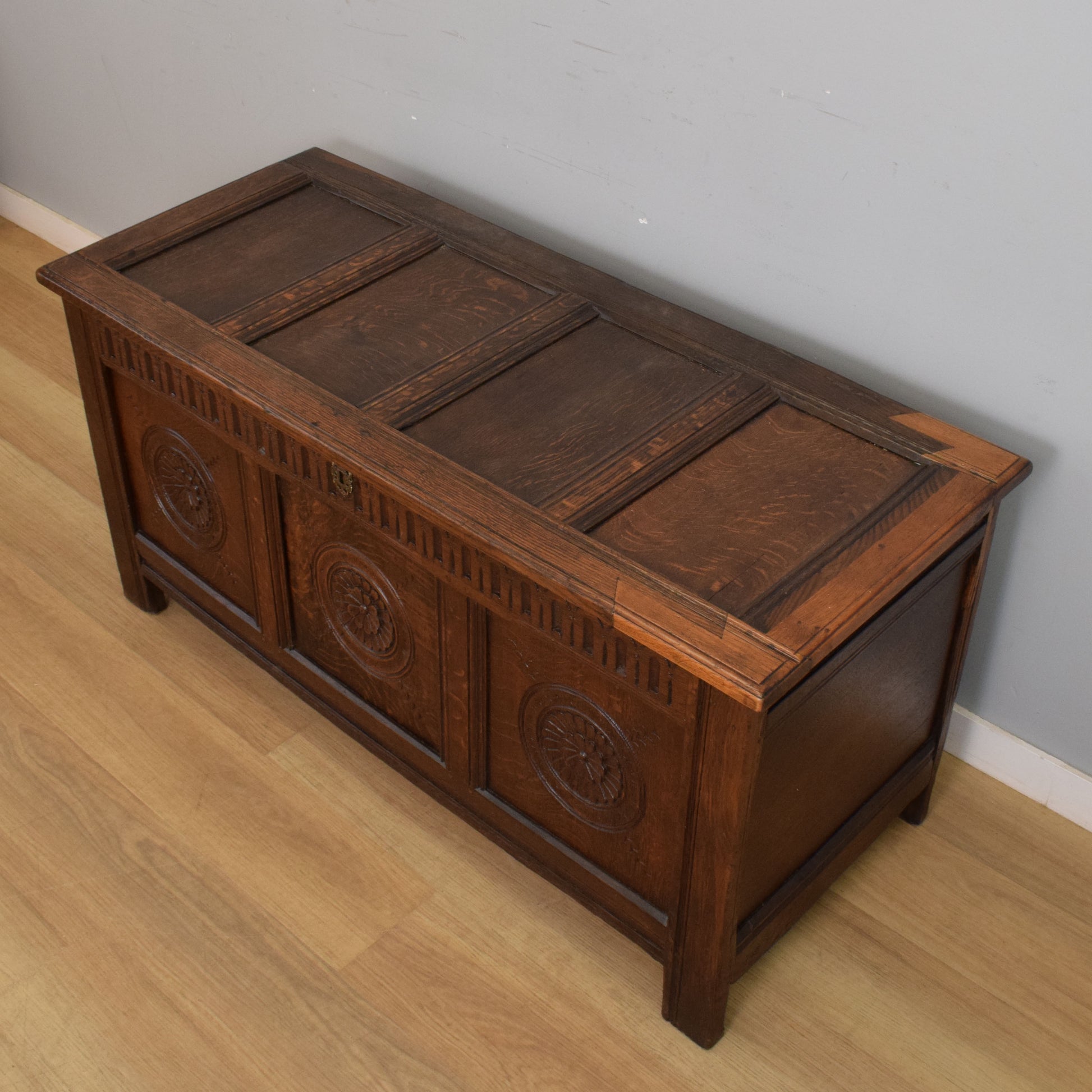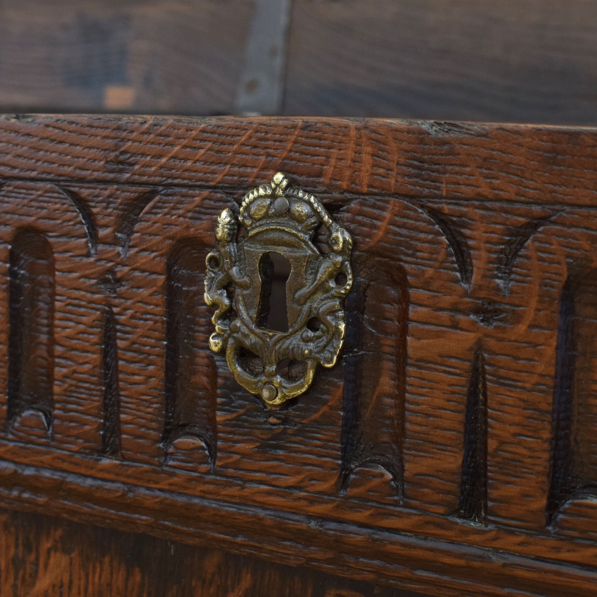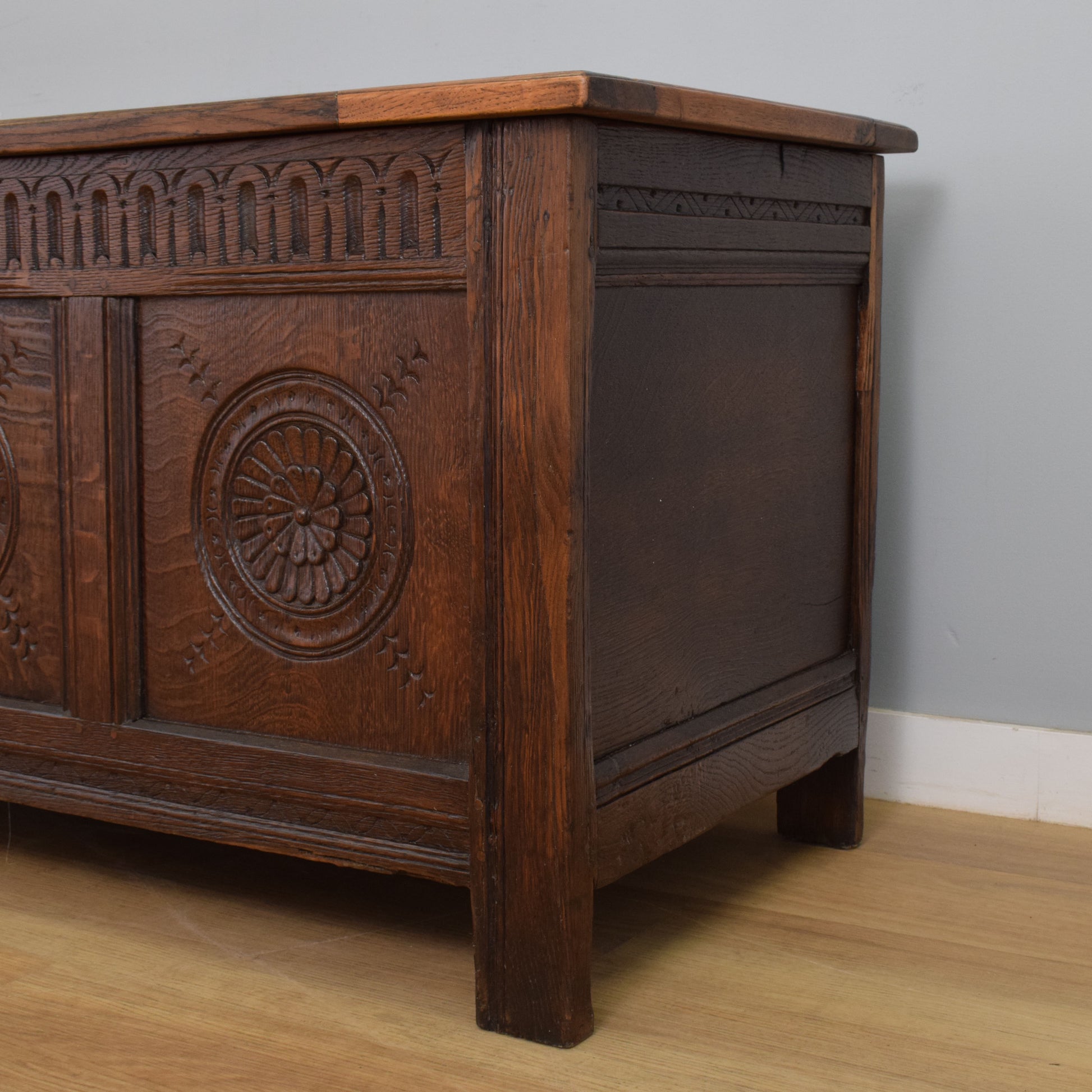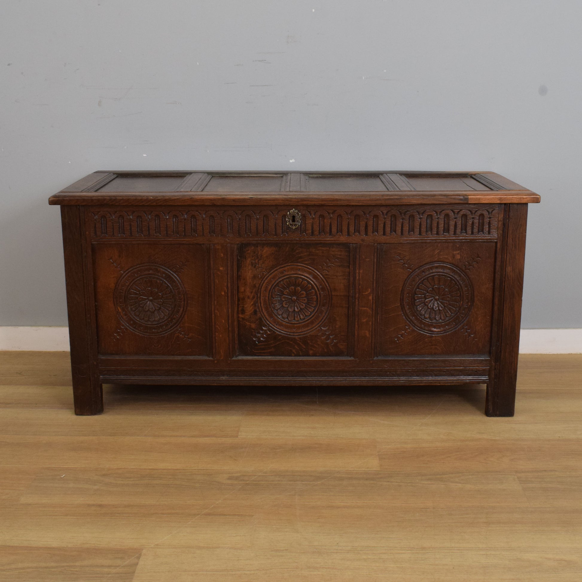 This solid oak coffer features three beautifully carved front panels, each decorated with a circular floral motif and set beneath a hand-carved frieze. The top is panelled in keeping with the period style, and the lid opens on sturdy hinges to reveal a spacious interior with a small compartment to one side. The ornate brass escutcheon and rich patina enhance the coffer's aged, rustic charm, making it both functional and full of character.