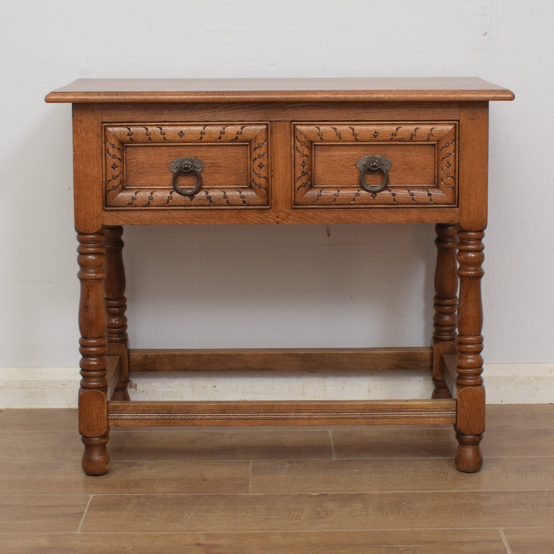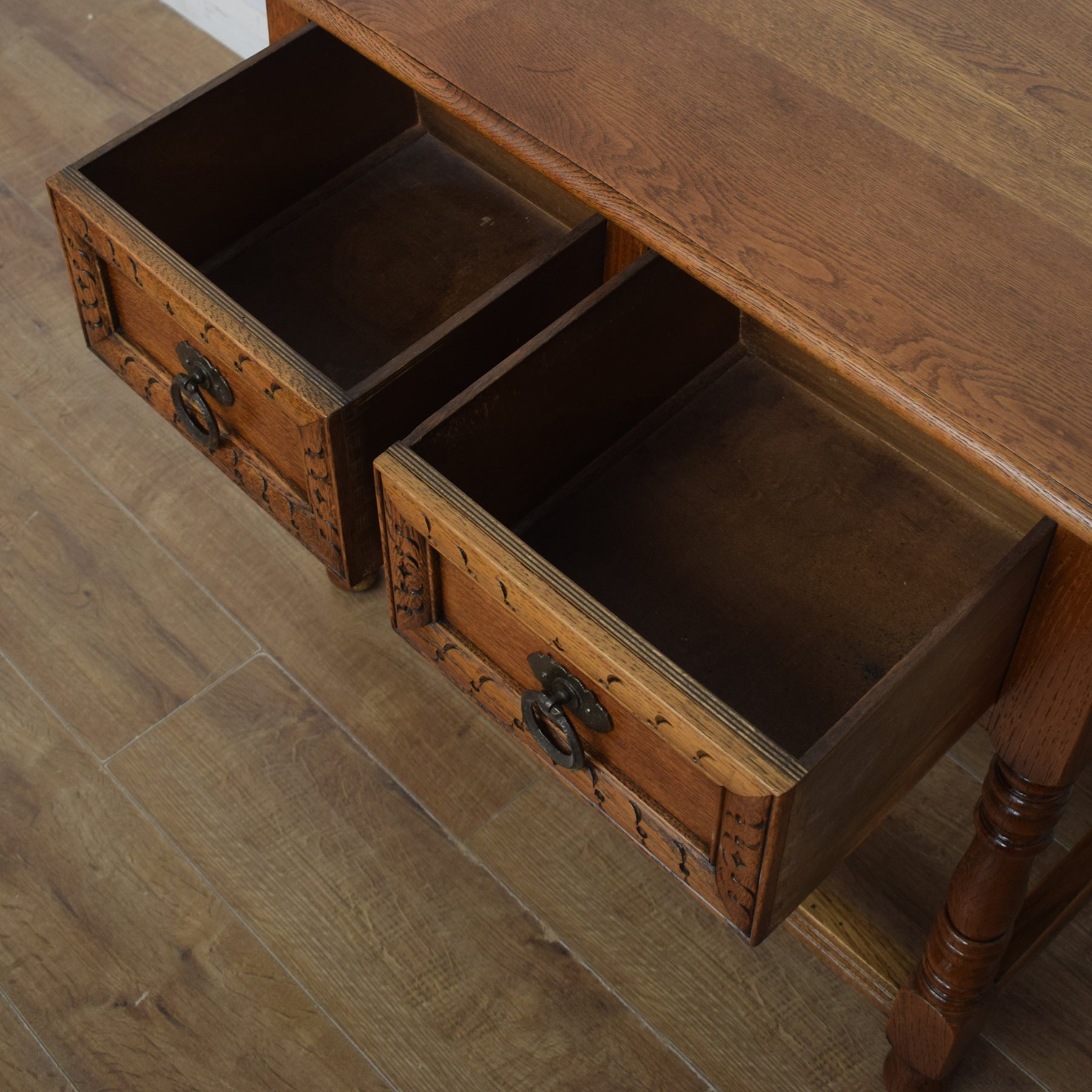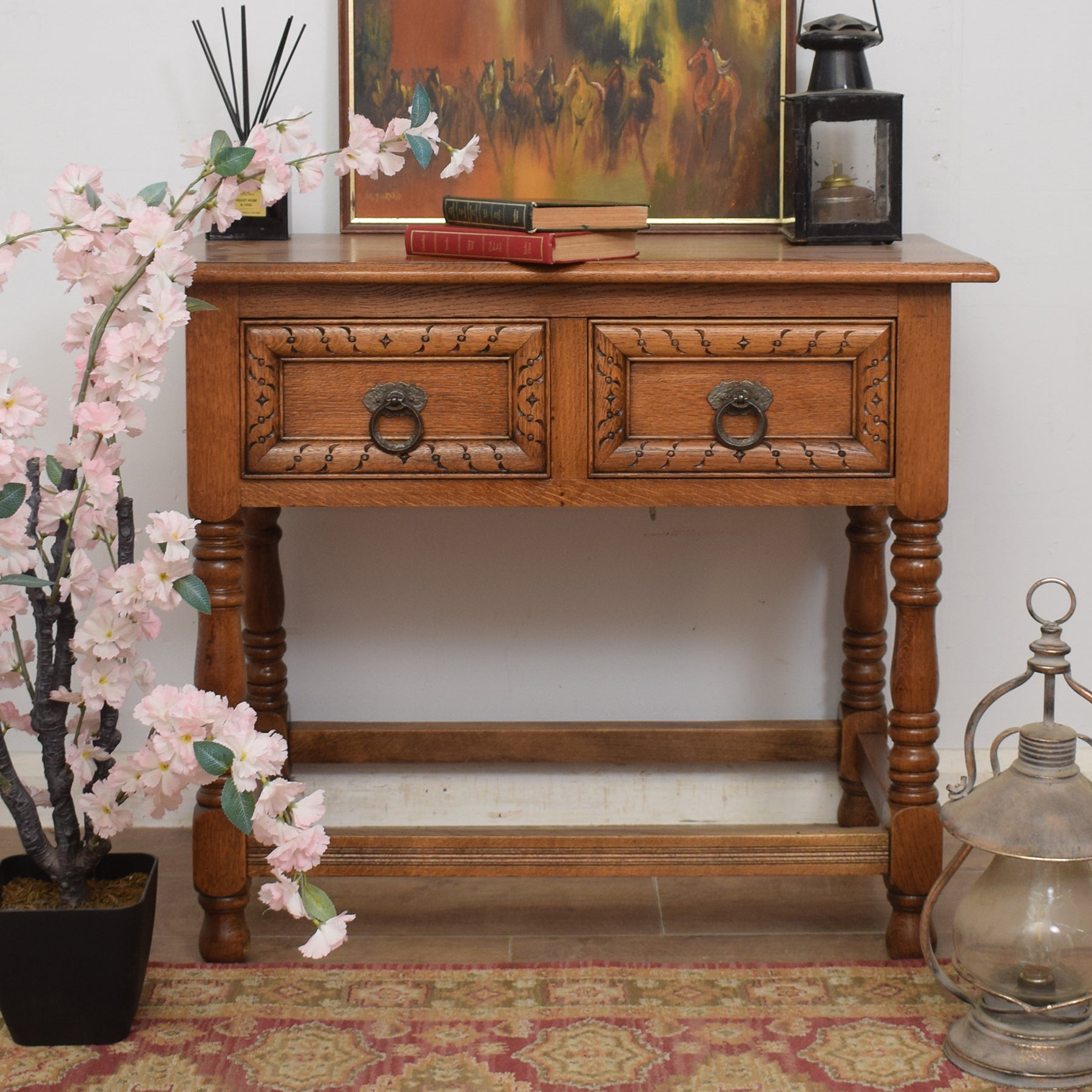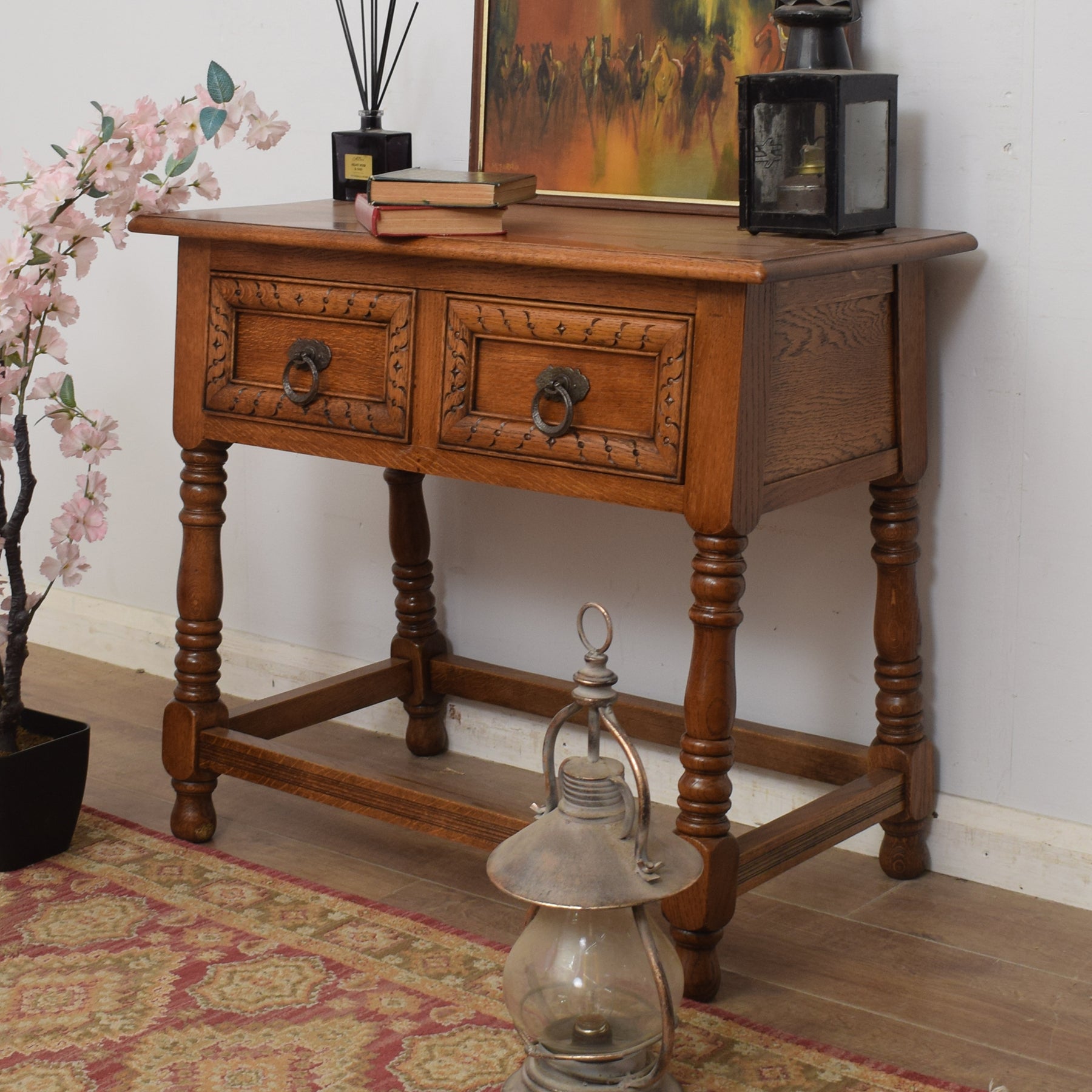 We have restored this console table by removing the previous, darker stain to reveal the natural wood underneath. We have then applied a clear lacquer that not only accentuates the beauty of the oak grain but also provides a protective finish that will keep this item looking its best for many years to come. This console table is constructed from a mixture of solid oak and oak veneer. The drawer bases are plywood.