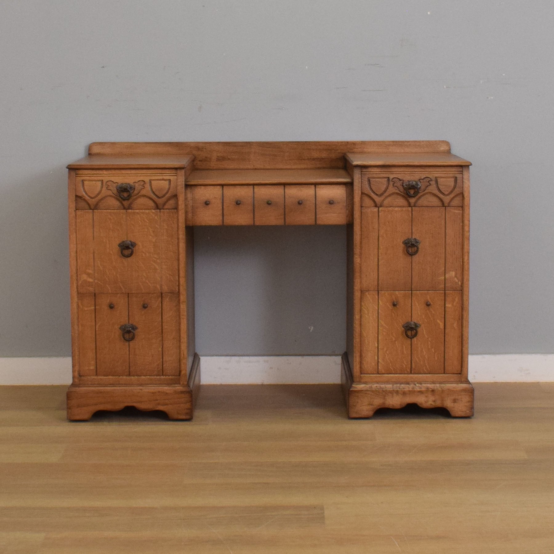 This is a handsome pedestal desk with a solid top, a raised back edge, and a well-balanced shape that gives it a practical yet traditional look. The carved drawer fronts, dark metal ring handles, and panelled detailing add plenty of period charm, while the central drawer and pedestal storage provide good everyday usefulness. Its proportions make it a particularly appealing piece for writing, laptop use, or as a decorative desk.