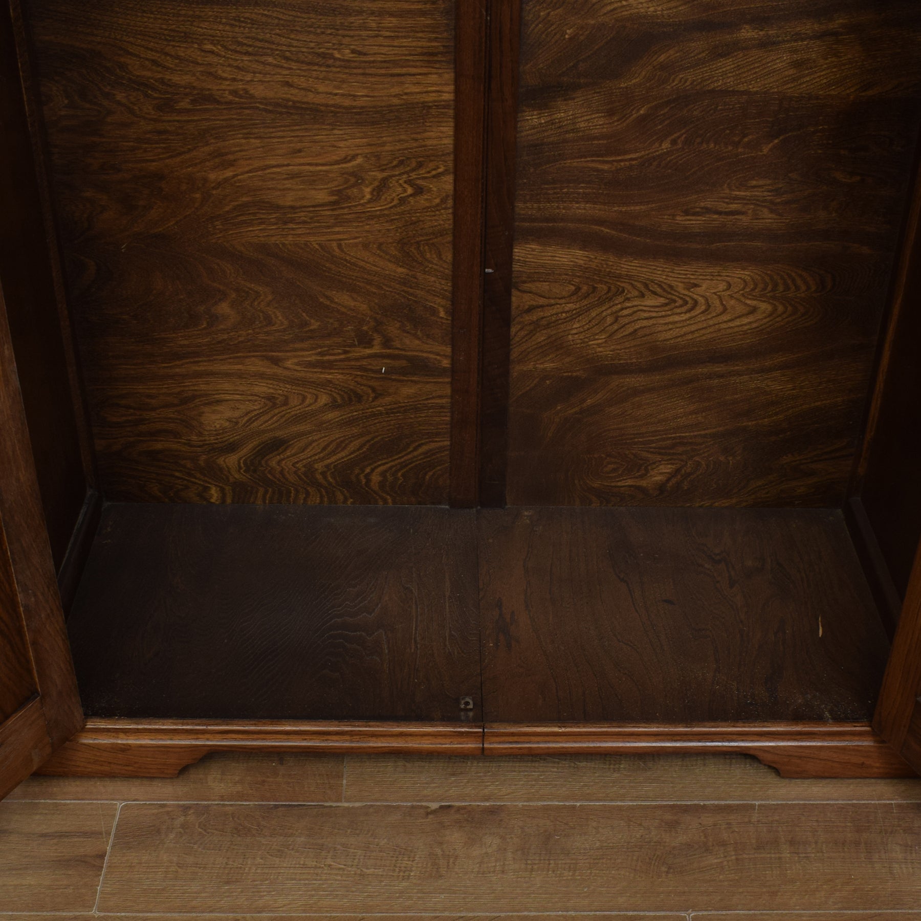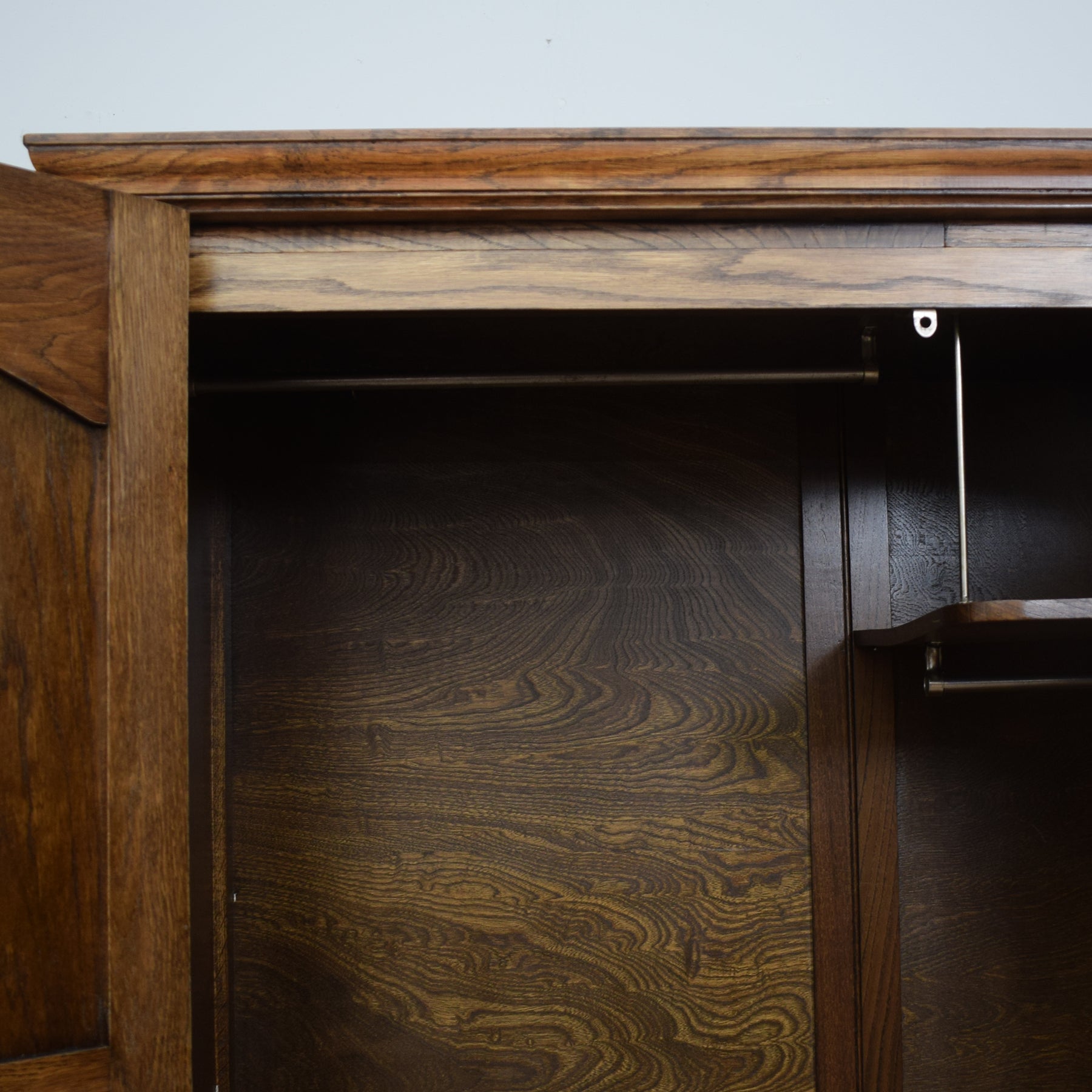 We have lovingly restored this item in one of our workshops by stripping off the old, darker finish to reveal the beautiful grain underneath. We then applied a clear matt lacquer which allows you to enjoy the beautiful grain of the wood in the knowledge that the wood is protected and durable. The wardrobe is made from a mixture of woods with some solid oak and some veneer panels. The back is plywood.